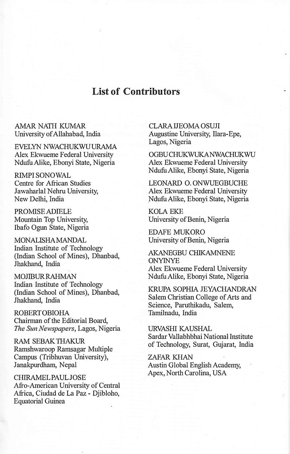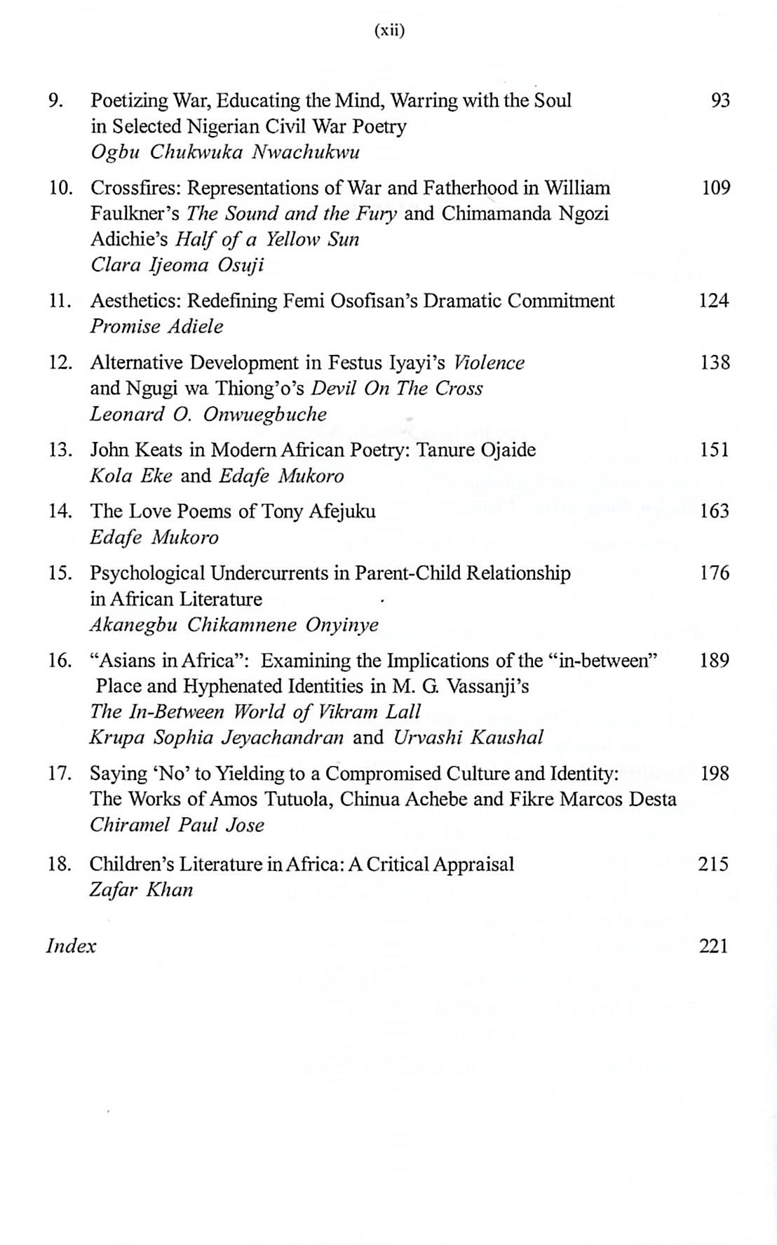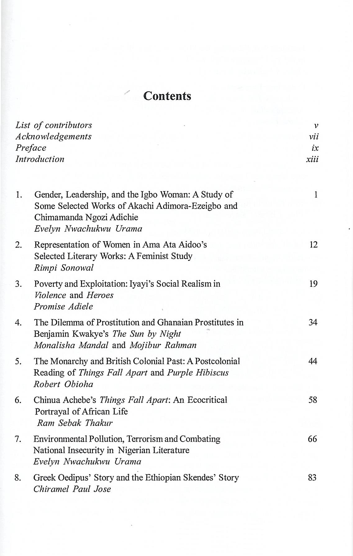 The Companion consists of eighteen chapters on myth, spirituality, aesthetics, gender issues, social and cultural identity, psychological undercurrents, war, terrorism, political leadership, national insecurity, environmental pollution, human trafficking, prostitution, postcolonialism, ecocriticism, comparative literature, children’s literature, etc. An attempt has been made to discuss most of the issues that are sought after by the students and researchers of African literature.