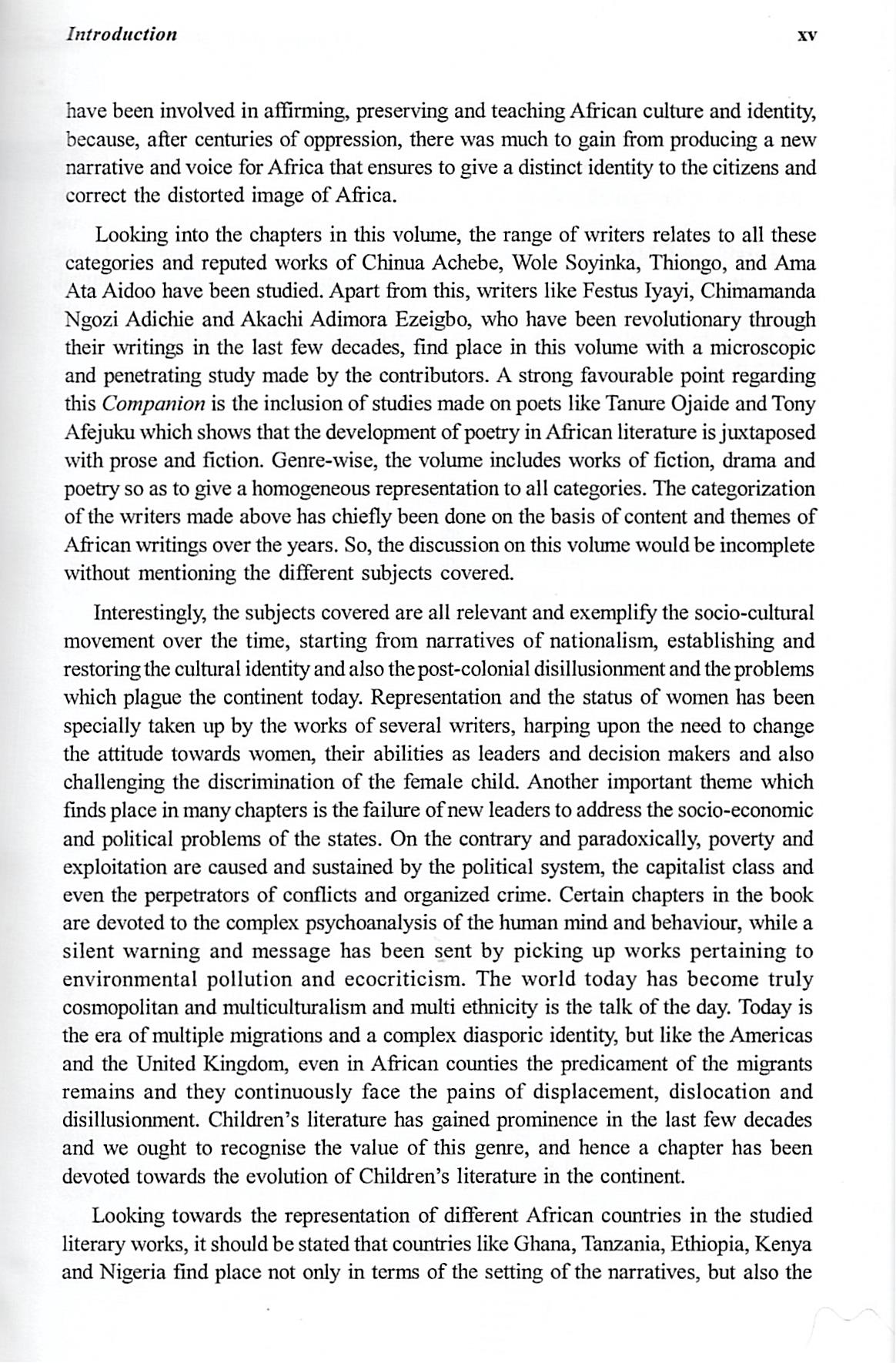 It provides an essential guide to the texts and contexts including cultural and ideological ones. Most of the chapters have been contributed by African scholars which is the hallmark of the book.
