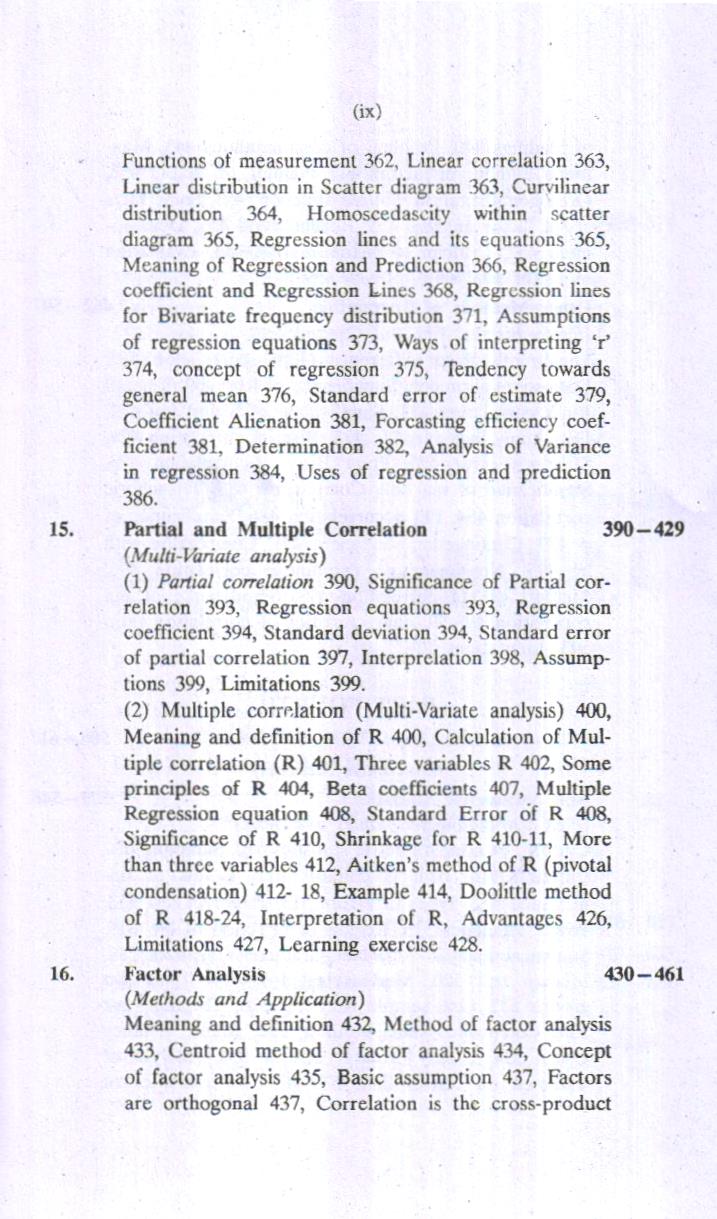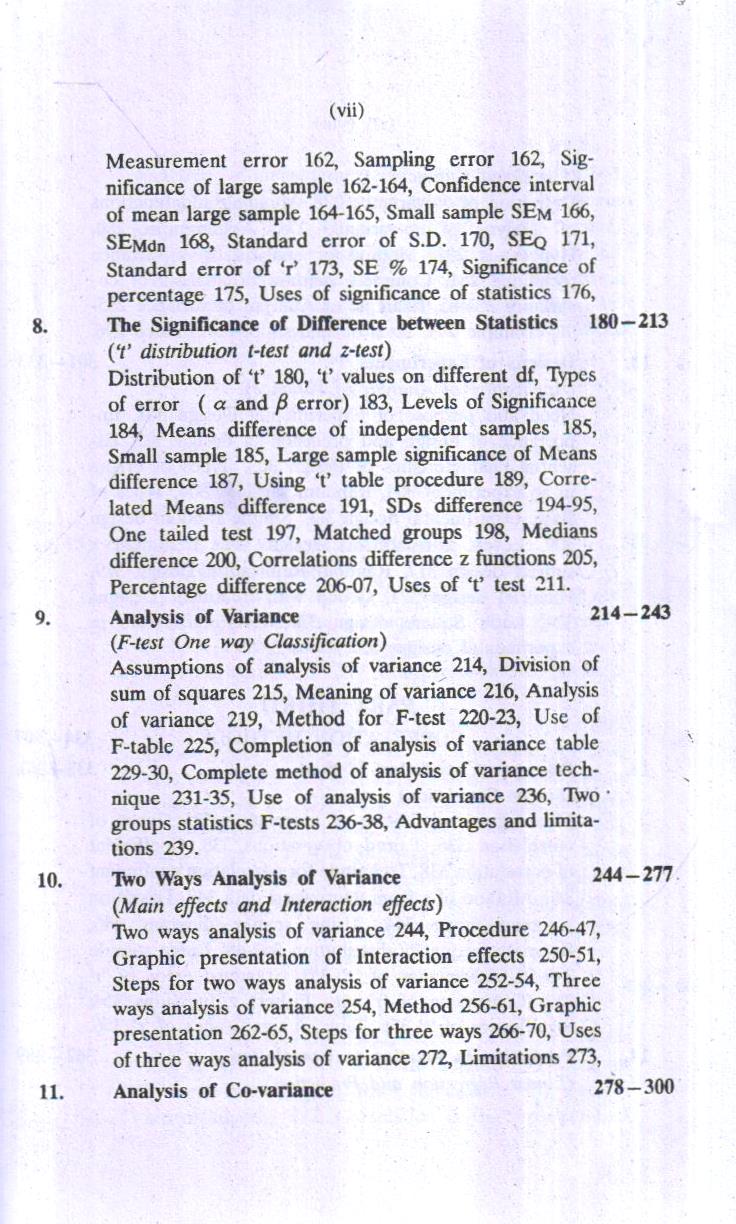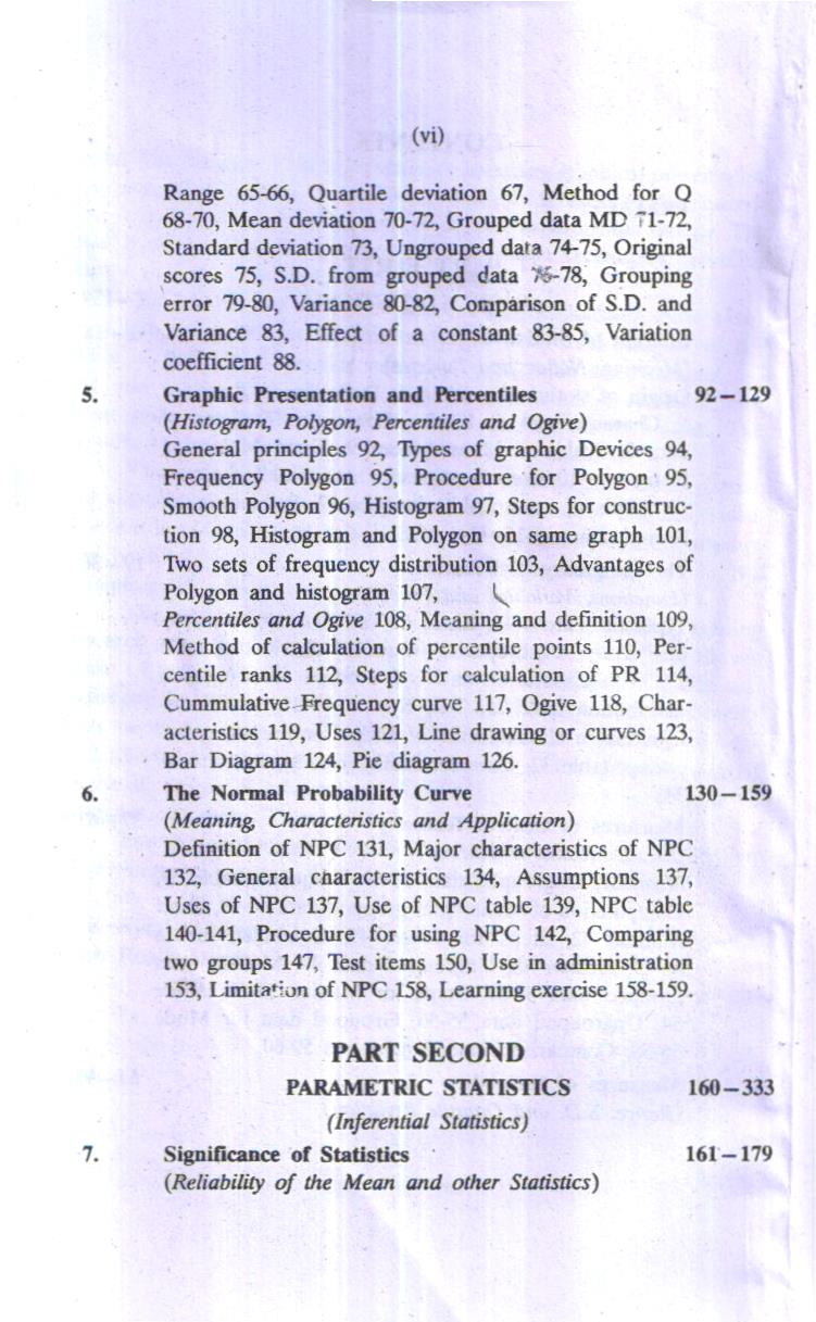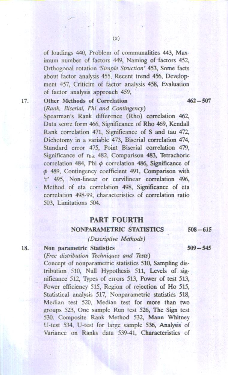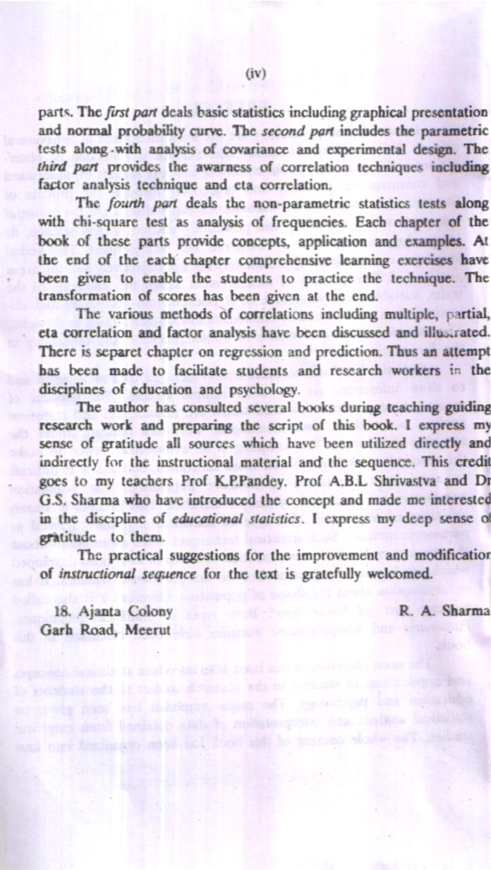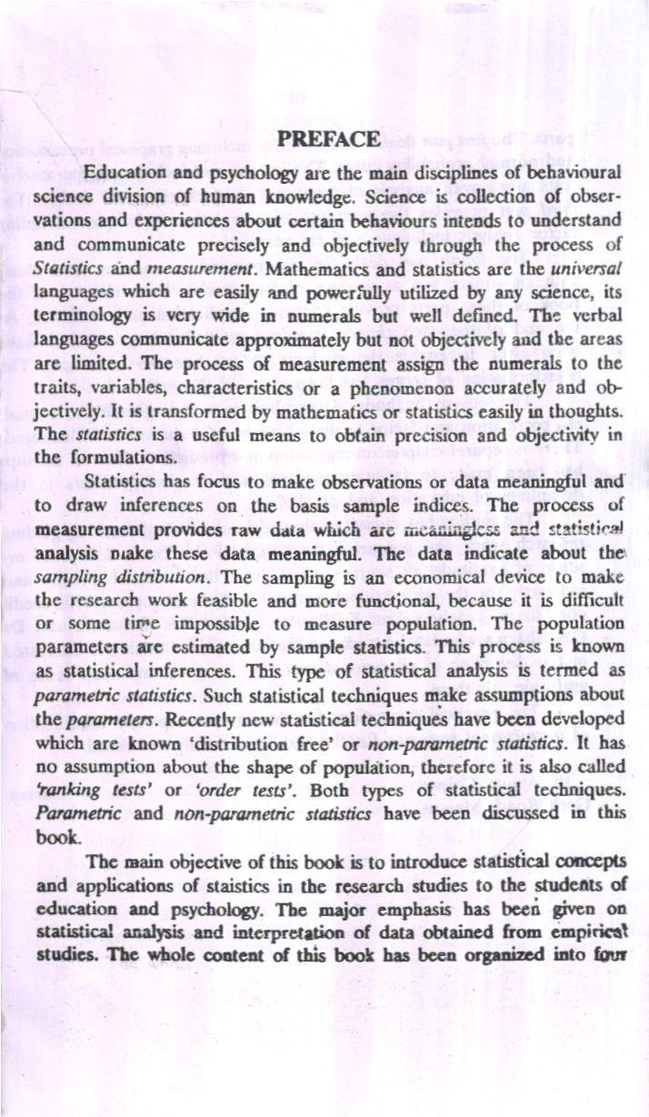 Statistics has focus to make observations or data meaningful and to draw inferences on the basis sample indices. The process of measurement provides raw data which are meaningless and statistical analysis make these data meaningful. The data indicate about the sampling distribution. The sampling is an economical device to make the research work feasible and more functional, because it is difficult or some tire impossible to measure population. The population parameters are estimated by sample statistics. This process is known as statistical inferences. This type of statistical analysis is termed as parametric statistics. Such statistical techniques make assumptions about the parameters. Recently new statistical techniques have been developed which are known ‘distribution free’ or non-parametric statistics. It has no assumption about the shape of population, therefore it is also called ranking tests’ or ‘order tests’. Both types of statistical techniques. Parametric and non-parametric statistics have been discussed in this book.
