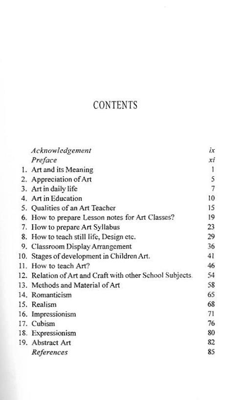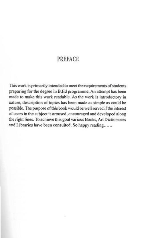 This work is primarily intended to meet the requirements of students preparing for the degree in B.Ed programme. An attempt has been made to make this work readable. As the work is introductory in nature, the description of topics has been made as simple as possible. The purpose of this book would be well served if the interest of users in the subject is aroused, encouraged and developed along the right lines. To achieve this goal various Books, Art Dictionaries and Libraries have been consulted. So happy reading.