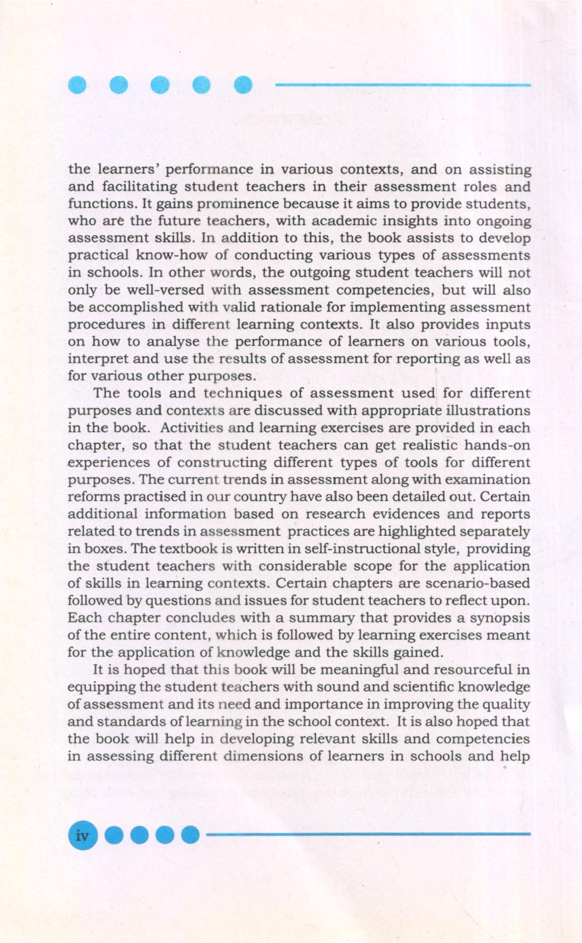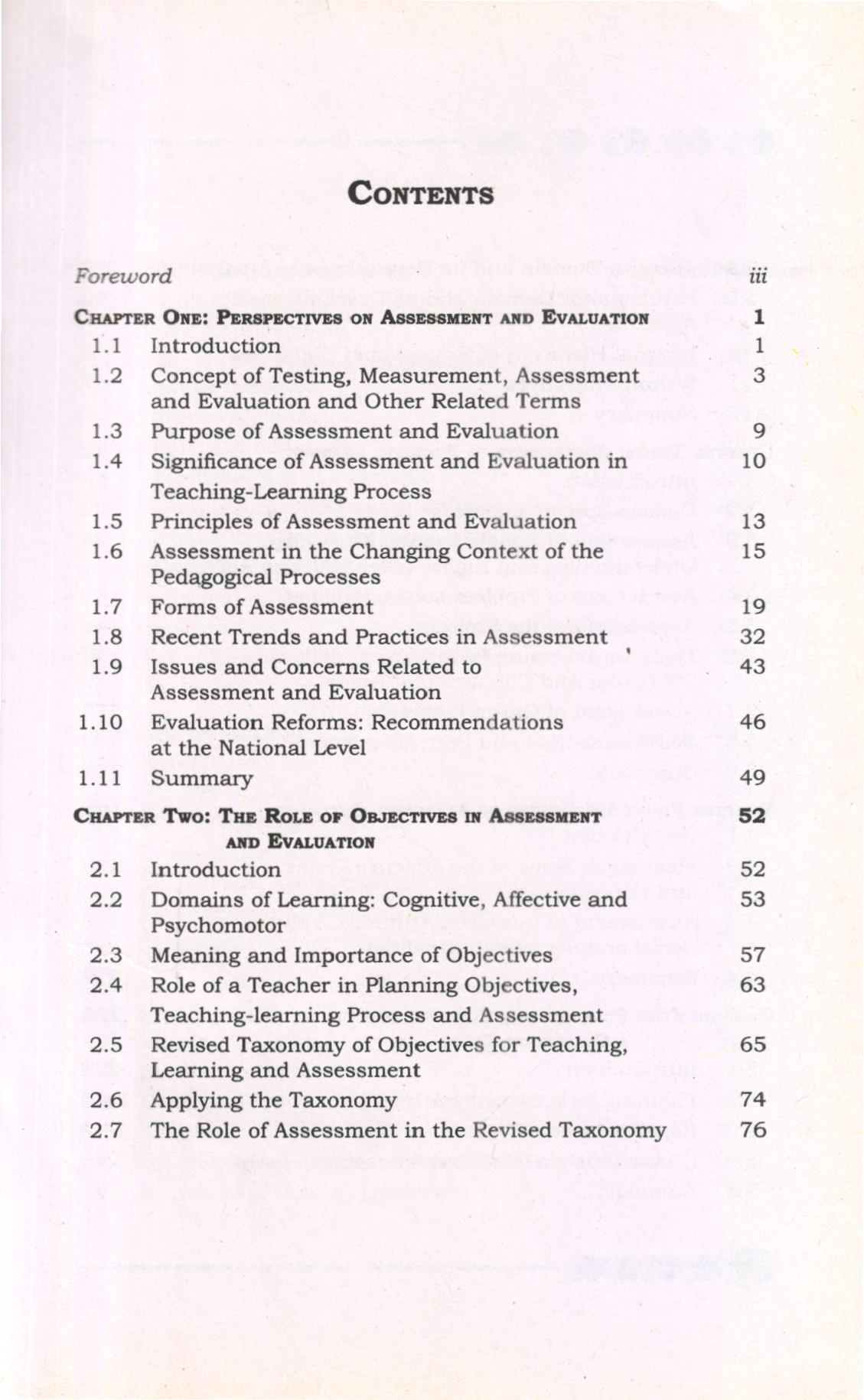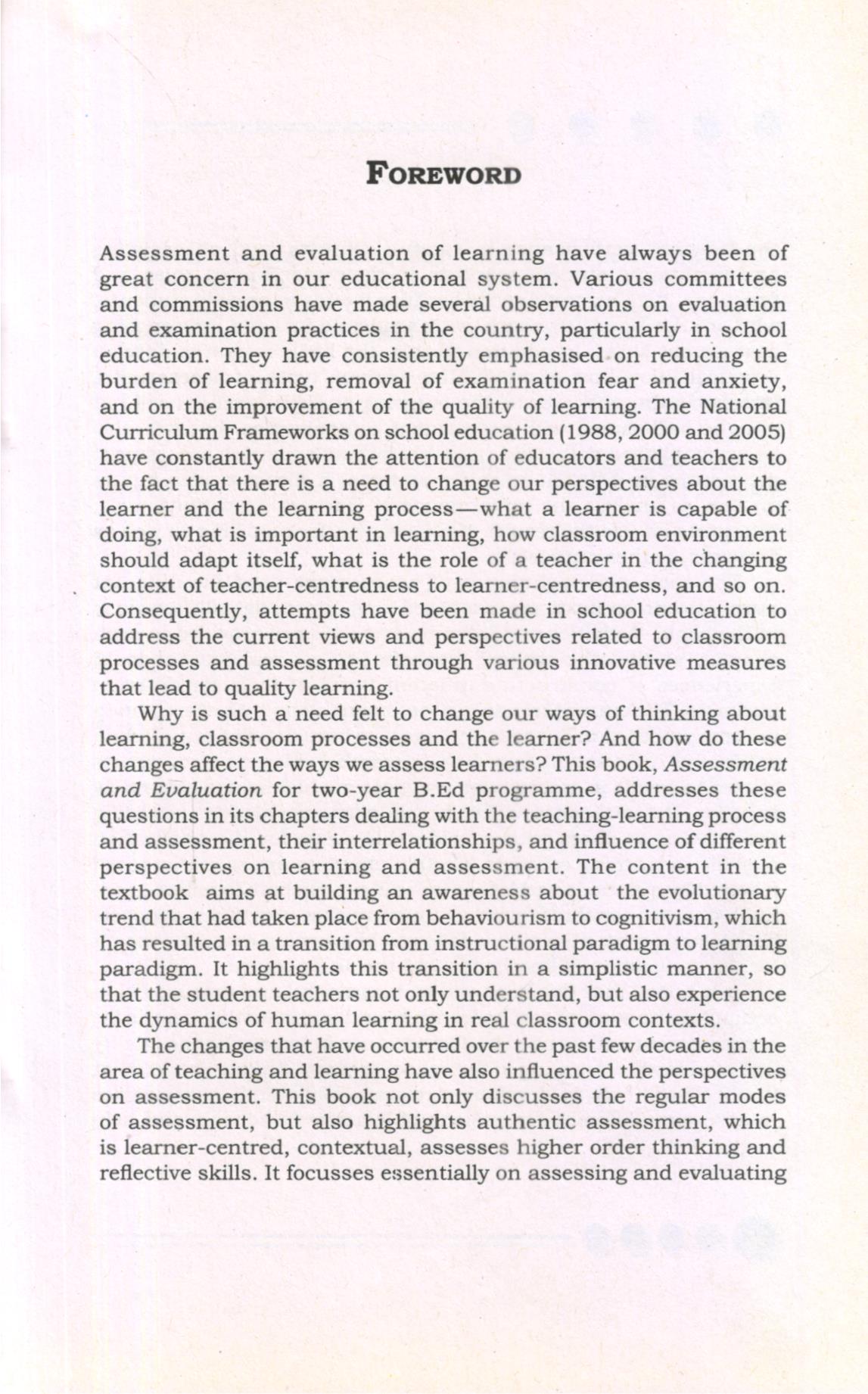 Assessment and evaluation of learning have always been of great concern in our educational system. Various committees and commissions have made several observations on evaluation and examination practices in the country, particularly in school education. They have consistently emphasised on reducing the burden of learning, removal of examination fear and anxiety, and on the improvement of the quality of learning. The National Curriculum Frameworks on school education (1988, 2000 and 2005) have constantly drawn the attention of educators and teachers to the fact that there is a need to change our perspectives about the learner and the learning process-what a learner is capable of doing, what is important in learning, how classroom environment should adapt itself, what is the role of a teacher in the changing context of teacher-centredness to learner-centredness, and so on. Consequently, attempts have been made in school education to address the current views and perspectives related to classroom processes and assessment through various innovative measures that lead to quality learning.