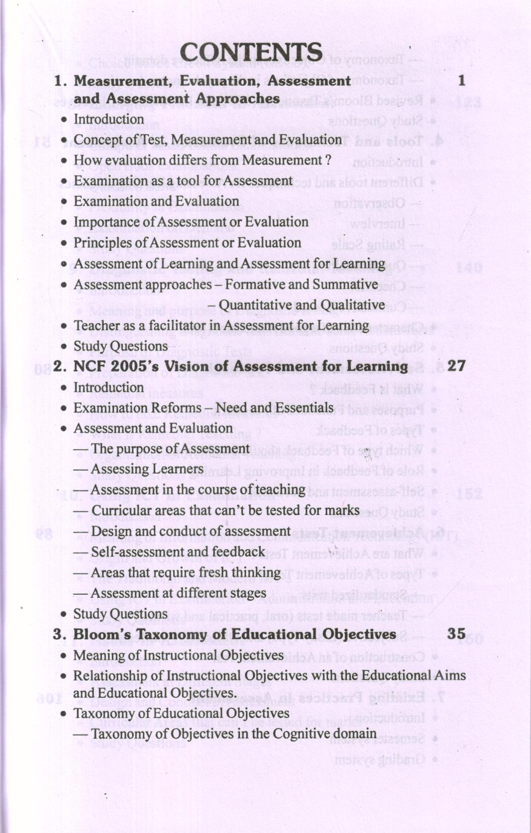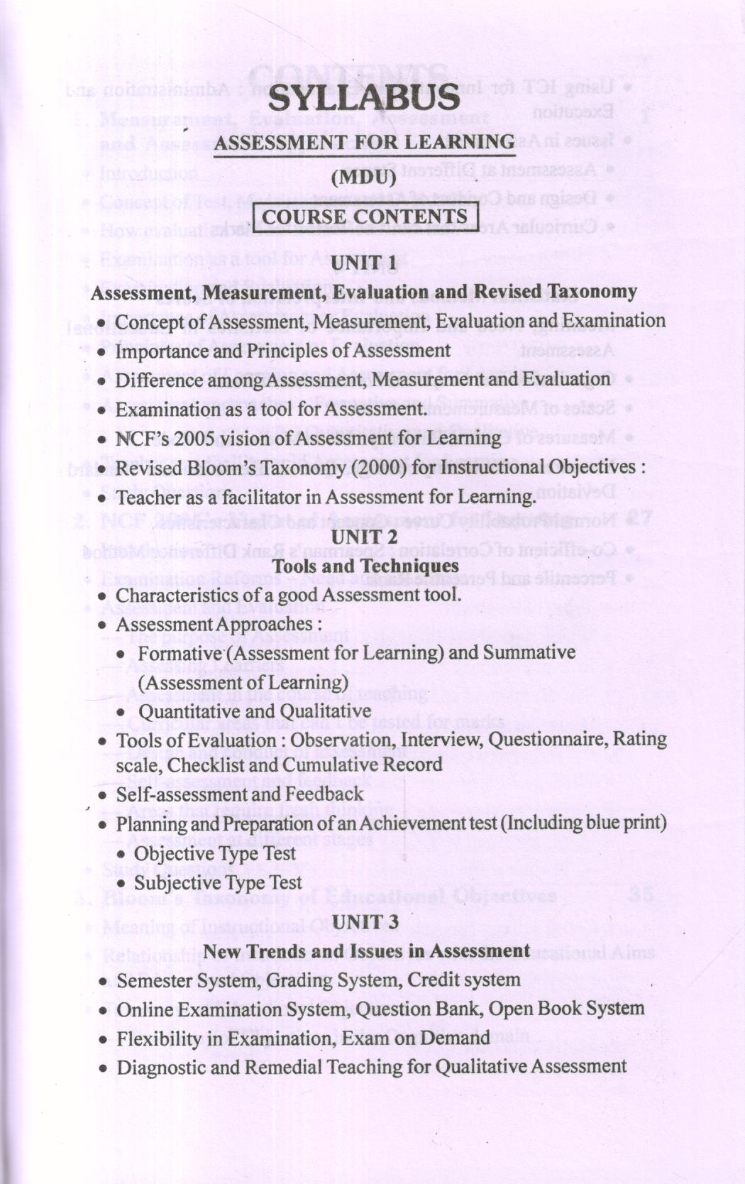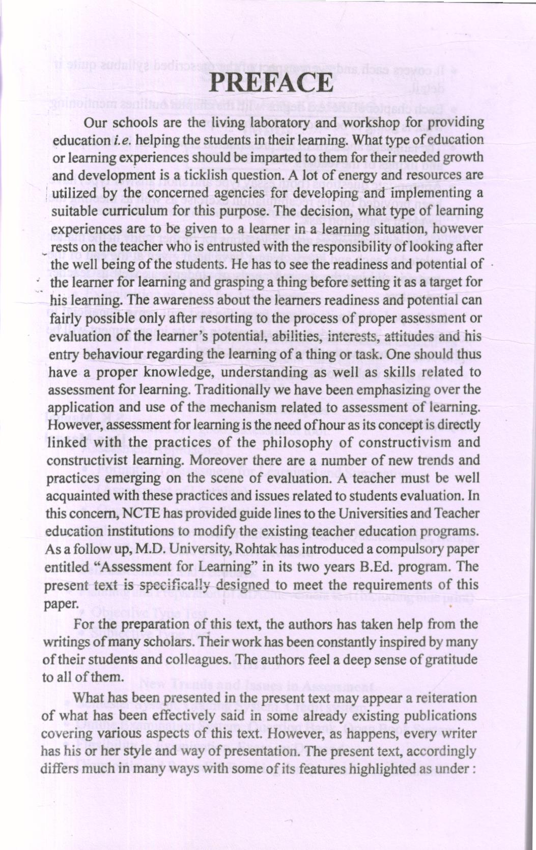Our schools are the living laboratory and workshop for providing education i.e. helping the students in their learning. What type of education or learning experiences should be imparted to them for their needed growth and development is a ticklish question. A lot of energy and resources are utilized by the concerned agencies for developing and implementing a suitable curriculum for this purpose. The decision, what type of learning experiences are to be given to a learner in a learning situation, however rests on the teacher who is entrusted with the responsibility of looking after the well being of the students. He has to see the readiness and potential of the learner for learning and grasping a thing before setting it as a target for his learning. The awareness about the learners readiness and potential can fairly possible only after resorting to the process of proper assessment or evaluation of the learner’s potential, abilities, interests, attitudes and his entry behaviour regarding the learning of a thing or task. One should thus have a proper knowledge, understanding as well as skills related to assessment for learning. Traditionally we have been emphasizing over the application and use of the mechanism related to assessment of learning. However, assessment for learning is the need of hour as its concept is directly linked with the practices of the philosophy of constructivism and constructivist learning. Moreover there are a number of new trends and practices emerging on the scene of evaluation. A teacher must be well acquainted with these practices and issues related to students evaluation. In this concern, NCTE has provided guide lines to the Universities and Teacher education institutions to modify the existing teacher education programs. As a follow up, M.D. University, Rohtak has introduced a compulsory paper entitled “Assessment for Learning” in its two years B.Ed. program. The present text is specifically designed to meet the requirements of this paper.