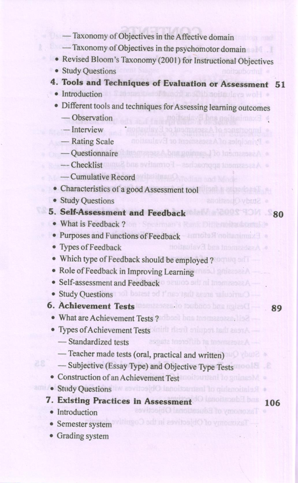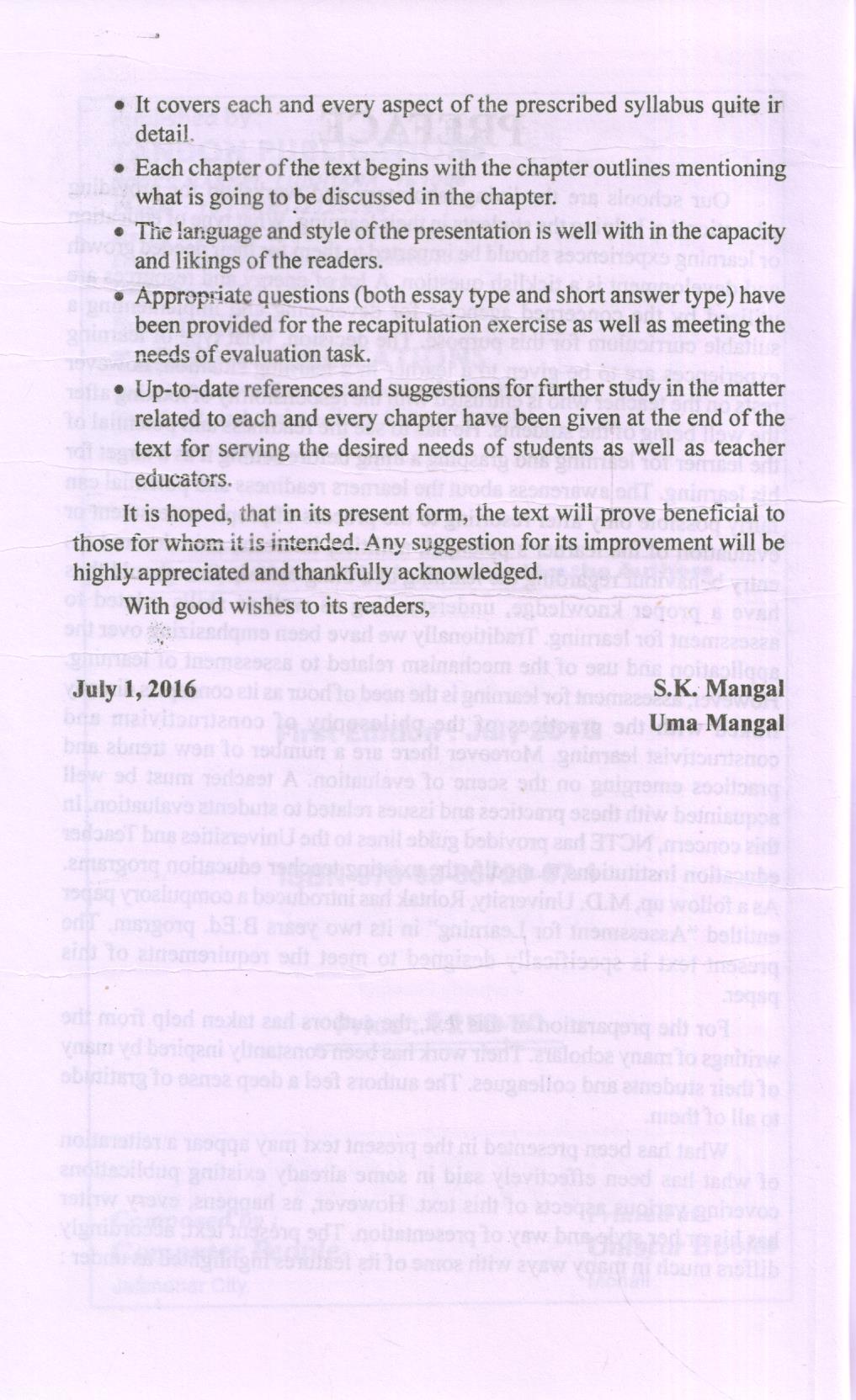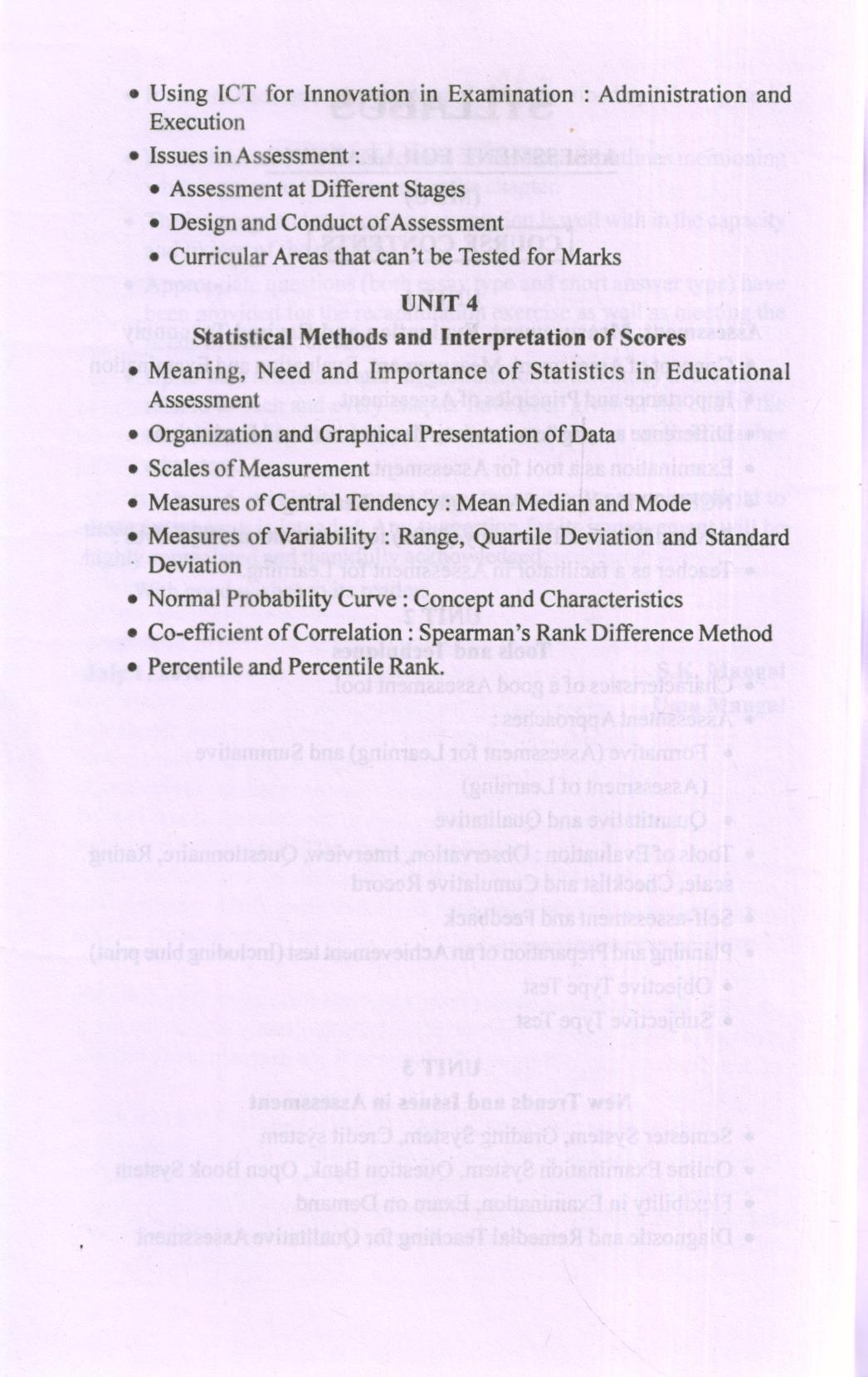 Our schools are the living laboratory and workshop for providing education i.e. helping the students in their learning. What type of education or learning experiences should be imparted to them for their needed growth and development is a ticklish question. A lot of energy and resources are utilized by the concerned agencies for developing and implementing a suitable curriculum for this purpose. The decision, what type of learning experiences are to be given to a learner in a learning situation, however rests on the teacher who is entrusted with the responsibility of looking after the well being of the students. He has to see the readiness and potential of the learner for learning and grasping a thing before setting it as a target for his learning. The awareness about the learners readiness and potential can fairly possible only after resorting to the process of proper assessment or evaluation of the learner’s potential, abilities, interests, attitudes and his entry behaviour regarding the learning of a thing or task. One should thus have a proper knowledge, understanding as well as skills related to assessment for learning. Traditionally we have been emphasizing over the application and use of the mechanism related to assessment of learning. However, assessment for learning is the need of hour as its concept is directly linked with the practices of the philosophy of constructivism and constructivist learning. Moreover there are a number of new trends and practices emerging on the scene of evaluation. A teacher must be well acquainted with these practices and issues related to students evaluation. In this concern, NCTE has provided guide lines to the Universities and Teacher education institutions to modify the existing teacher education programs. As a follow up, M.D. University, Rohtak has introduced a compulsory paper entitled “Assessment for Learning” in its two years B.Ed. program. The present text is specifically designed to meet the requirements of this paper.