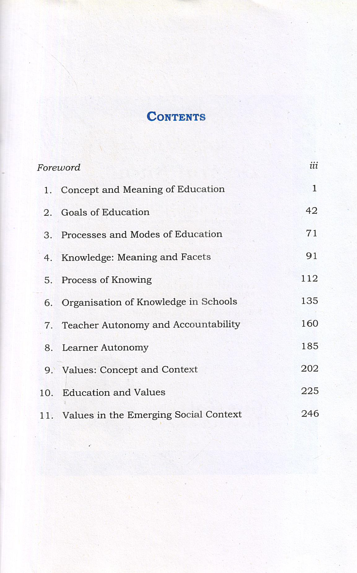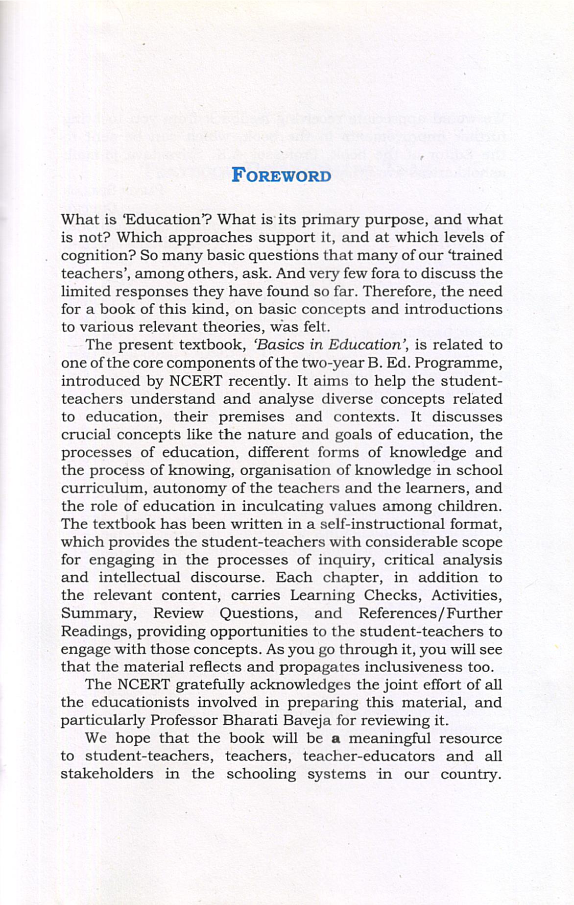 The present textbook, ‘Basics in Education’, is related to one of the core components of the two-year B. Ed. Programme, introduced by NCERT recently. It aims to help the student-teachers understand and analyse diverse educational concepts, their premises and contexts. It discusses crucial concepts like the nature and goals of education, the processes of education, different forms of knowledge and the process of knowing, the organisation of knowledge in the school curriculum, the autonomy of the teachers and the learners, and the role of education in inculcating values among children. The textbook has been written in a self-instructional format, which provides the student-teachers with considerable scope for engaging in inquiry, critical analysis and intellectual discourse. Each chapter, in addition to the relevant content, carries Learning Checks, Activities, Summary, Review Questions, and References/Further Readings, providing opportunities for the student-teachers to engage with those concepts. As you go through it, you will see that the material reflects and propagates inclusiveness too.