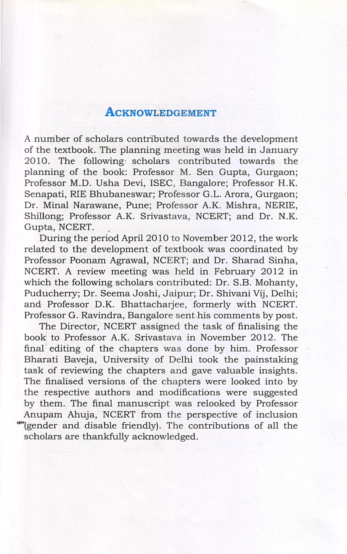The NCERT gratefully acknowledges the joint effort of all the educationists involved in preparing this material, particularly Professor Bharati Baveja, for reviewing it.