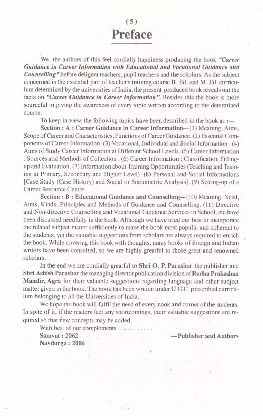 We, the authors of this feel cordially happy to produce the book “Career Guidance in Career Information with Educational and Vocational Guidance and Counselling” before diligent teachers, pupil teachers and scholars. As the subject concerned is the essential part of teacher’s training course B. Ed. and M. Ed. curricu- lum determined by the universities of India, the present produced book reveals the facts on “Career Guidance in Career Information”. Besides this, the book is more sourceful in giving the awareness of every topic written according to the determined course.