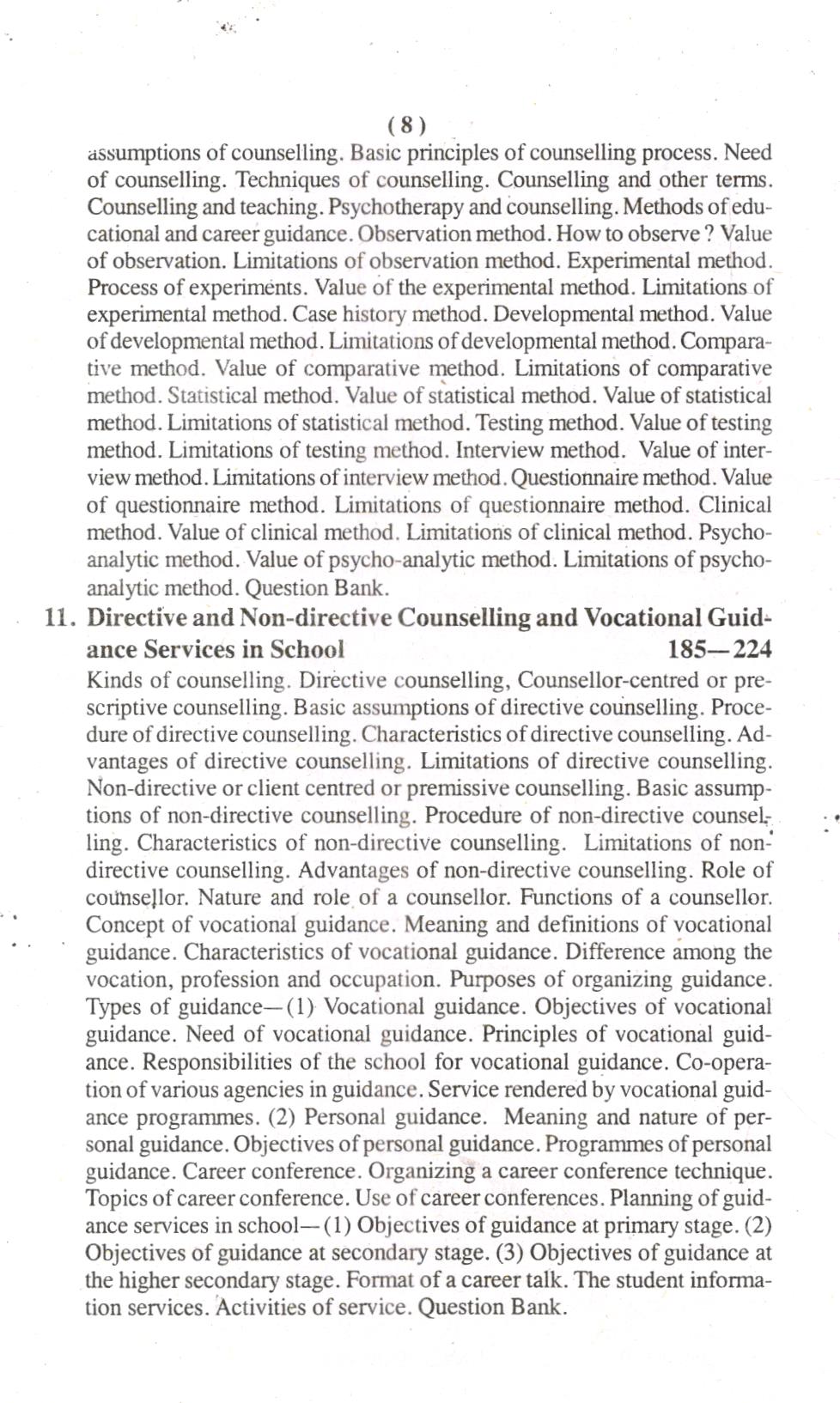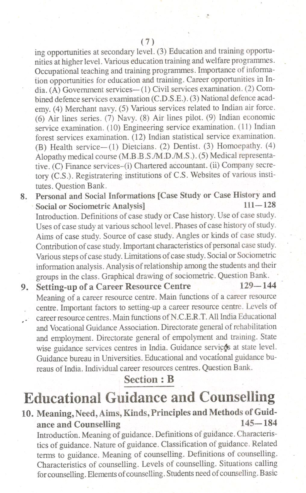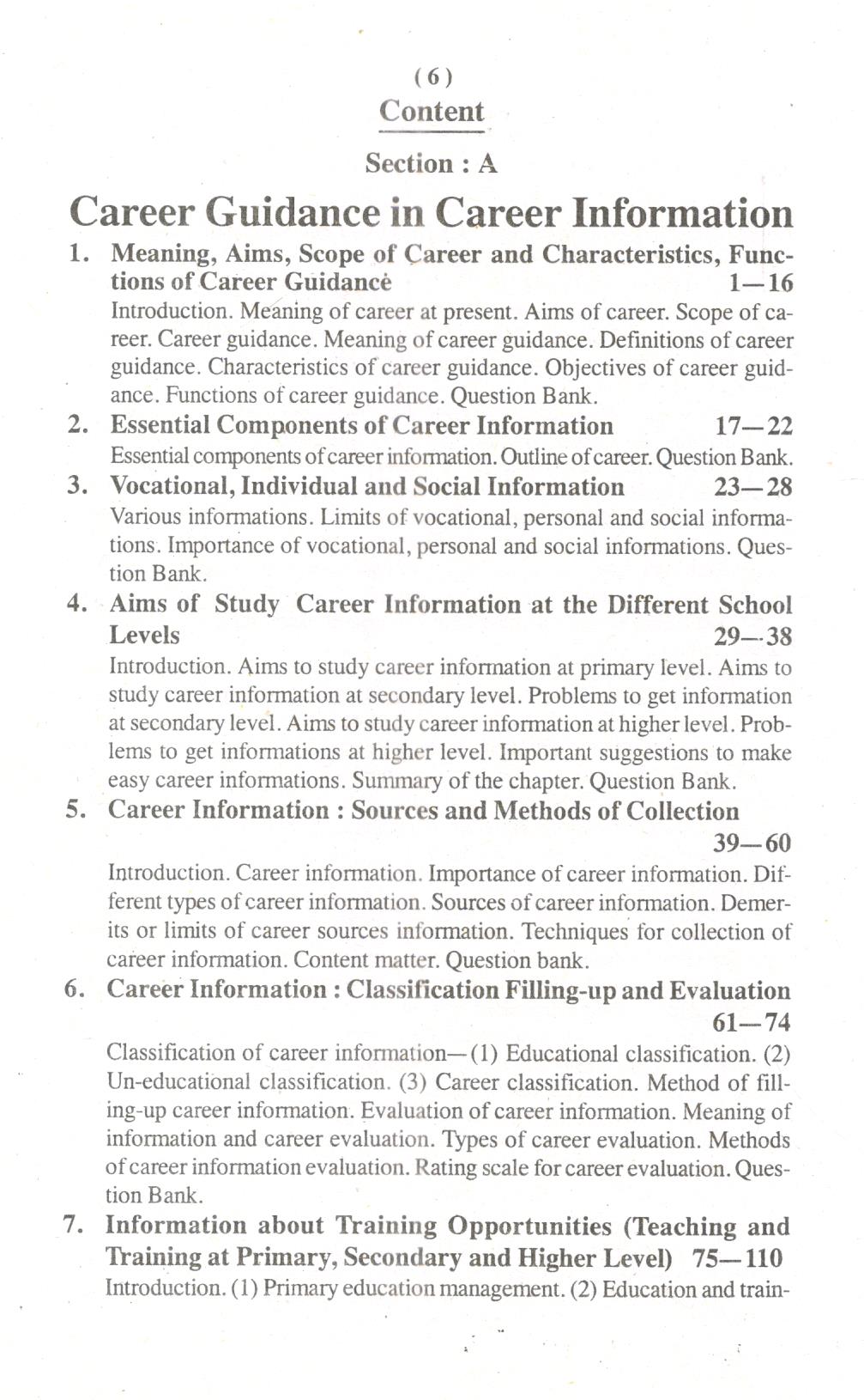 Section: A: Career Guidance in Career Information-(1) Meaning, Aims, Scope of Career and Characteristics, Functions of Career Guidance. (2) Essential Components of Career Information. (3) Vocational, Individual and Social Information. (4) Aims of Study Career Information at Different School Levels. (5) Career Information Sources and Methods of Collection. (6) Career Information: Classification Filling-up and Evaluation. (7) Information about Training Opportunities (Teaching and Train- ing at Primary, Secondary and Higher Level). (8) Personal and Social information [Case Study (Case History) and Social or Sociometric Analysis). (9) Setting up of a Career Resource Centre.