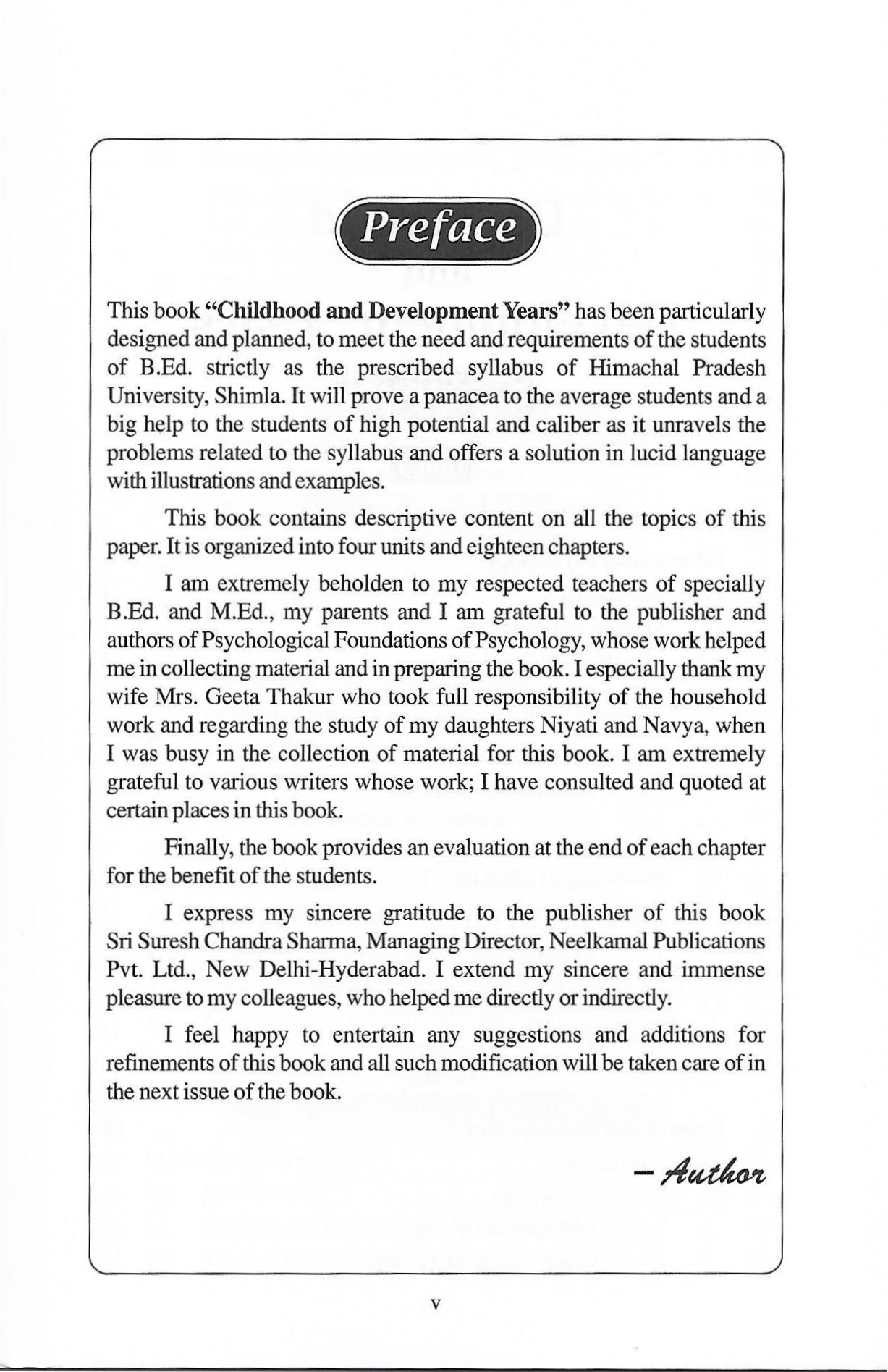 This book “Childhood and Development Years” has been particularly designed and planned, to meet the need and requirements of the students of B.Ed. strictly as the prescribed syllabus of Himachal Pradesh University, Shimla. It will prove a panacea to the average students and a big help to students of high potential and calibre as it unravels the problems related to the syllabus and offers a solution in lucid language with illustrations and examples.