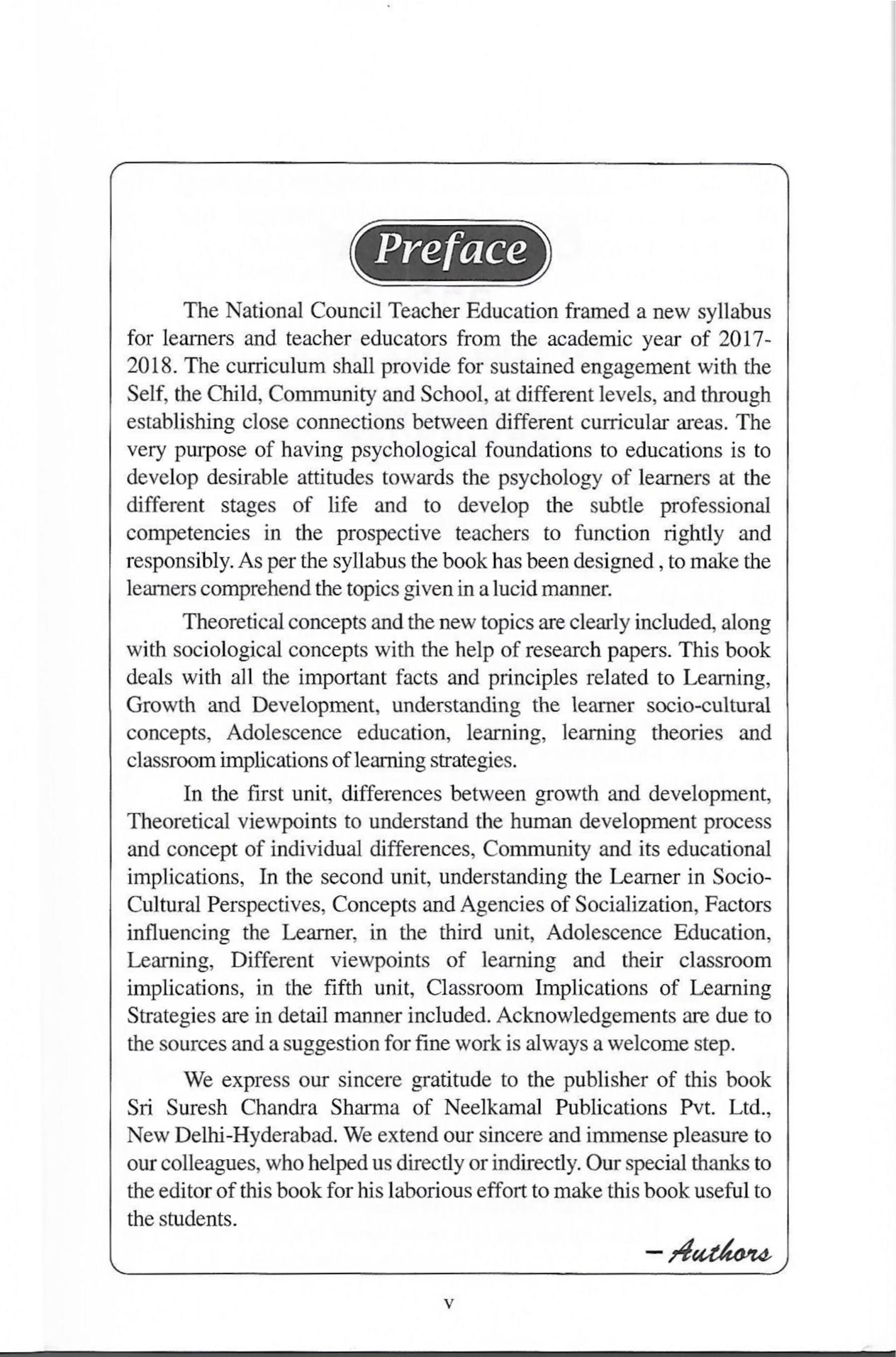 The National Council of Teacher Education framed a new syllabus for learners and teacher educators from the academic year of 2017- 2018. The curriculum shall provide for sustained engagement with the Self, the Child, the Community and the School, at different levels, and through establishing close connections between different curricular areas. The very purpose of having psychological foundations to education is to develop desirable attitudes towards the psychology of learners at the different stages of life and to develop the subtle professional competencies in the prospective teachers to function rightly and responsibly. As per the syllabus the book has been designed, to make the learners comprehend the topics given in a lucid manner.