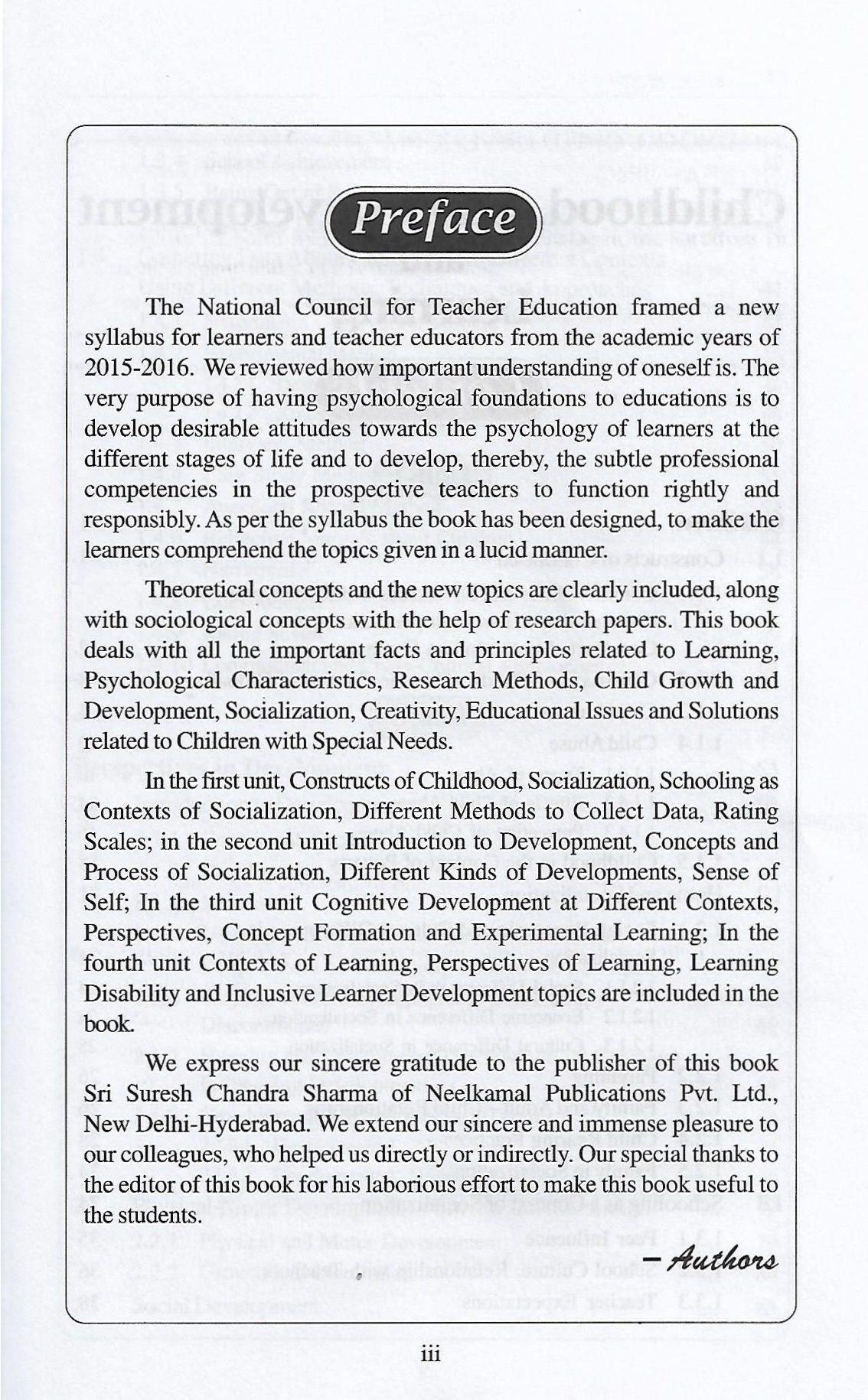 The National Council for Teacher Education framed a new syllabus for learners and teacher educators from the academic years of 2015-2016. We reviewed how important understanding of oneself is. The very purpose of having psychological foundations in education is to develop desirable attitudes towards the psychology of learners at the different stages of life and to develop, thereby, the subtle professional competencies in the prospective teachers to function rightly and responsibly. As per the syllabus the book has been designed, to make the learners comprehend the topics given in a lucid manner.