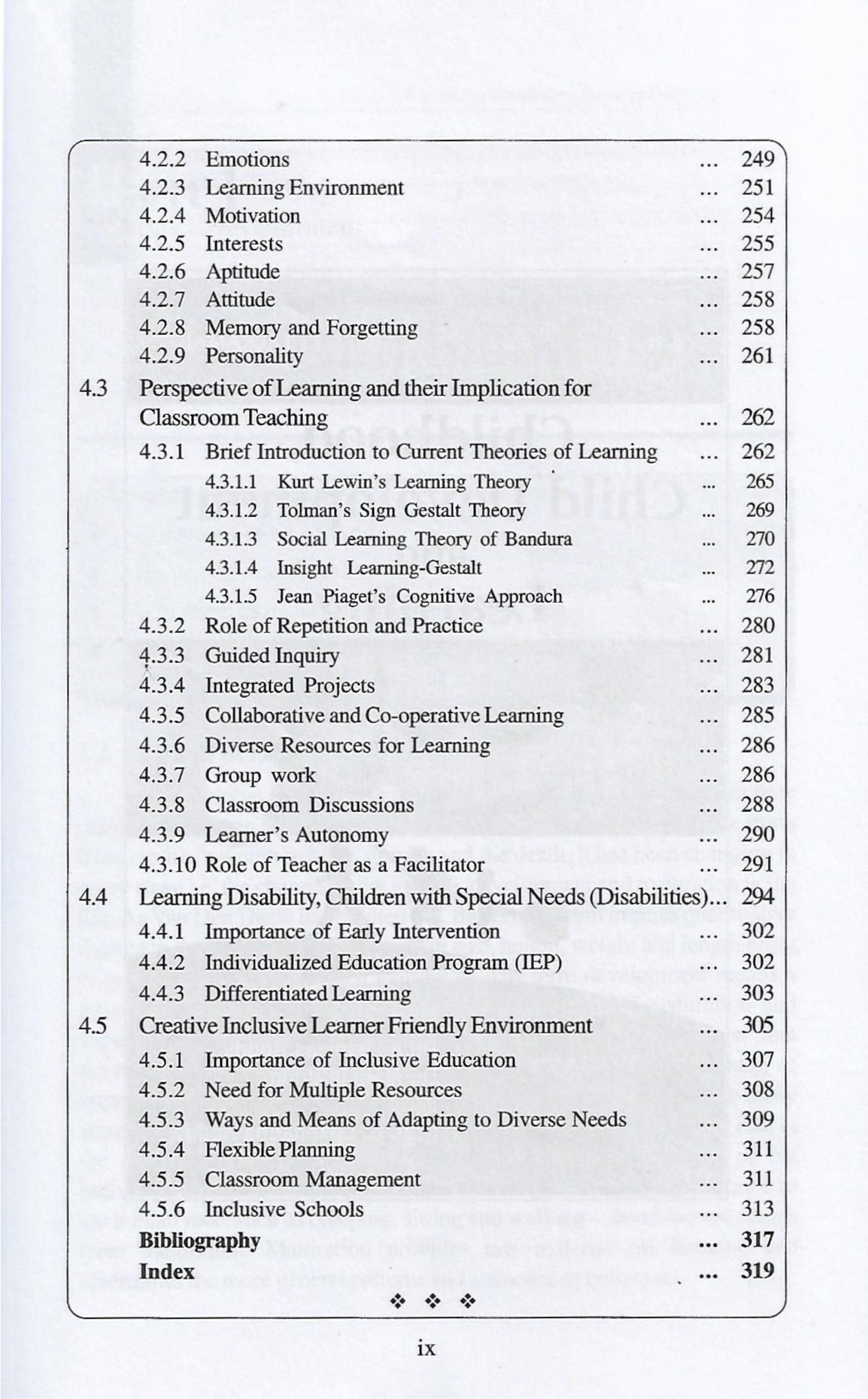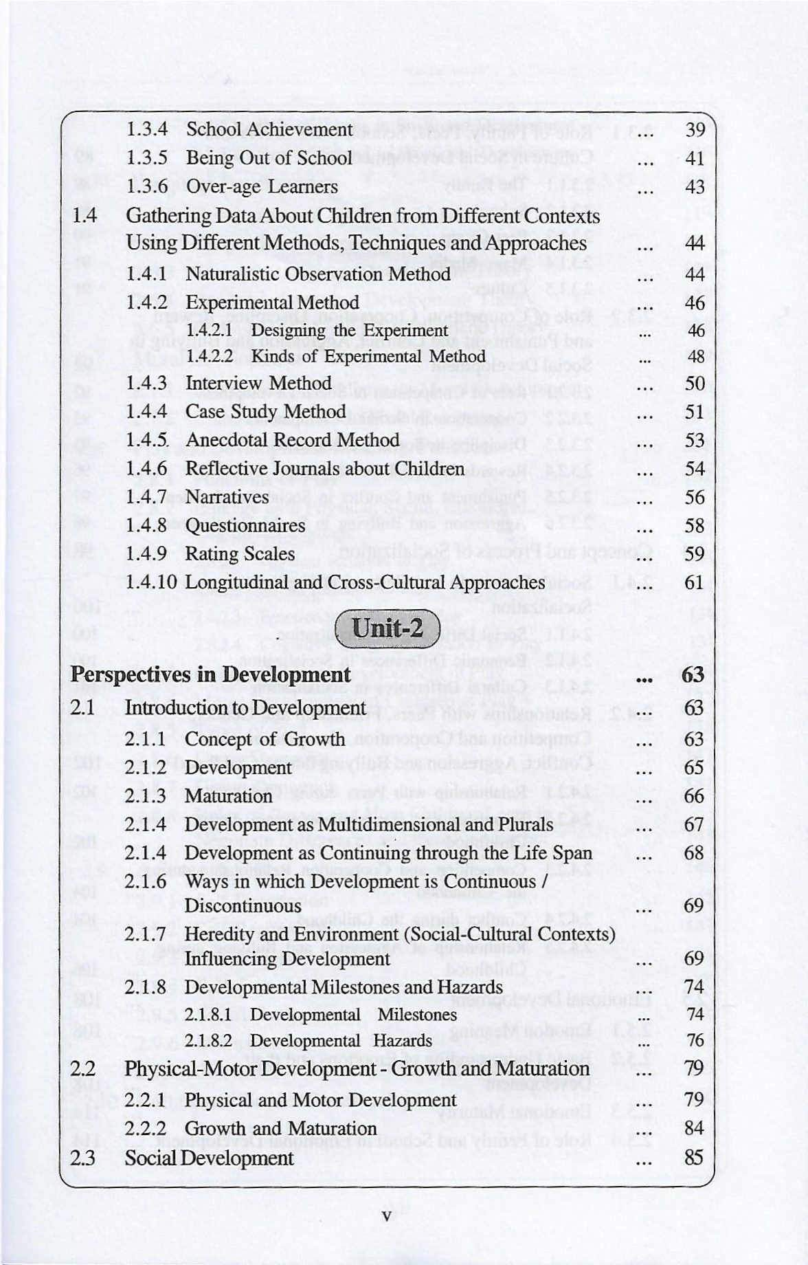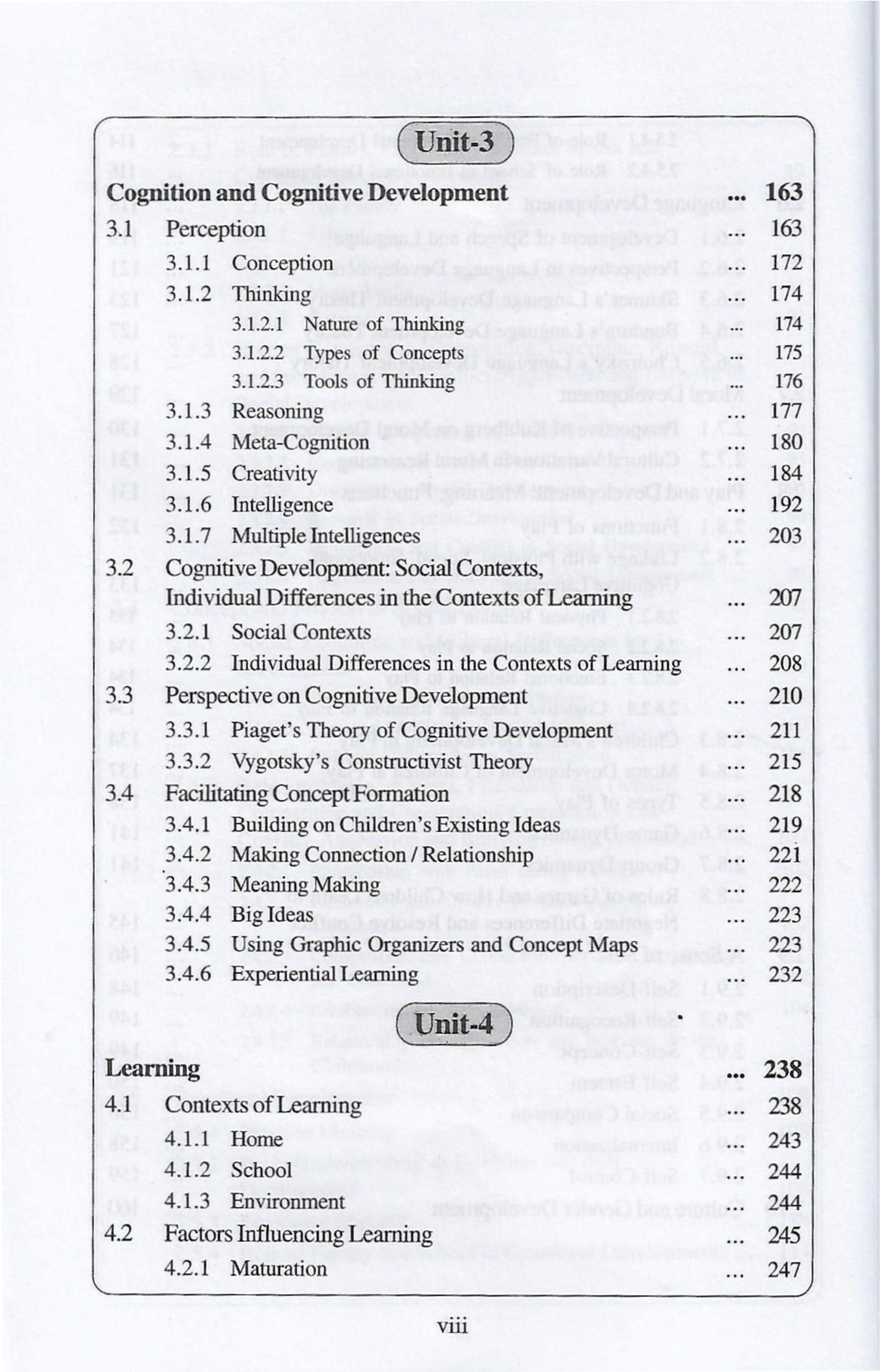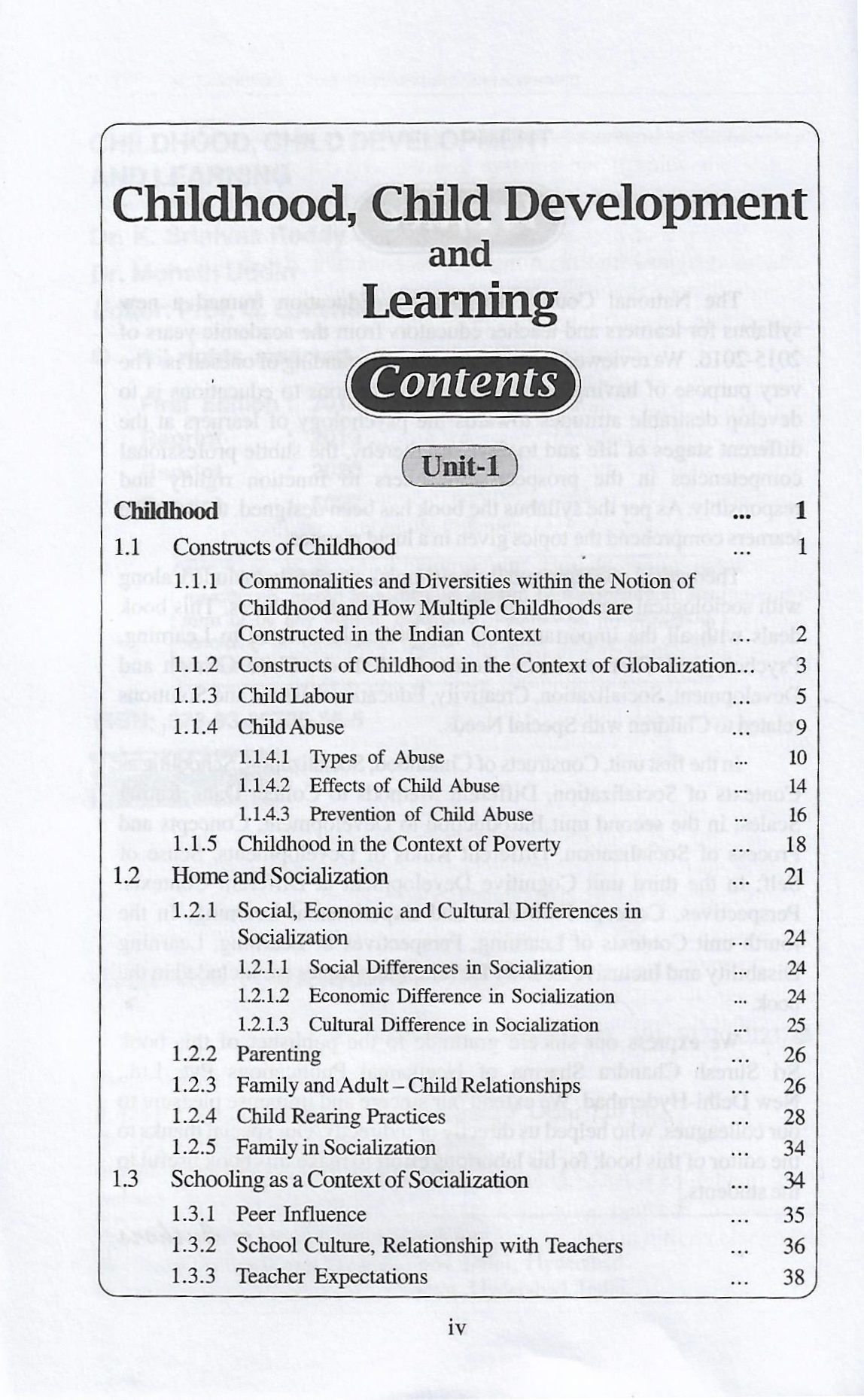 In the first unit, Constructs of Childhood, Socialization, Schooling as Contexts of Socialization, Different Methods to Collect Data, Rating Scales; in the second unit Introduction to Development, Concepts and Process of Socialization, Different Kinds of Developments, Sense of Self; In the third unit Cognitive Development at Different Contexts. Perspectives, Concept Formation and Experimental Learning; In the fourth unit Contexts of Learning, Perspectives of Learning, Learning Disability and Inclusive Learner Development topics are included in the book.