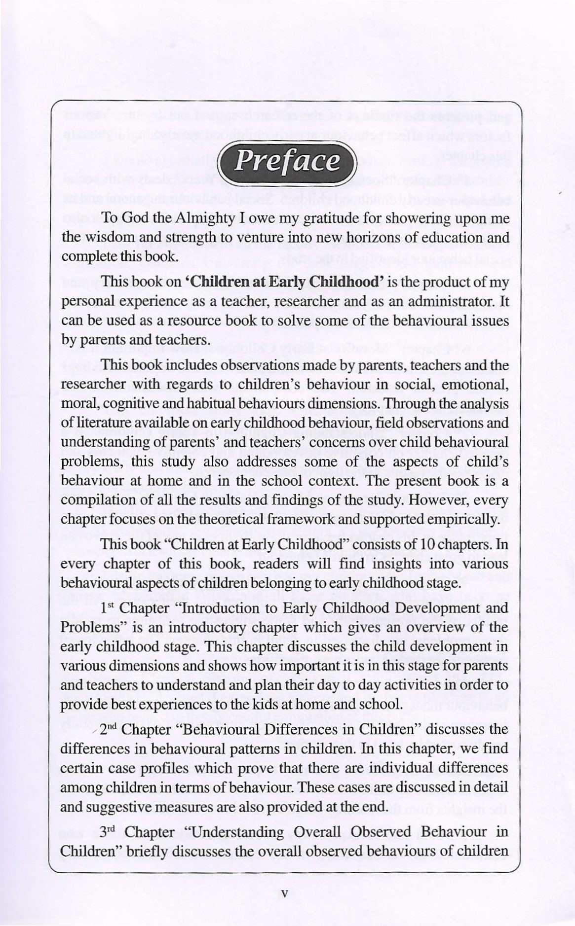 This book on “Children at Early Childhood in the product of my personal experience as a teacher, and researcher, and can be used as a resource book to solve some of the behaviours by parents and teachers.