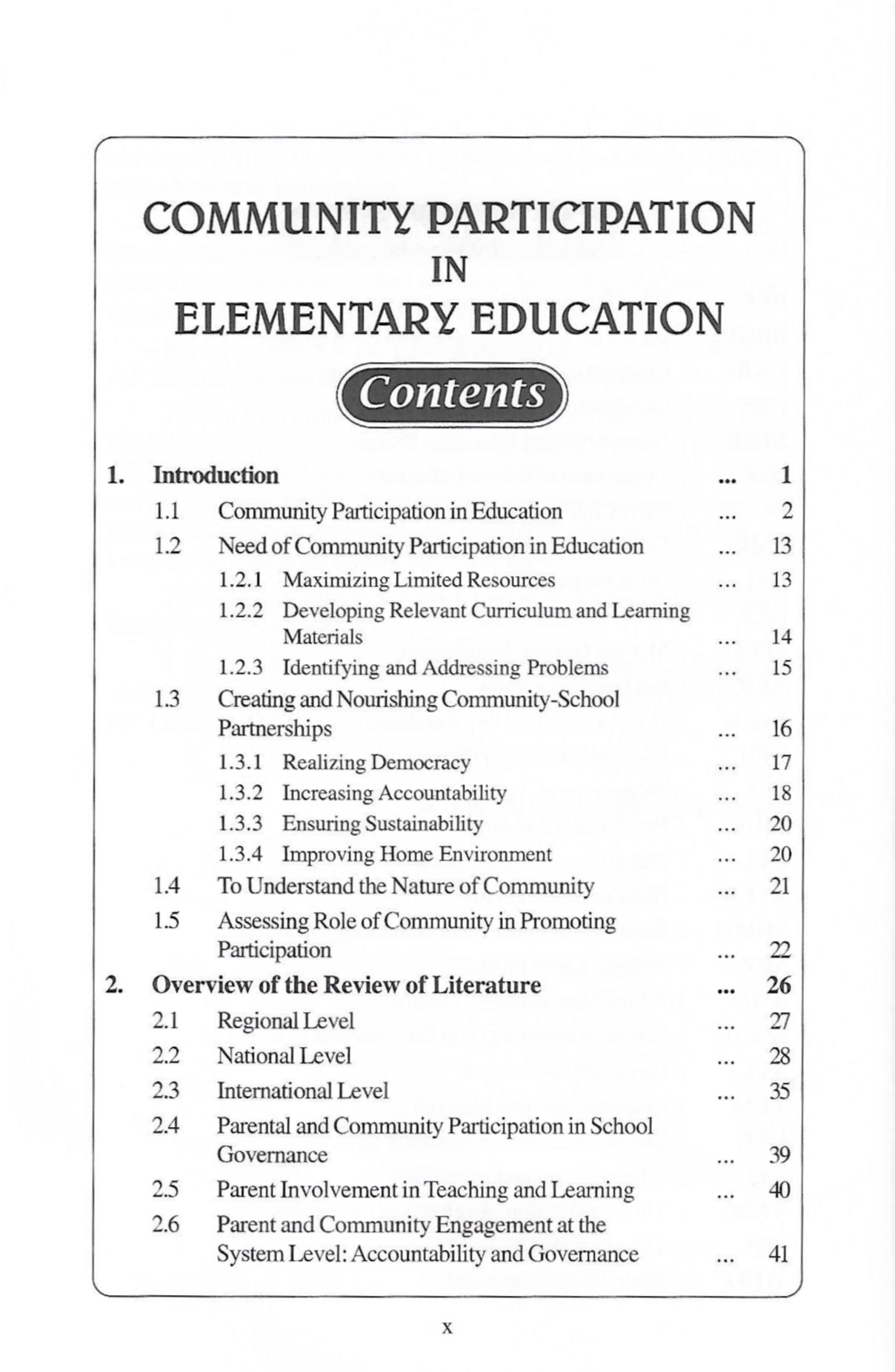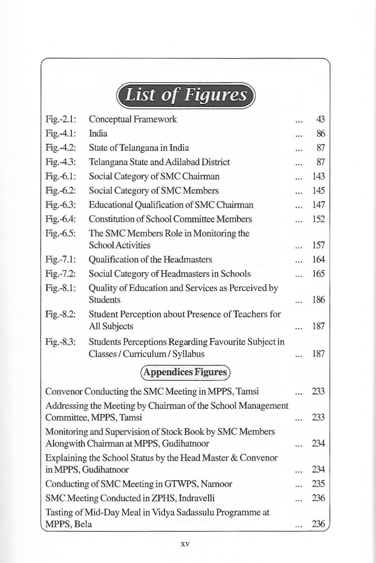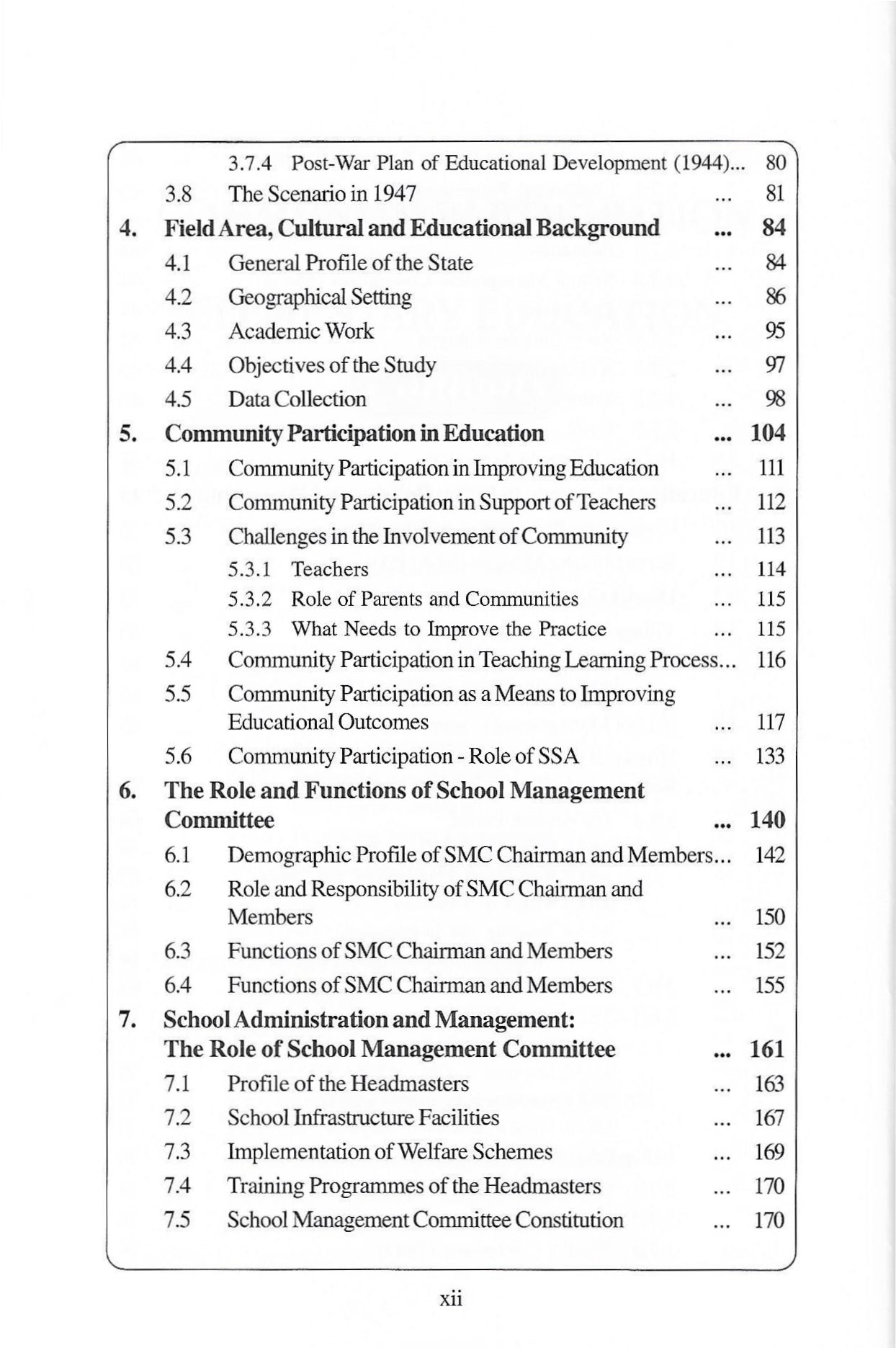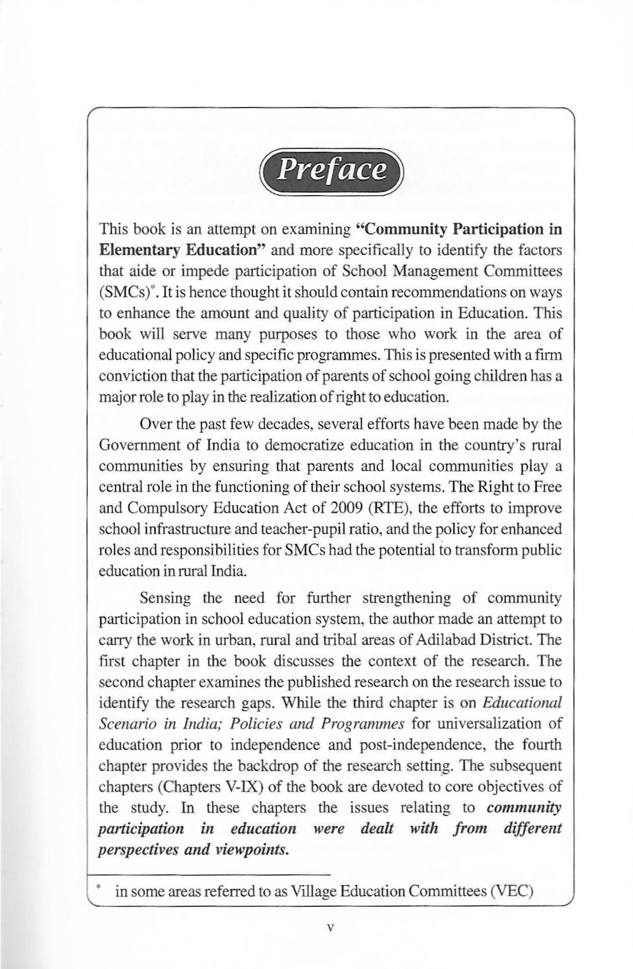 Sensing the need for further strengthening of community participation in the school education system, the author made an attempt to carry the work in urban, rural and tribal areas of Adilabad District. The first chapter in the book discusses the context of the research. The second chapter examines the published research on the research issue to identify the research gaps. While the third chapter is on Educational Scenario in India; Policies and Programmes for universalization of education prior to independence and post-independence, the fourth chapter provides the backdrop of the research setting. The subsequent chapters (Chapters V-IX) of the book are devoted to the core objectives of the study. In these chapters, the issues relating to community participation in education were dealt with from different perspectives and viewpoints.
