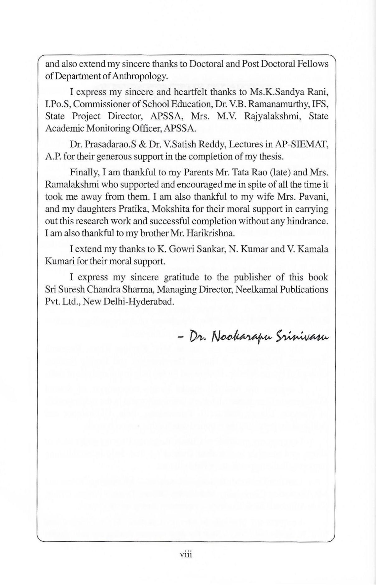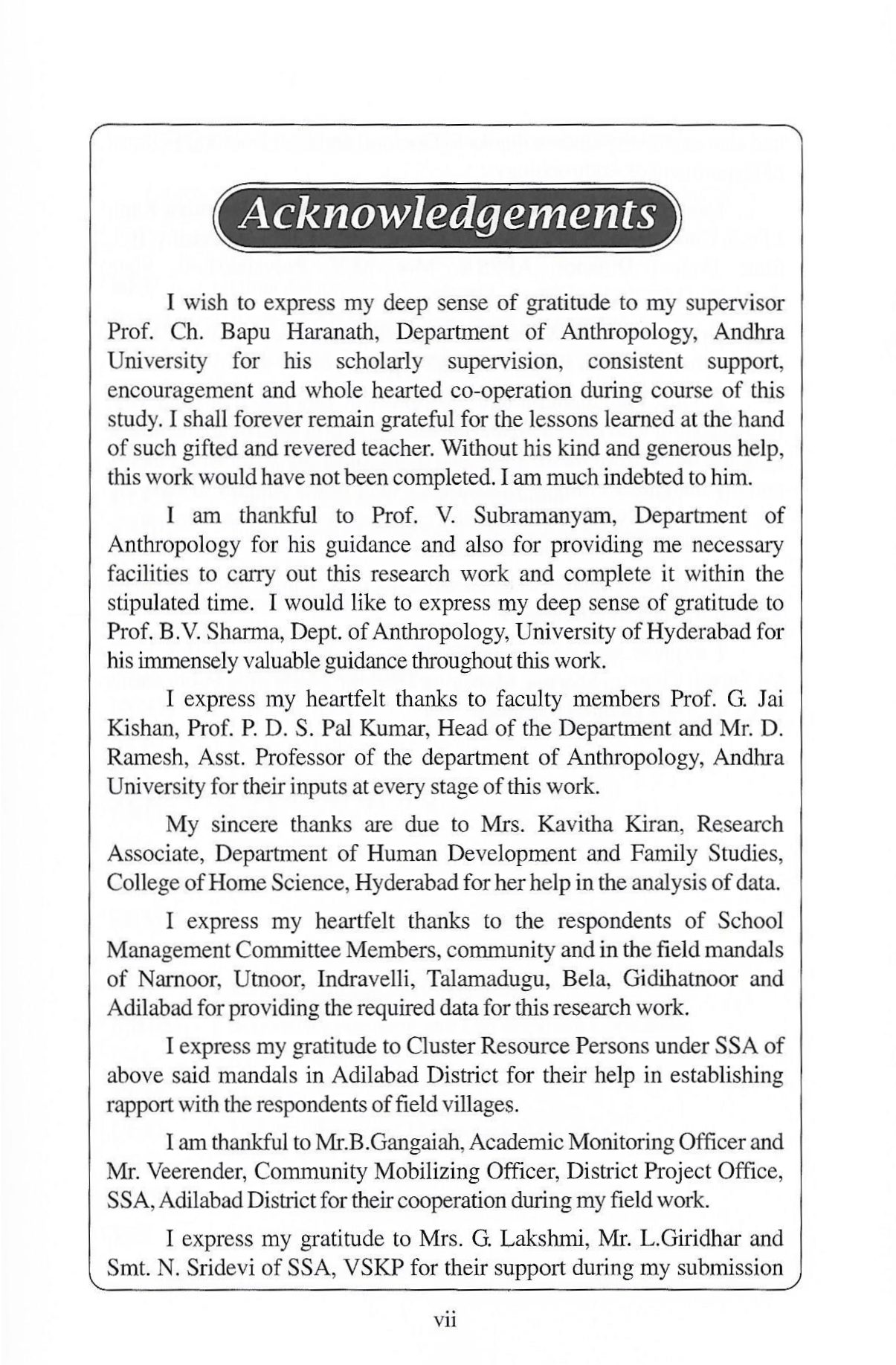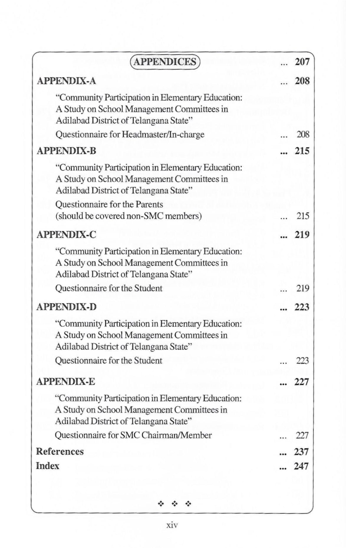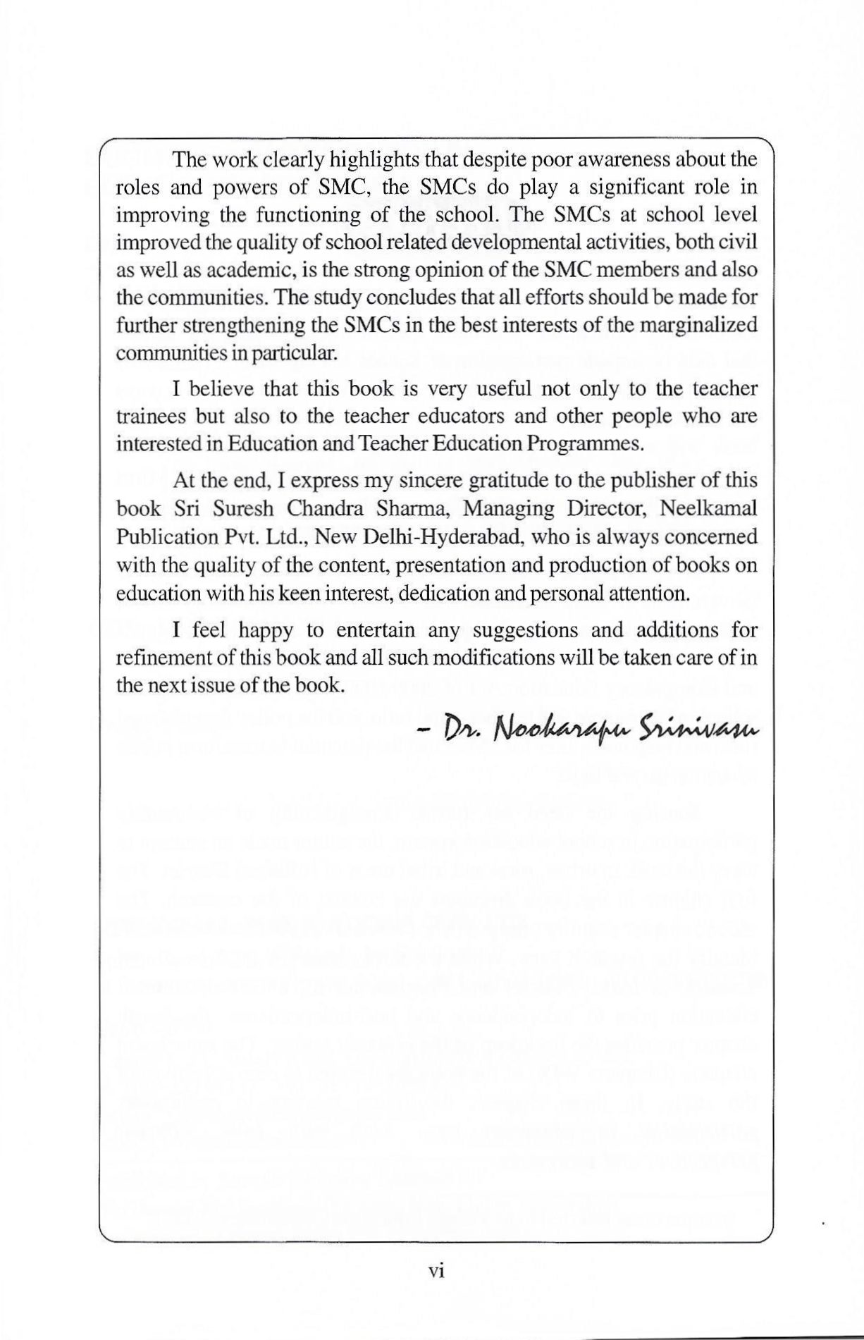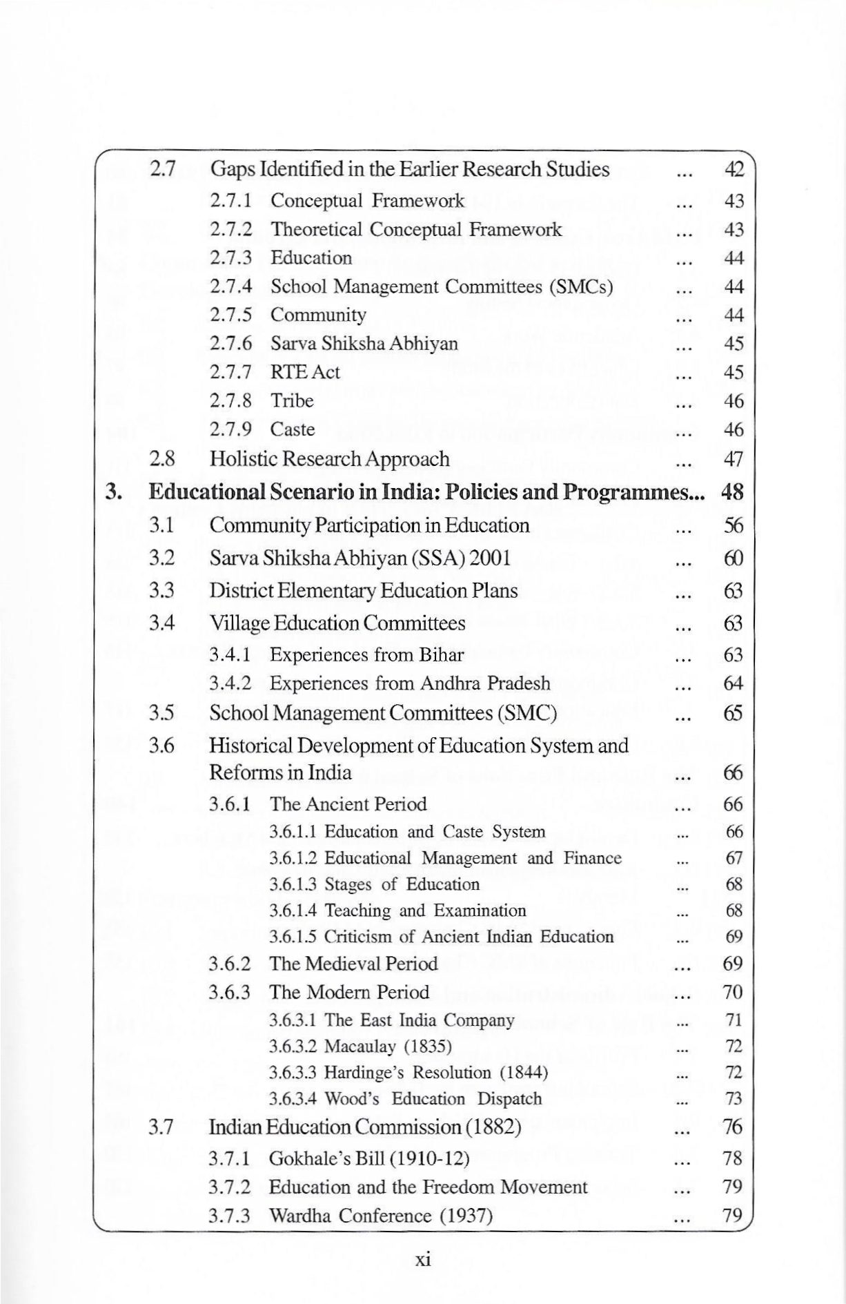 Sensing the need for further strengthening of community participation in the school education system, the author made an attempt to carry the work in urban, rural and tribal areas of Adilabad District. The first chapter in the book discusses the context of the research. The second chapter examines the published research on the research issue to identify the research gaps. While the third chapter is on Educational Scenario in India; Policies and Programmes for universalization of education prior to independence and post-independence, the fourth chapter provides the backdrop of the research setting. The subsequent chapters (Chapters V-IX) of the book are devoted to the core objectives of the study. In these chapters, the issues relating to community participation in education were dealt with from different perspectives and viewpoints.