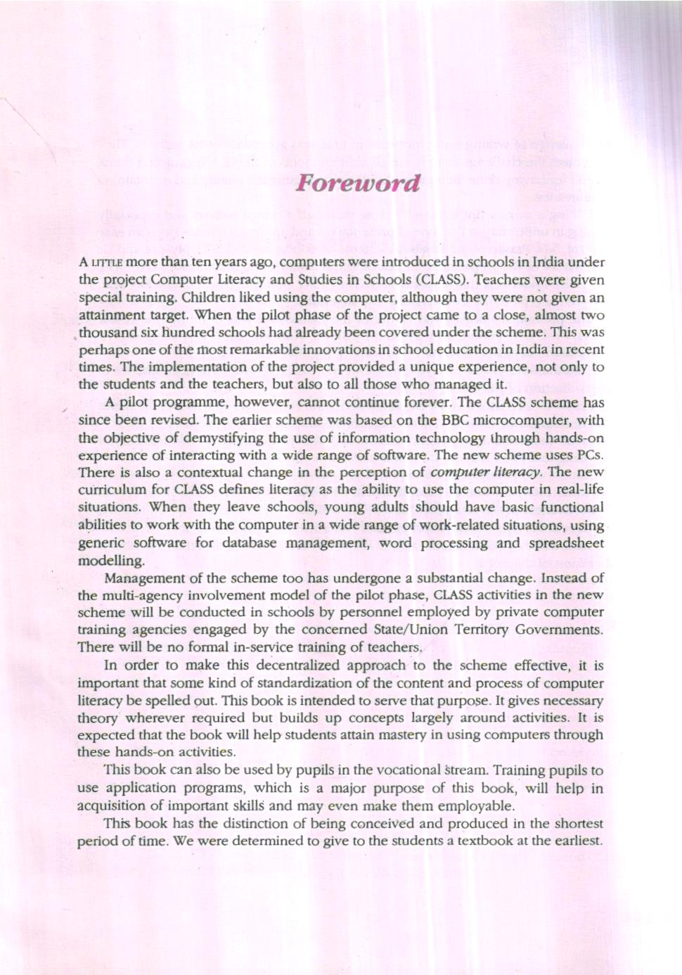 A UTTLE more than ten years ago, computers were introduced in schools in India under the project Computer Literacy and Studies in Schools (CLASS). Teachers were given special training. Children liked using the computer, although they were not given an attainment target. When the pilot phase of the project came to a close, almost two thousand six hundred schools had already been covered under the scheme. This was perhaps one of the host remarkable innovations in school education in India in recent times. The implementation of the project provided a unique experience, not only to the students and the teachers, but also to all those who managed it.