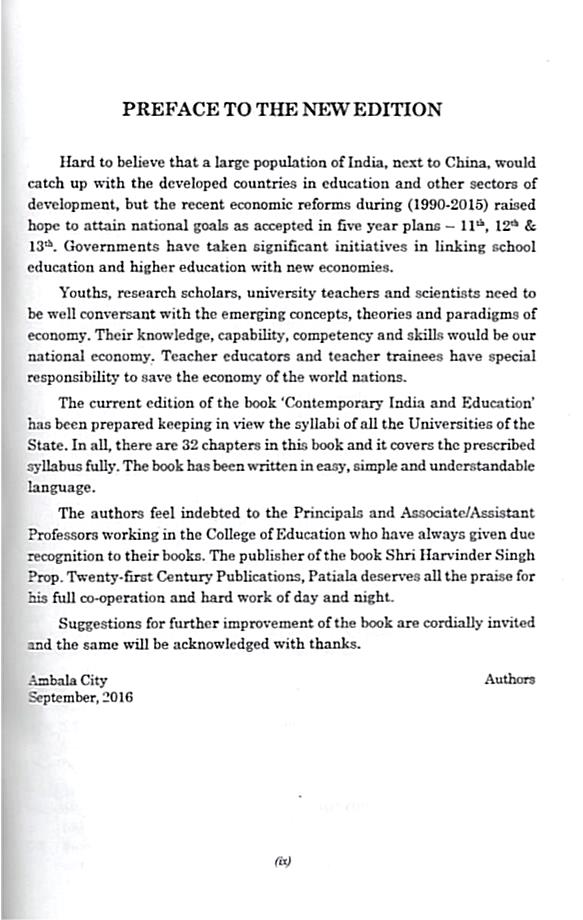 The current edition of the book ‘Contemporary India and Education’ has been prepared keeping in view the syllabi of all the Universities of the State. In all, there are 32 chapters in this book and it covers the prescribed syllabus fully. The book has been written in easy, simple and understandable language.