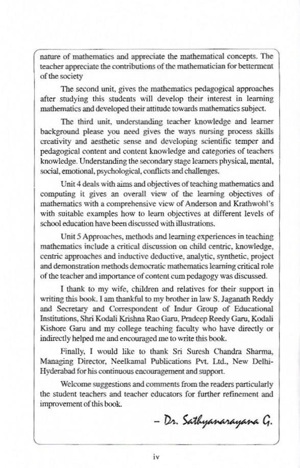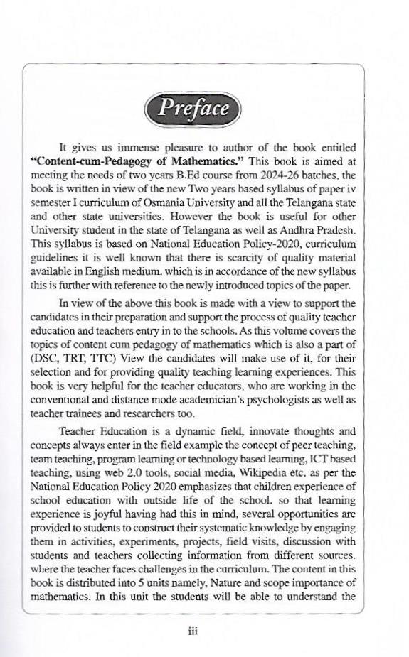 It gives us immense pleasure to author of the book entitled “Content-cum-Pedagogy of Mathematics.” This book is aimed at meeting the needs of two years B.Ed course from 2024-26 batches, the book is written in view of the new Two years based syllabus of paper iv semester I curriculum of Osmania University and all the Telangana state and other state universities. However the book is useful for other University student in the state of Telangana as well as Andhra Pradesh. This syllabus is based on National Education Policy-2020, curriculum guidelines it is well known that there is scarcity of quality material available in English medium, which is in accordance of the new syllabus this is further with reference to the newly introduced topics of the paper.