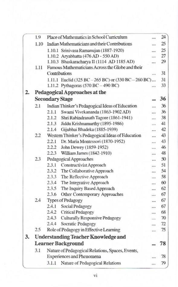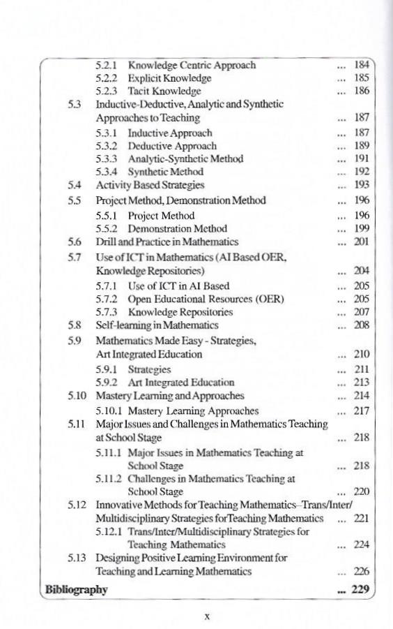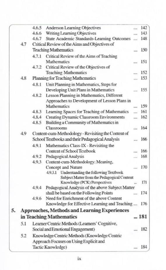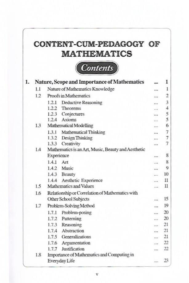 Teacher Education is a dynamic field, innovate thoughts and concepts always enter in the field example the concept of peer teaching, team teaching, program learning or technology based learning, ICT based teaching, using web 2.0 tools, social media, Wikipedia etc. as per the National Education Policy 2020 emphasizes that children experience of school education with outside life of the school. so that learning experience is joyful having had this in mind, several opportunities are provided to students to construct their systematic knowledge by engaging them in activities, experiments, projects, field visits, discussion with students and teachers collecting information from different sources. where the teacher faces challenges in the curriculum. The content in this book is distributed into 5 units namely, Nature and scope importance of mathematics. In this unit the students will be able to understand the