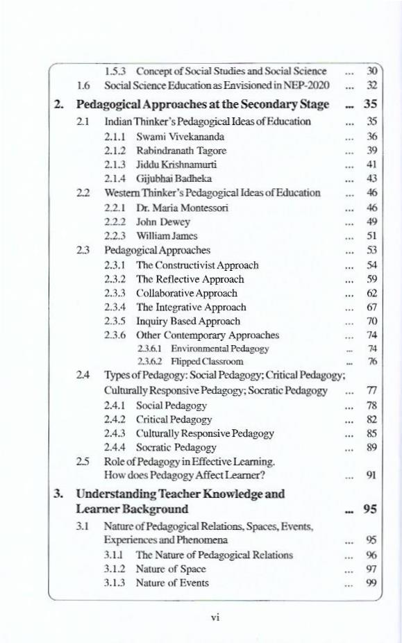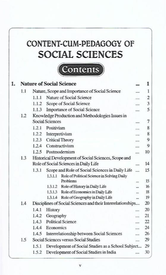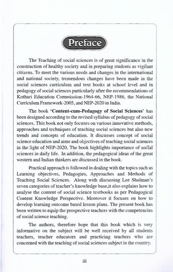 The Teaching of social sciences is of great significance in the construction of healthy society and in preparing students as vigilant citizens. To meet the various needs and changes in the international and national society, tremendous changes have been made in the social sciences curriculum and text books at school level and in pedagogy of social sciences particularly after the recommendations of Kothari Education Commission-1964-66, NEP-1986, the National Curriculum Framework-2005, and NEP-2020 in India.