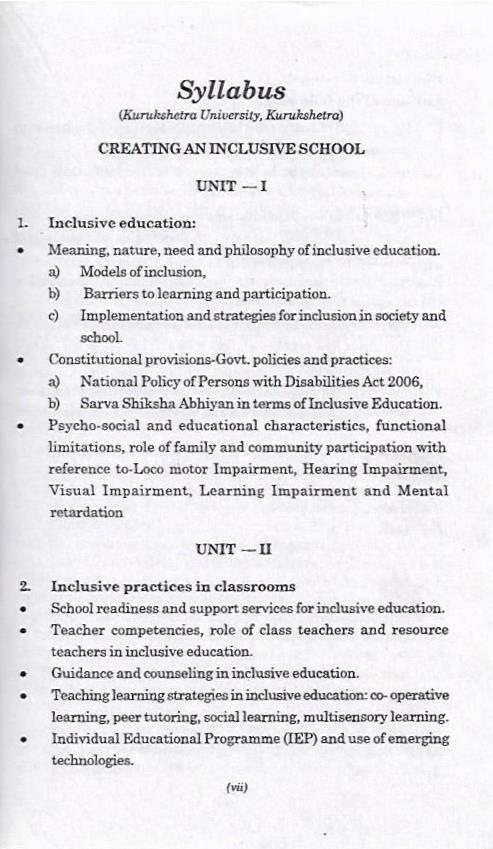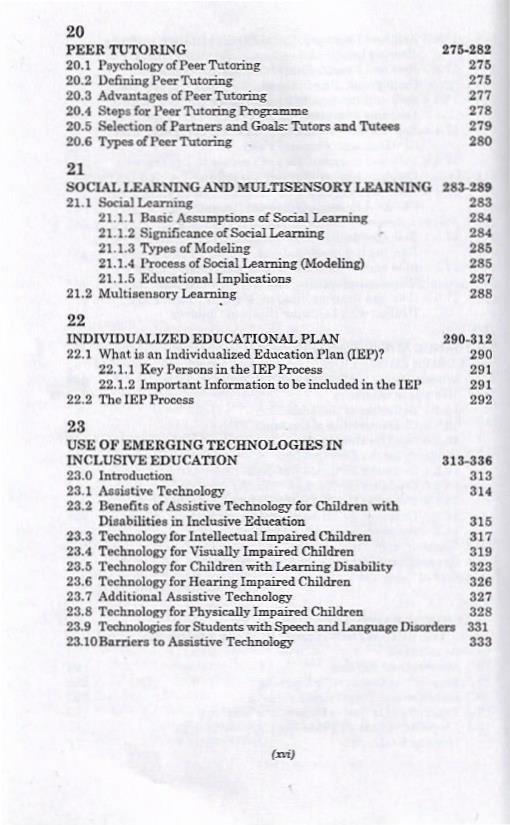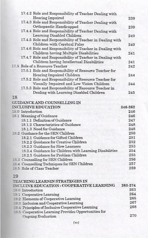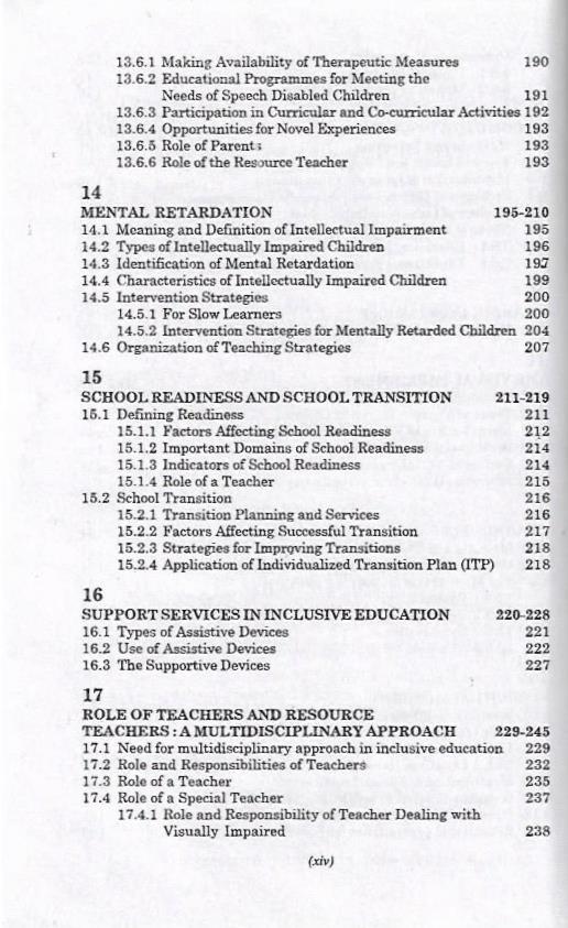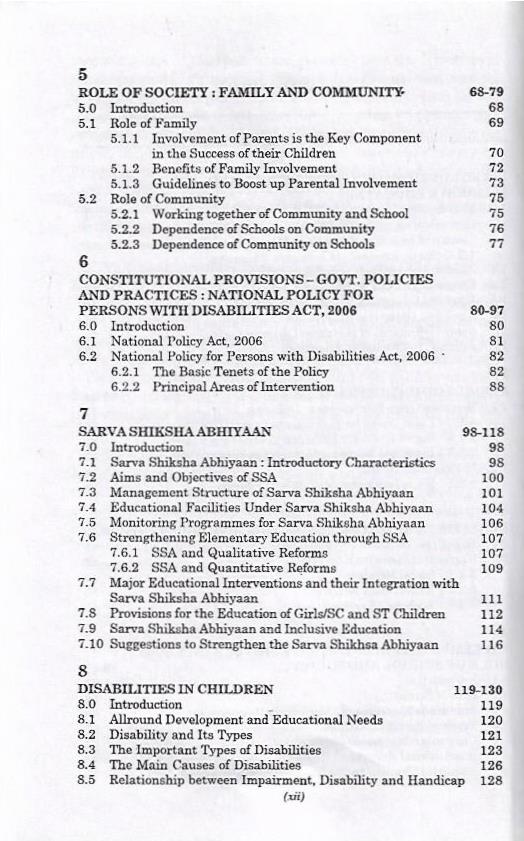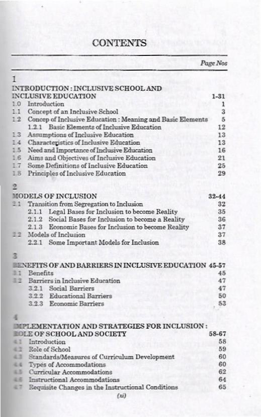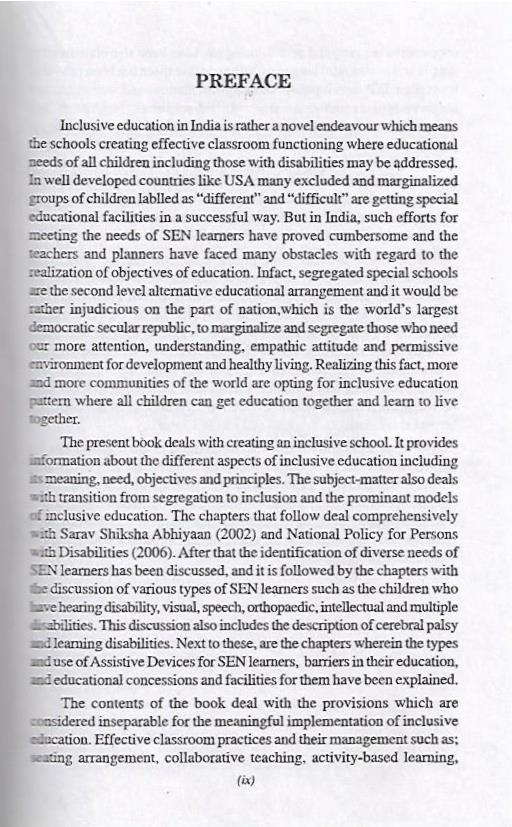 The present book deals with creating an inclusive school. It provides information about the different aspects of inclusive education including its meaning, need, objectives and principles. The subject matter also deals with the transition from segregation to inclusion and the prominent models of inclusive education. The chapters that follow deal comprehensively with Sarva Shiksha Abhiyaan (2002) and National Policy for Persons with Disabilities (2006). After that, the identification of diverse needs of SEN learners is discussed, and it is followed by the chapters with the discussion of various types of SEN learners such as children who have hearing disability, visual, speech, orthopaedic, intellectual and multiple disabilities. This discussion also includes the description of cerebral palsy and learning disabilities. Next to these, are the chapters wherein the types and use of Assistive Devices for SEN learners, barriers in their education, and educational concessions and facilities for them have been explained.