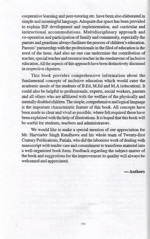 The contents of the book deal with the provisions which are considered inseparable from the meaningful implementation of inclusive education. Effective classroom practices and their management such as; seating arrangement, collaborative teaching, activity-based learning,