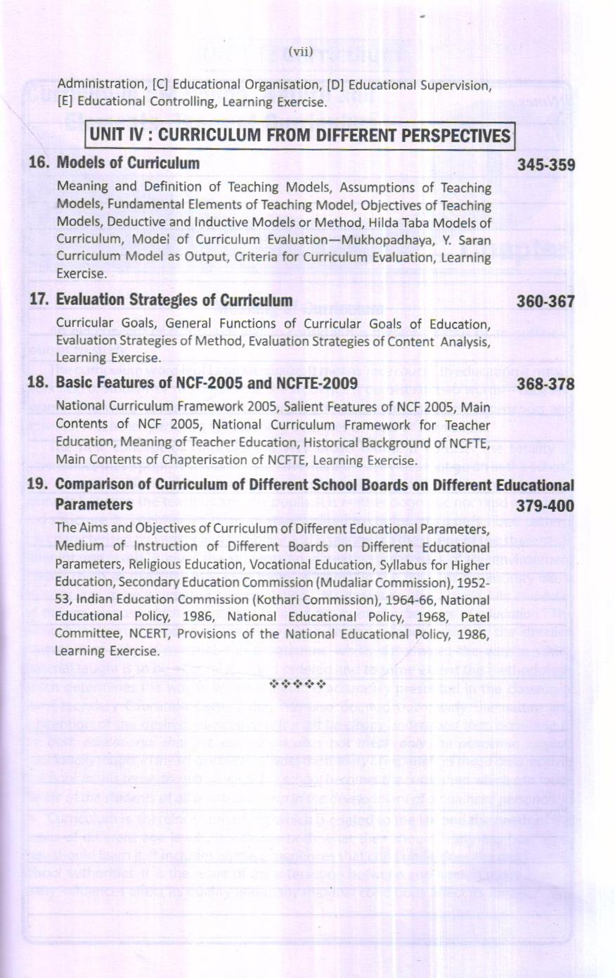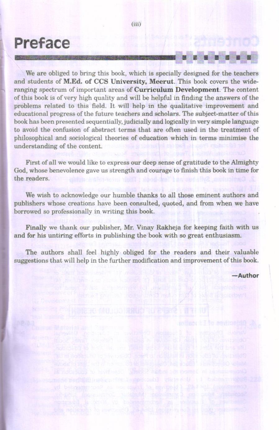 We are obliged to bring this book which is specially designed for the teacher and student of M.ED of CCS University, Meerut this bokk covers the wide- ranging specturn of important areas of Curriculum Development the content of this book is of very high quality and will be helpful in finding the answers of the problems related to this field. It will help in the qualitative improvement and educational progress of the future teachers and scholars. The subject- matter of this book has been presented sequentially, judicially and logically in very simple language to avoid the confusion of abstract terms that are often used in the treatment of philosophical and sociological theories of education which in terms minimise the understanding of the content.