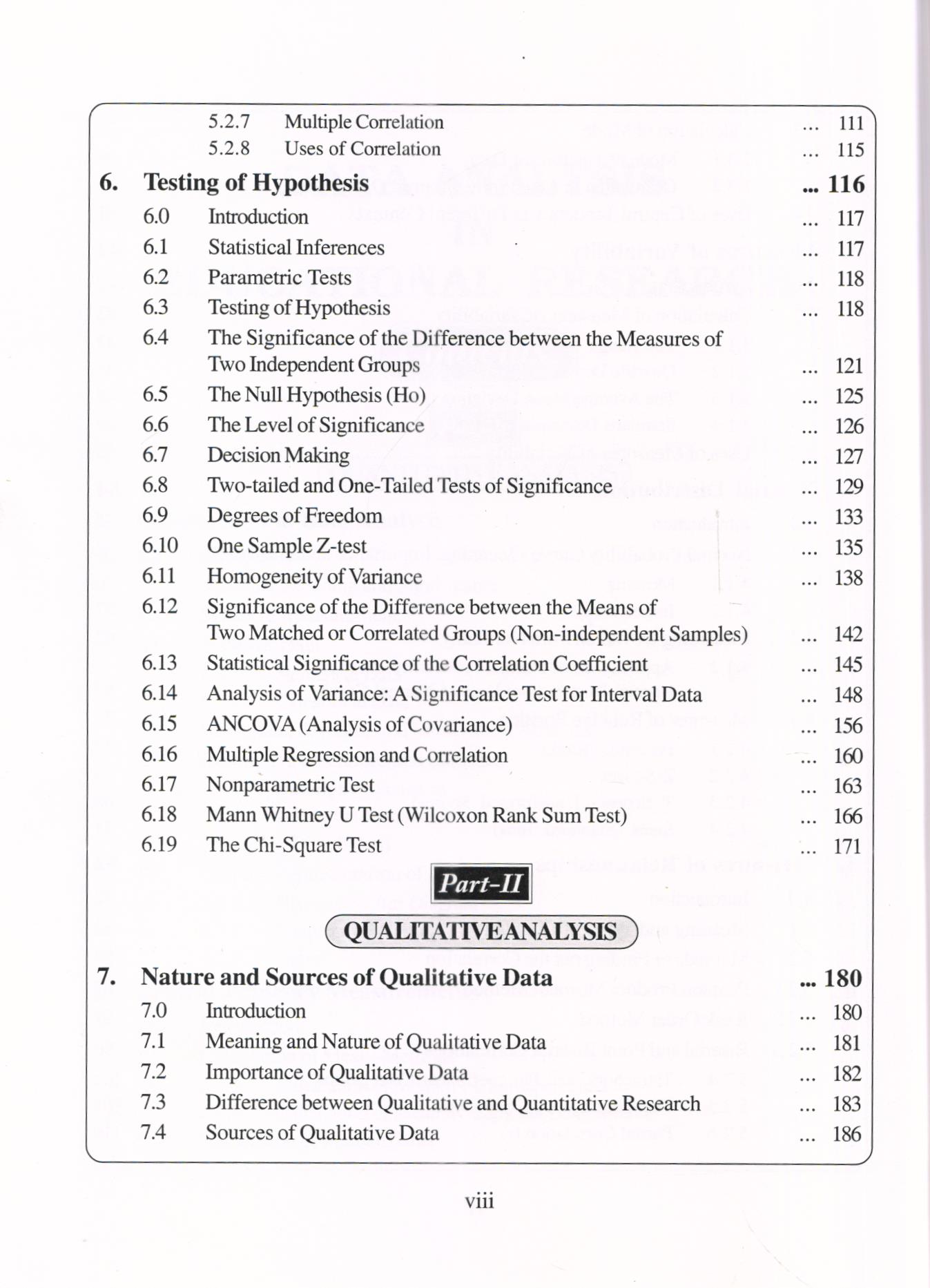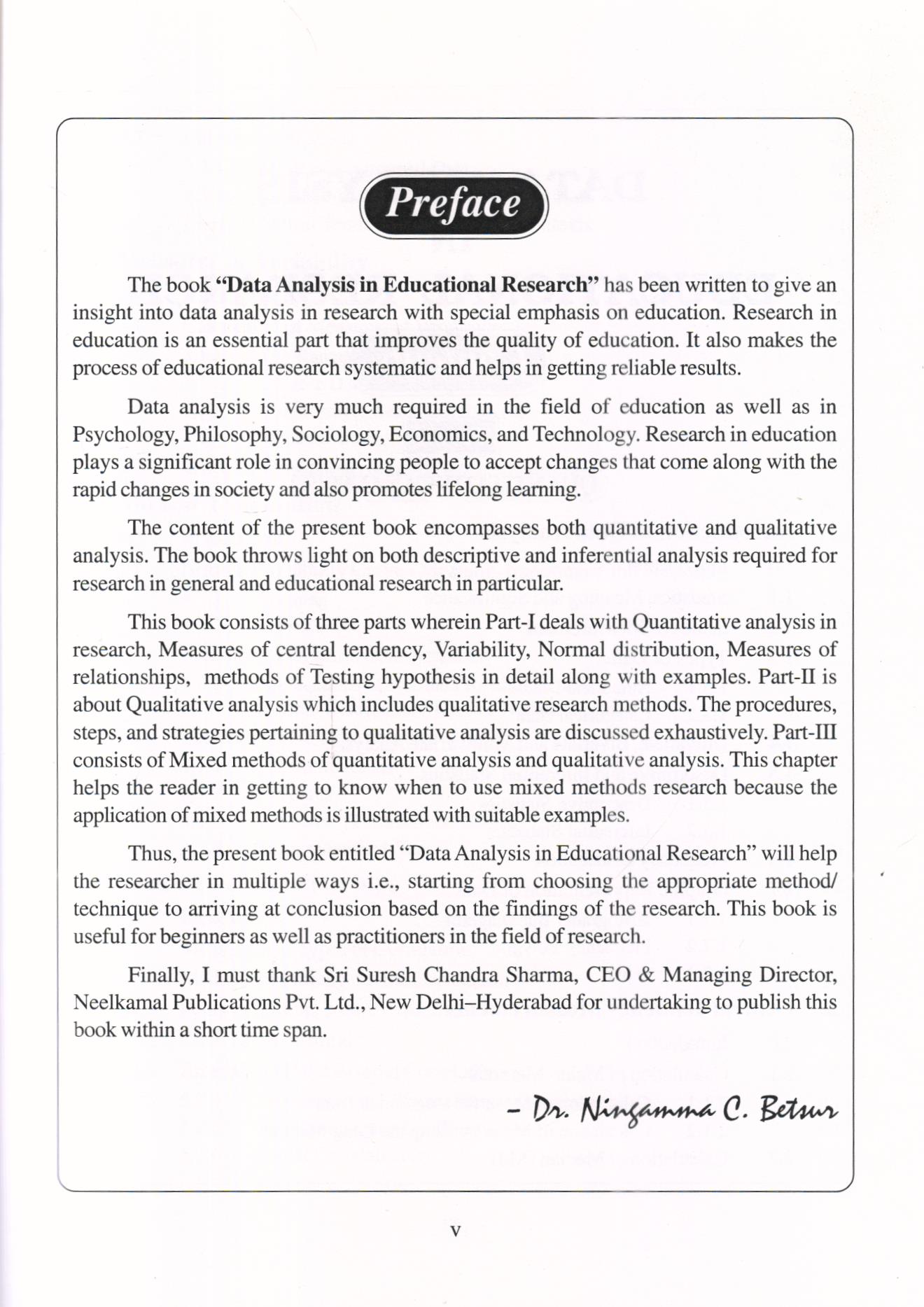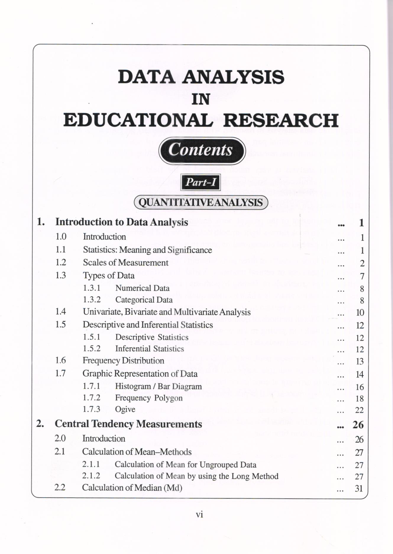 Research is being used progressively more for making decisions, policies and programmes in the field of education. Thus, developing new knowledge suitable to the Indian context has now gained paramount importance. An attempt in this direction is made in the book “Data Analysis In Educational Research”. It is a comprehensive coverage of data analysis in educational research. The programmes of M.Ed., M.A in education, Ph.D. course work and M. Phil. programmes of various universities try to provide research knowledge and skills to research students. The present book has comprehensive knowledge of Data analysis in research which caters to the needs of Ph.D. programmes and post graduate students. The book has been organised into three parts. Part-1 deals with Qualitative analysis, Part II is about Qualitative analysis and Part-III consists of Mixed- Qualitative analysis and Quantitative analysis.