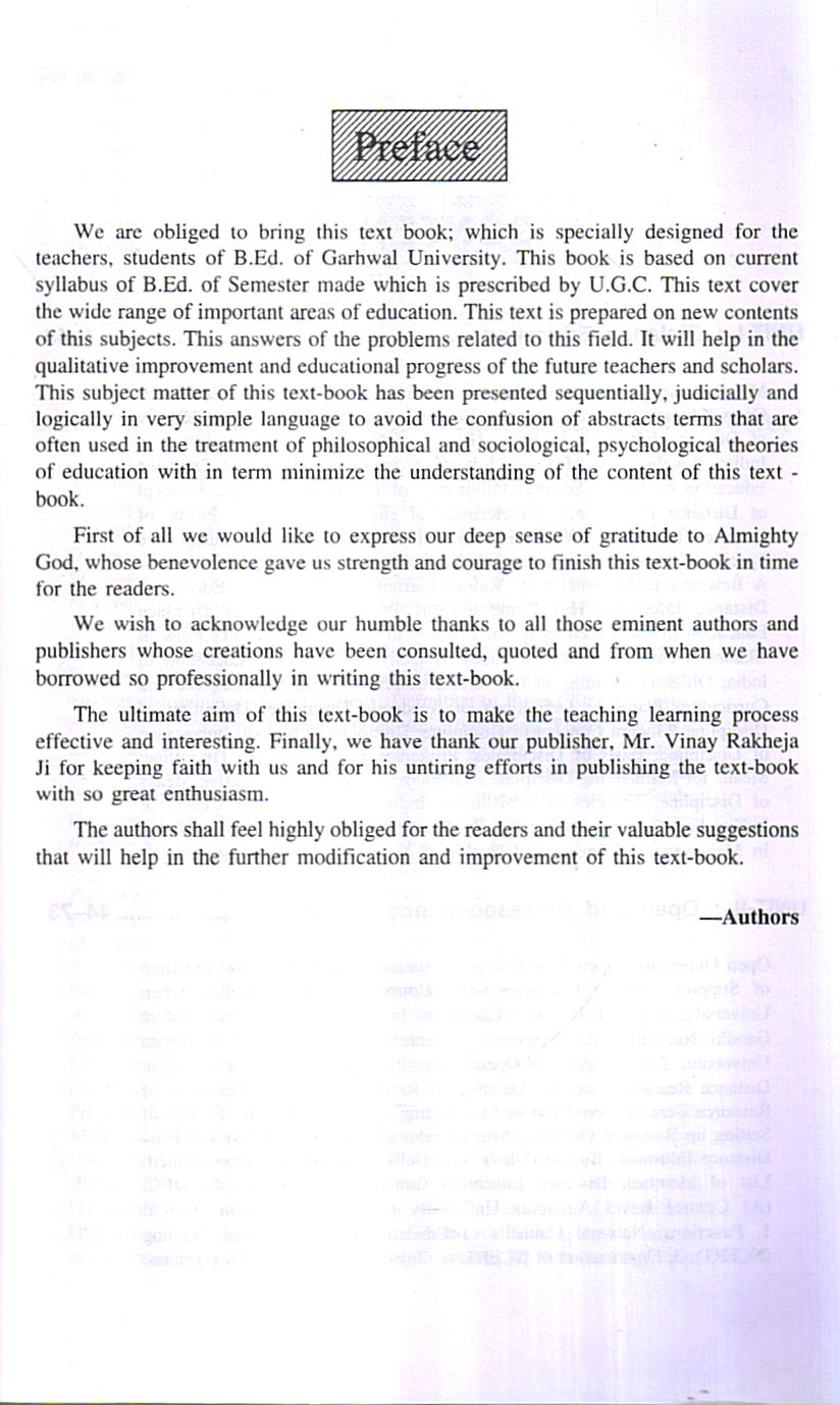 We are obliged to bring this text book; which is specially designed for the teachers, students of B.Ed. of Garhwal University. This book is based on current syllabus of B.Ed. of Semester made which is prescribed by U.G.C. This text cover the wide range of important areas of education. This text is prepared on new contents of this subjects. This answers of the problems related to this field. It will help in the qualitative improvement and educational progress of the future teachers and scholars. This subject matter of this text-book has been presented sequentially, judicially and logically in very simple language to avoid the confusion of abstracts terms that are often used in the treatment of philosophical and sociological, psychological theories of education with in term minimize the understanding of the content of this text book.