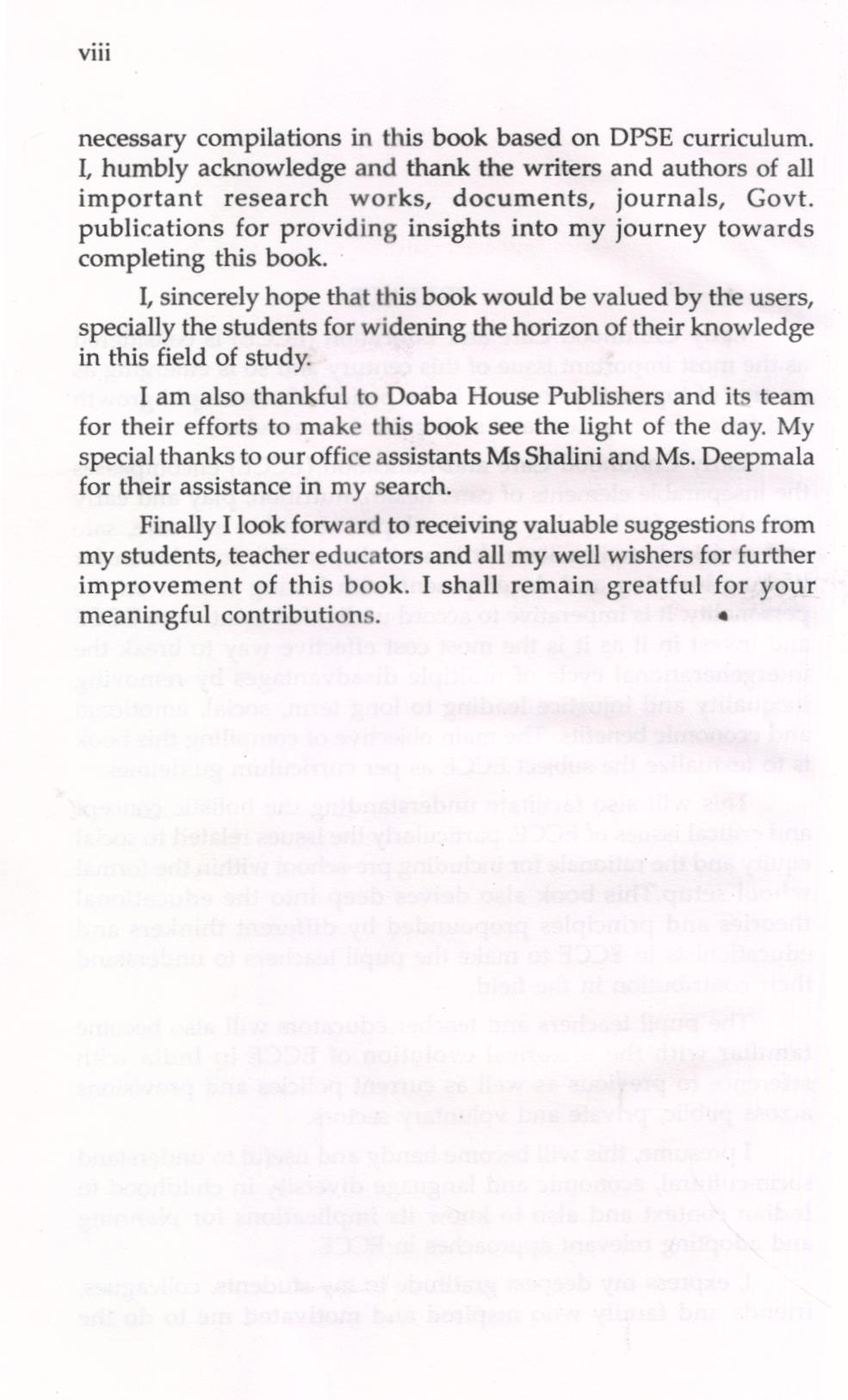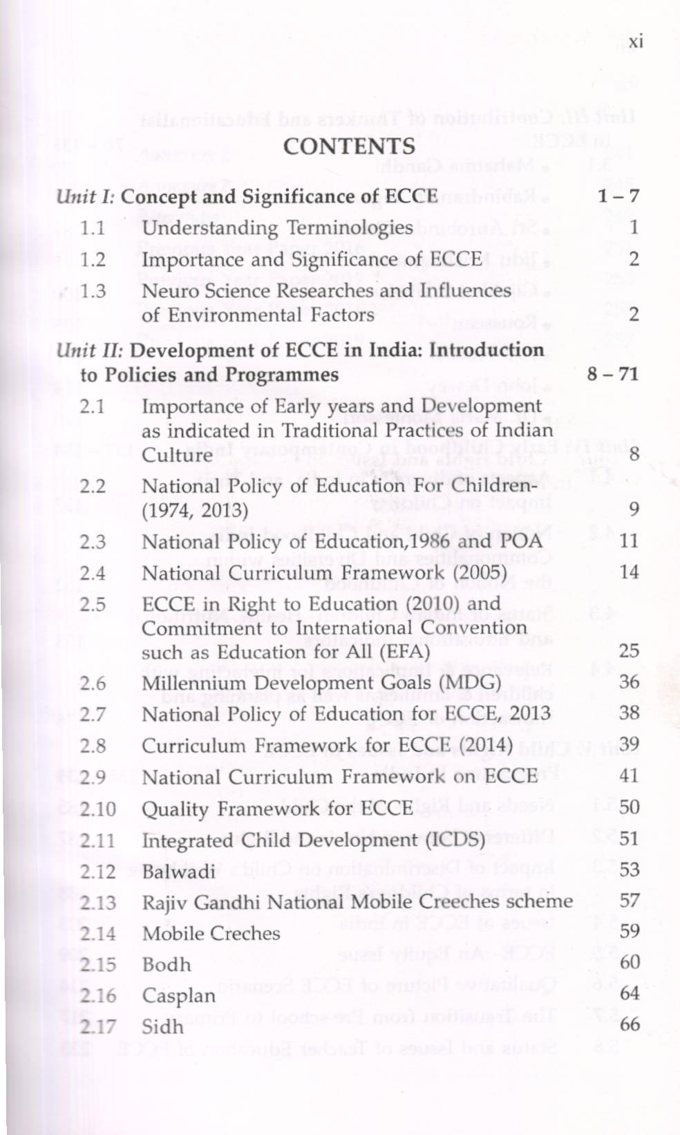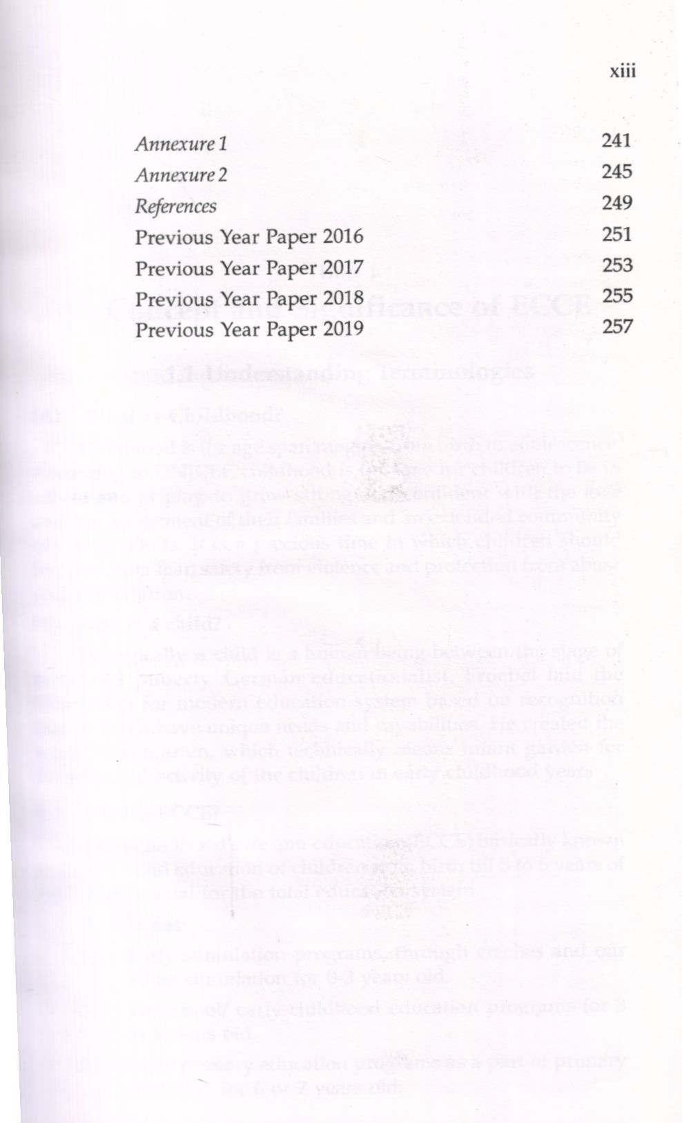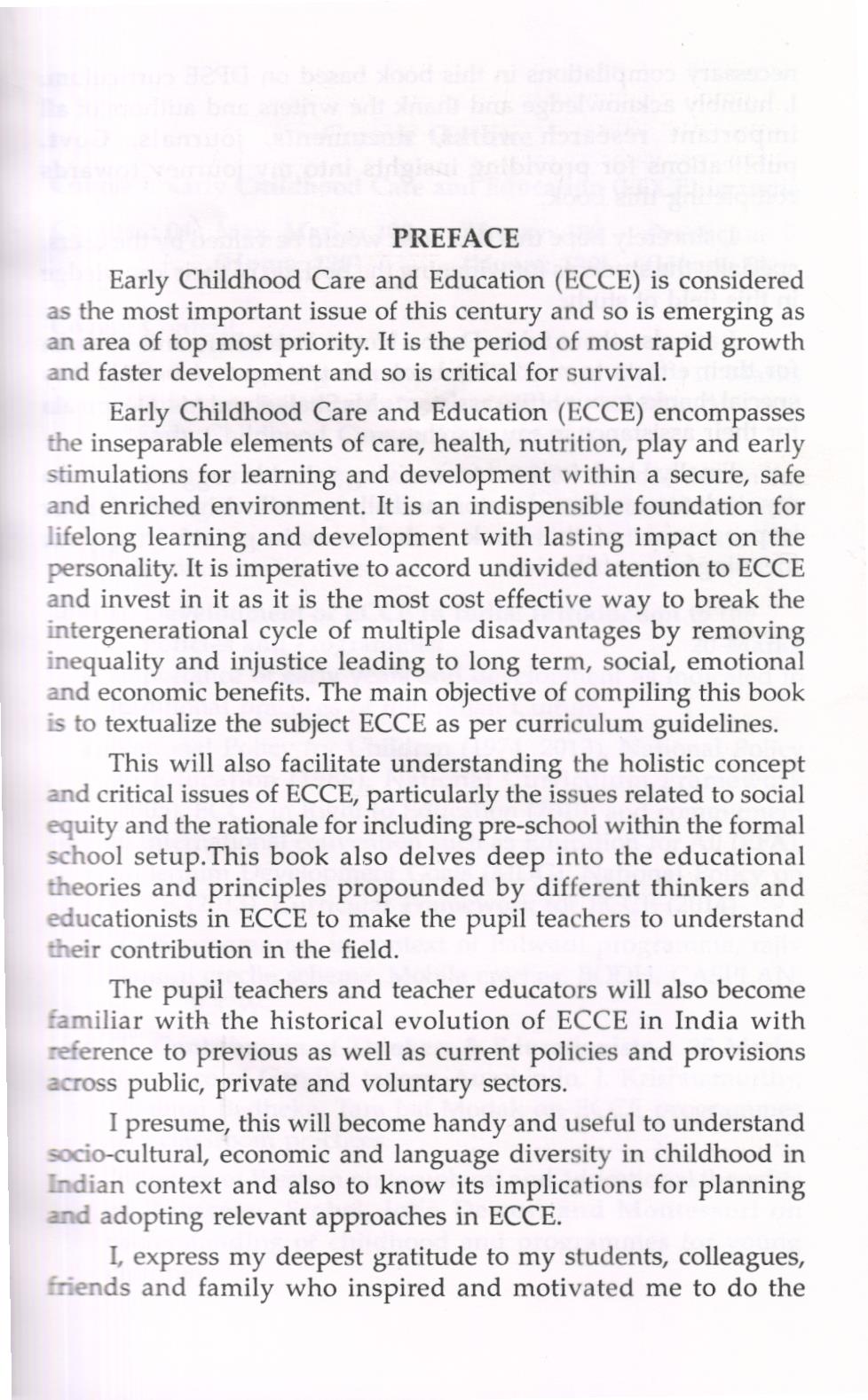Early Childhood Care and Education (ECCE) encompasses the inseparable elements of care, health, nutrition, play and early stimulation for learning and development within a secure, safe and enriched environment. It is an indispensable foundation for lifelong learning and development with a lasting impact on the personality. It is imperative to accord undivided attention to ECCE and invest in it as it is the most cost-effective way to break the intergenerational cycle of multiple disadvantages by removing inequality and injustice leading to long-term, social, emotional and economic benefits. The main objective of compiling this book is to textualize the subject of ECCE as per curriculum guidelines.