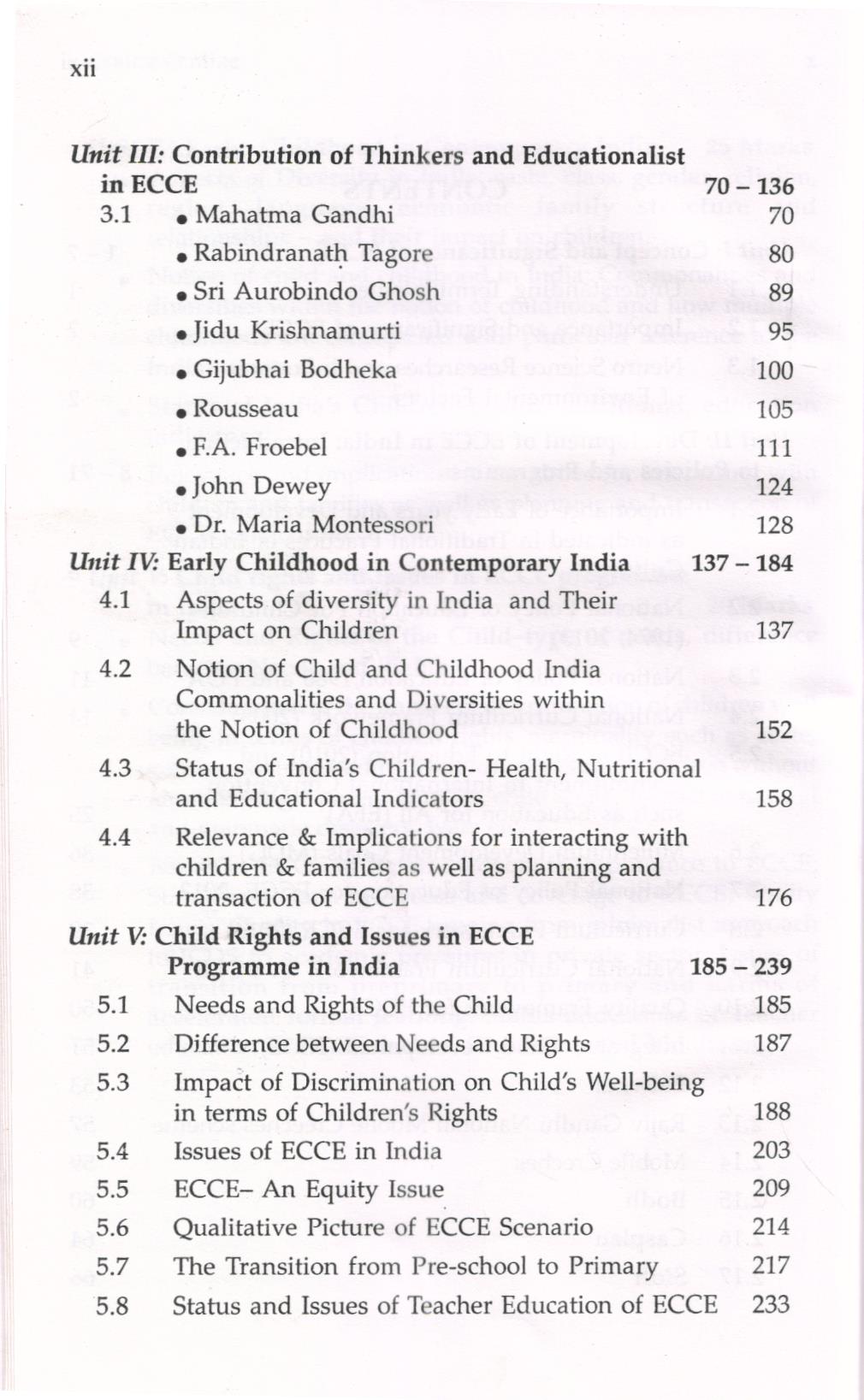 This will also facilitate understanding the holistic concept and critical issues of ECCE, particularly the issues related to social equity and the rationale for including preschool within the formal school setup. This book also delves deep into the educational theories and principles propounded by different thinkers and educationists in ECCE to make the pupil teachers to understand their contribution in the field.