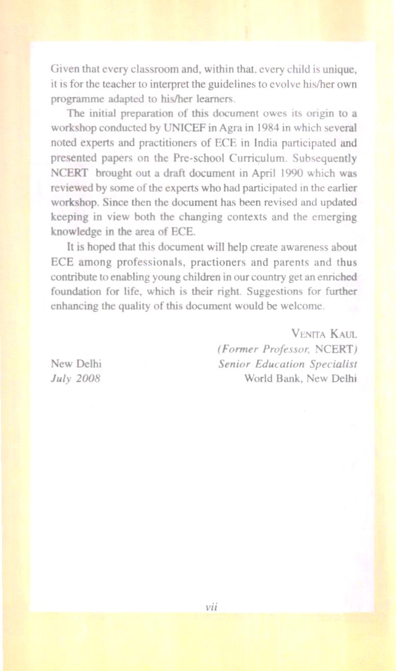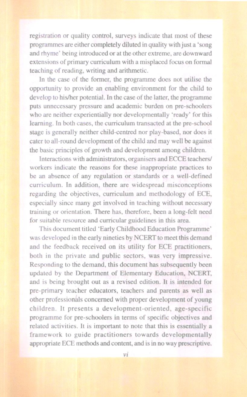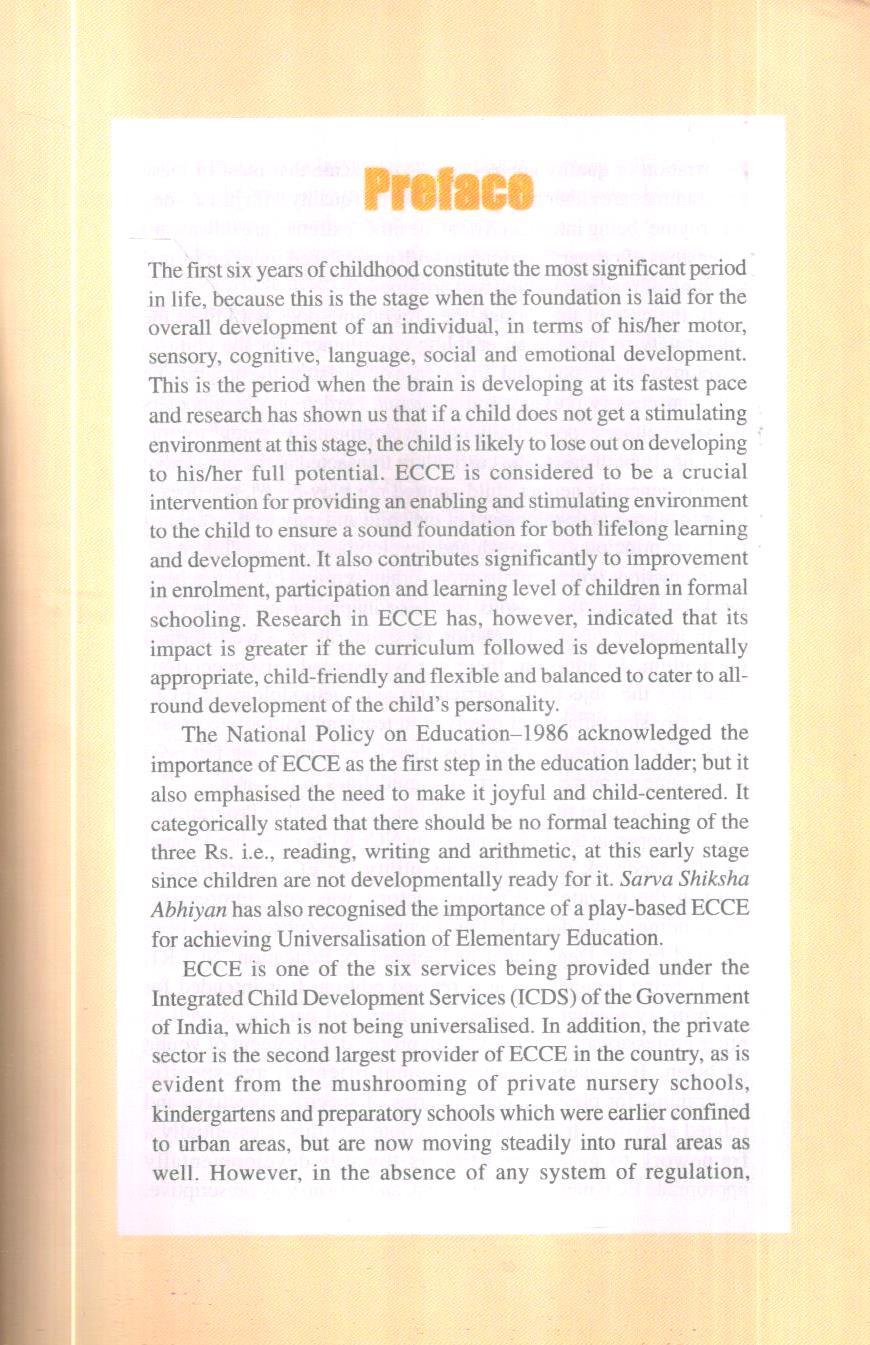 The first six years of childhood constitute the most significant period in life, because this is the stage when the foundation is laid for the overall development of an individual, in terms of his/her motor, sensory, cognitive, language, social and emotional development. This is the period when the brain is developing at its fastest pace and research has shown us that if a child does not get a stimulating environment at this stage, the child is likely to lose out on developing to his/her full potential. ECCE is considered to be a crucial intervention for providing an enabling and stimulating environment to the child to ensure a sound foundation for both lifelong learning and development. It also contributes significantly to improvement in enrolment, participation and learning level of children in formal schooling. Research in ECCE has, however, indicated that its impact is greater if the curriculum followed is developmentally appropriate, child-friendly and flexible and balanced to cater to all- round development of the child’s personality.