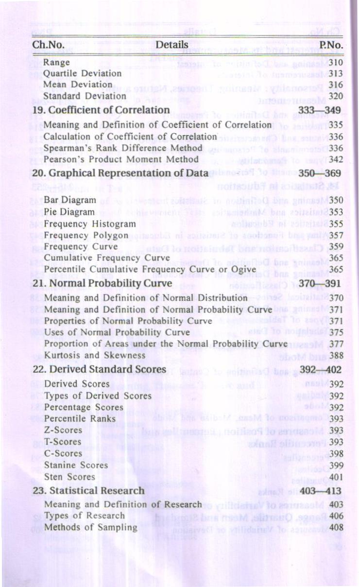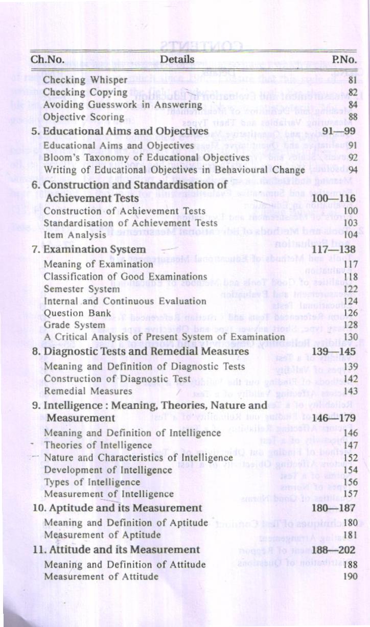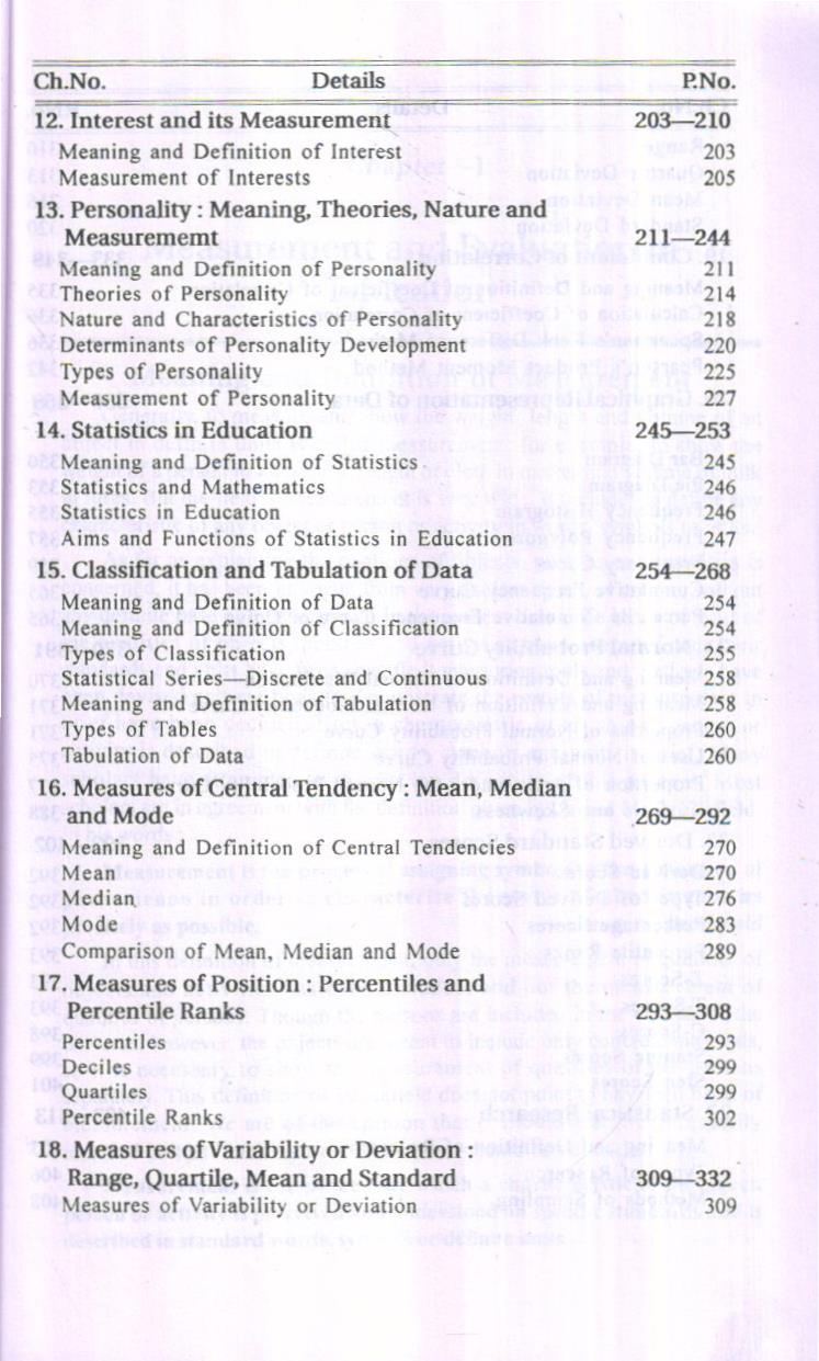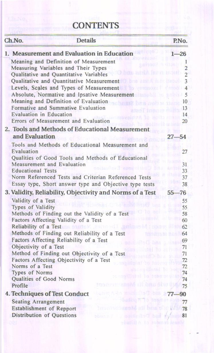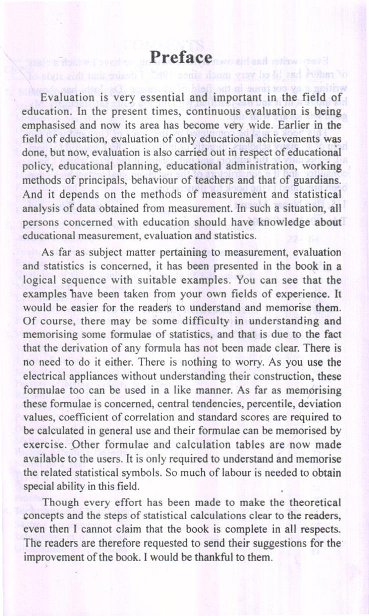 As far as subject matter pertaining to measurement, evaluation and statistics is concerned, it has been presented in the book in a logical sequence with suitable examples. You can see that the examples have been taken from your own fields of experience. It would be easier for the readers to understand and memorise them. Of course, there may be some difficulty in understanding and memorising some formulae of statistics, and that is due to the fact that the derivation of any formula has not been made clear. There is no need to do it either. There is nothing to worry. As you use the electrical appliances without understanding their construction, these formulae too can be used in a like manner. As far as memorising these formulae is concerned, central tendencies, percentile, deviation values, coefficient of correlation and standard scores are required to be calculated in general use and their formulae can be memorised by exercise. Other formulae and calculation tables are now made available to the users. It is only required to understand and memorise the related statistical symbols. So much of labour is needed to obtain special ability in this field.
