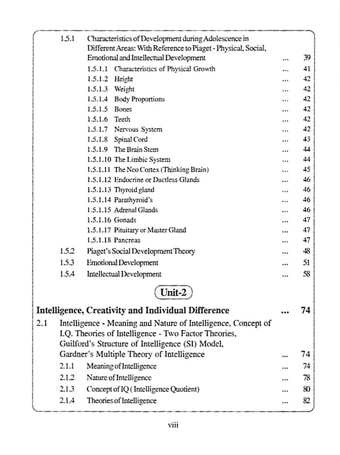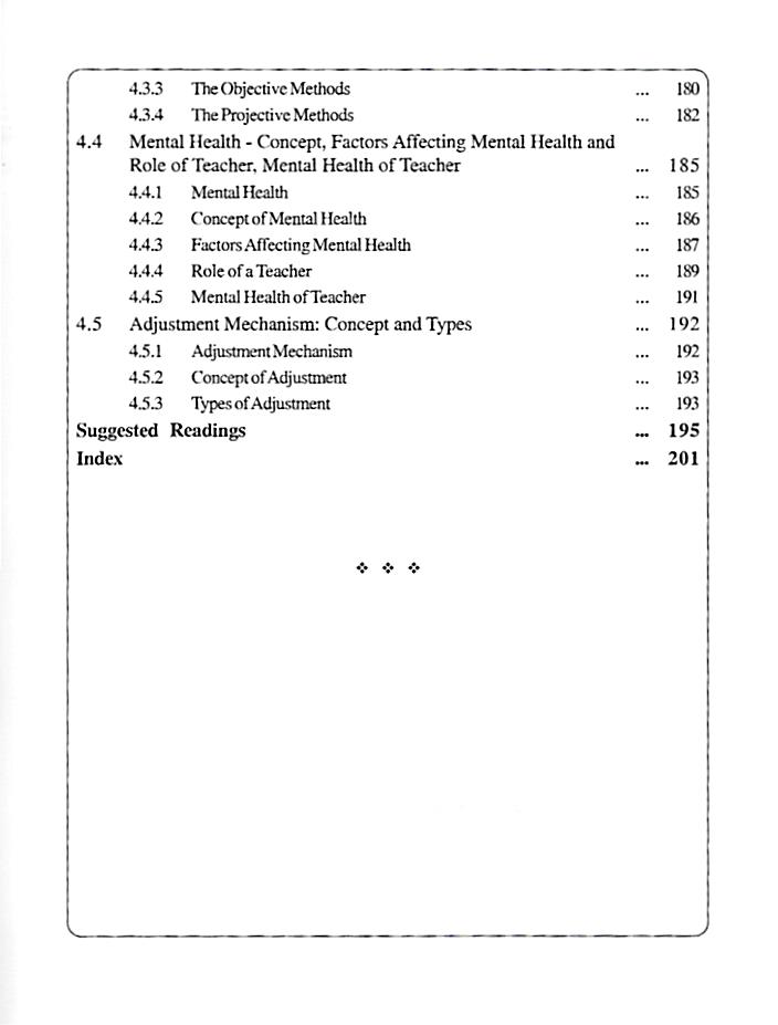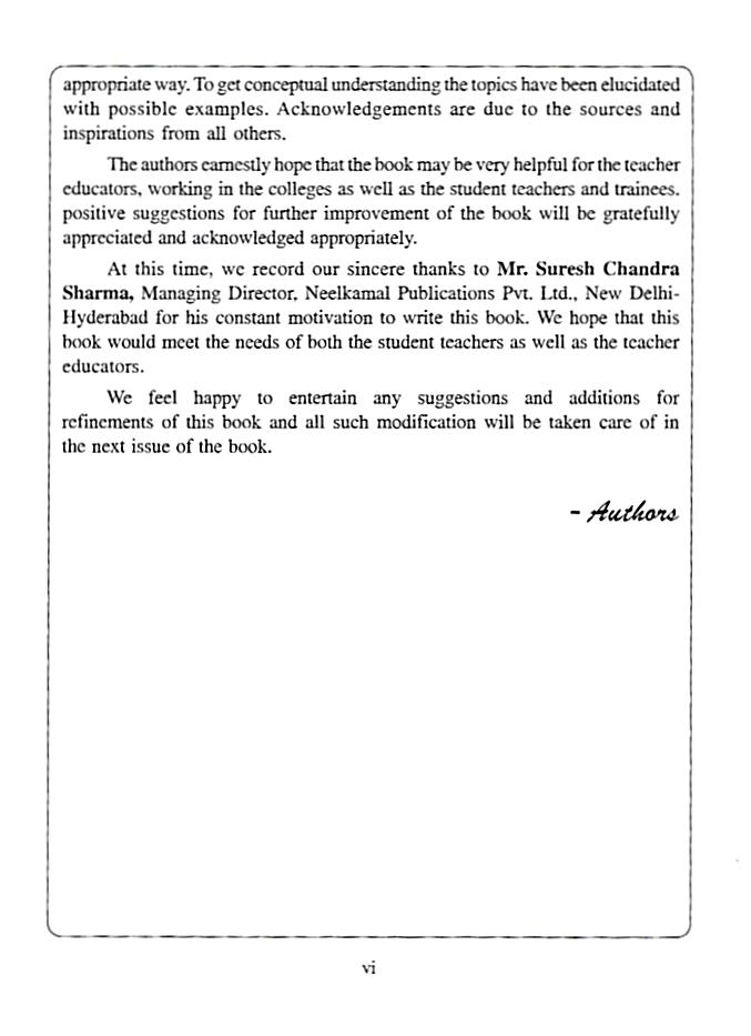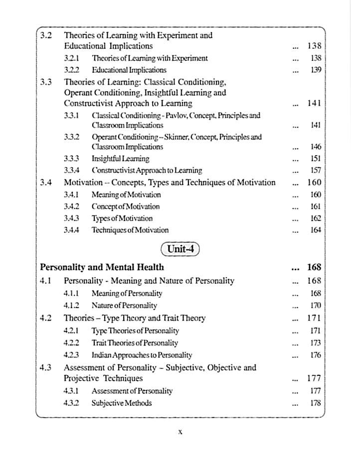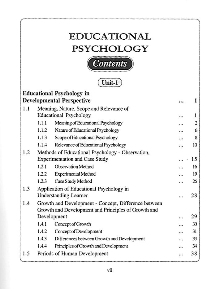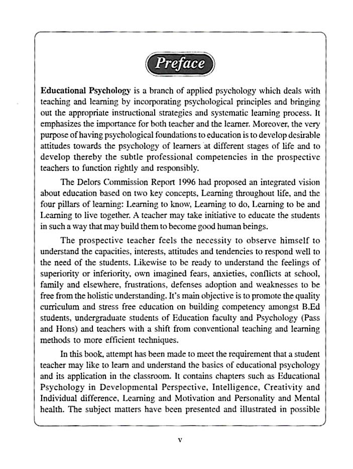 The book “Educational Psychology” is designed to meet the requirements of the students as well as teachers of the B.Ed course, students of education faculty and psychology at undergraduate level. It scans the necessary course topics to meet the challenges for success. It is to comprehend the concepts and theories in a lucid way. It helps the teachers and students to understand childhood and adolescents from their social, emotional and intellectual perspective. The development perspectives, intelligence, creativity and individual differences, learning and motivation, personality and mental health are incorporated with required information. As per the NCTE new guidelines attempt has been made to explain the basic concepts and principles. It is expected to be user friendly for the students and teachers to perceive and enable them, underlying principles in the classroom situations.