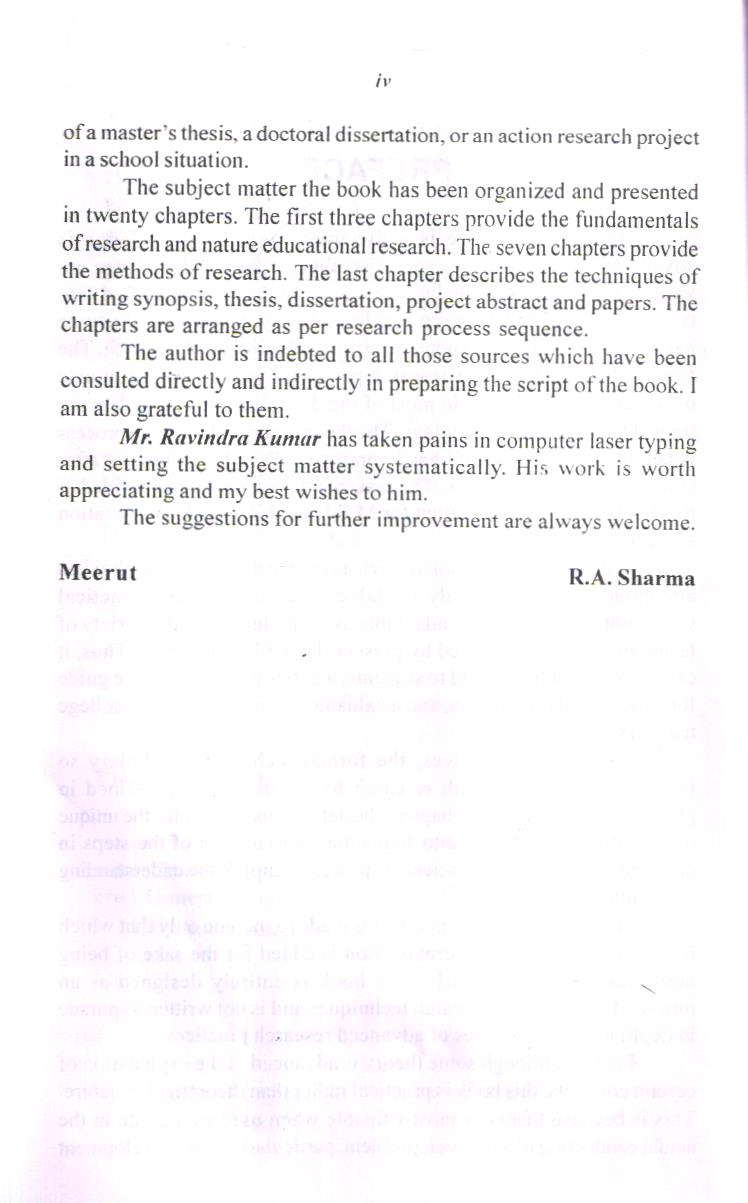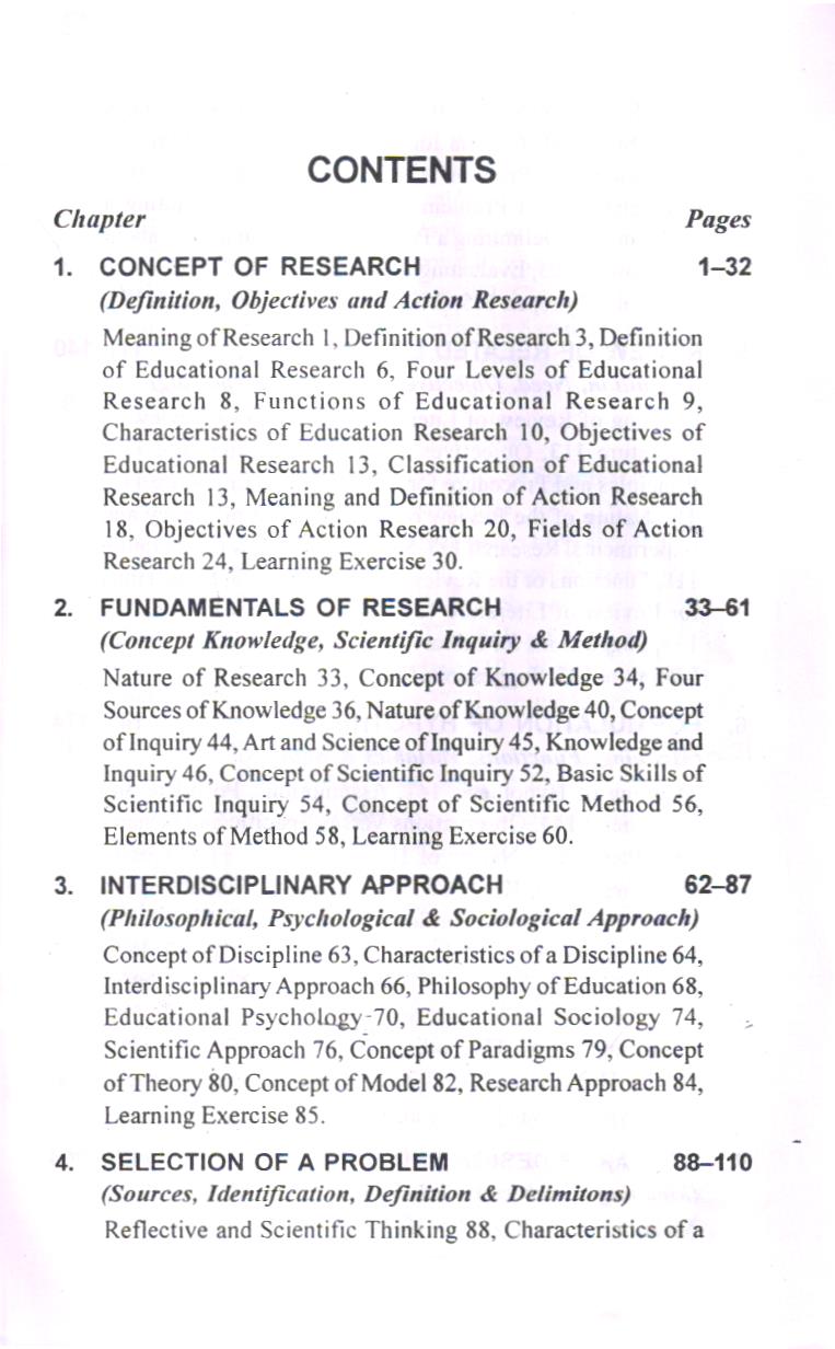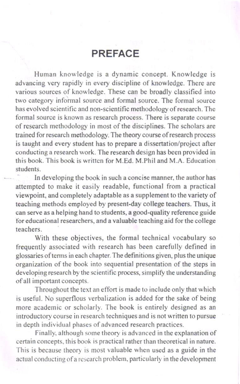 Human knowledge is a dynamic concept. Knowledge is advancing very rapidly in every discipline of knowledge. There are various sources of knowledge. These can be broadly classified into two category informal source and formal source. The formal source has evolved scientific and non-scientific methodology of research. The formal source is known as research process. There is separate course of research methodology in most of the disciplines. The scholars are trained for research methodology. The theory course of research process is taught and every student has to prepare a dissertation/project after conducting a research work. The research design has been provided in this book. This book is written for M.Ed. M.Phil and M.A. Education students.