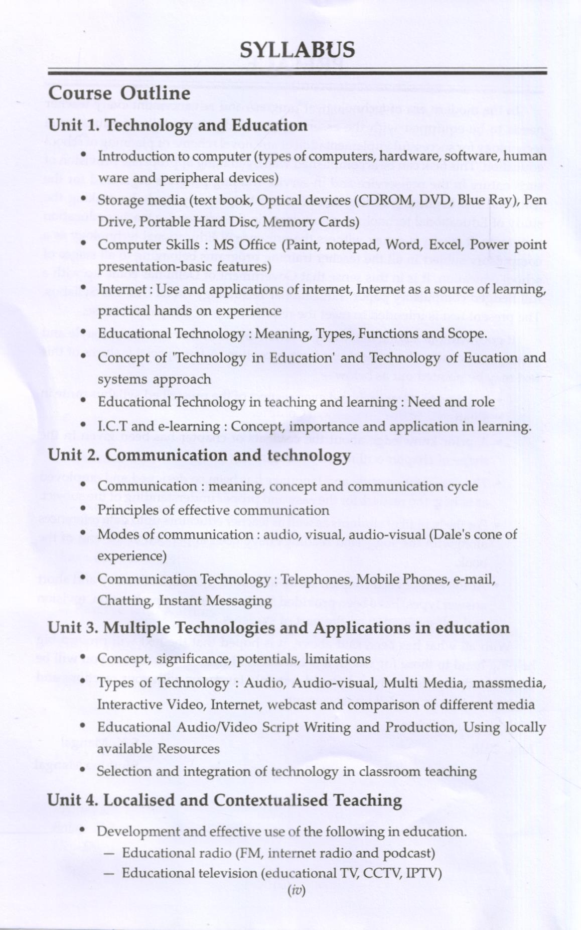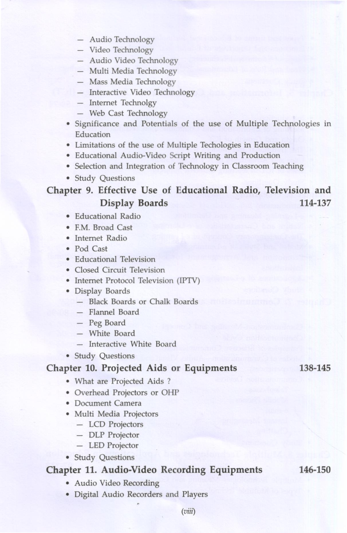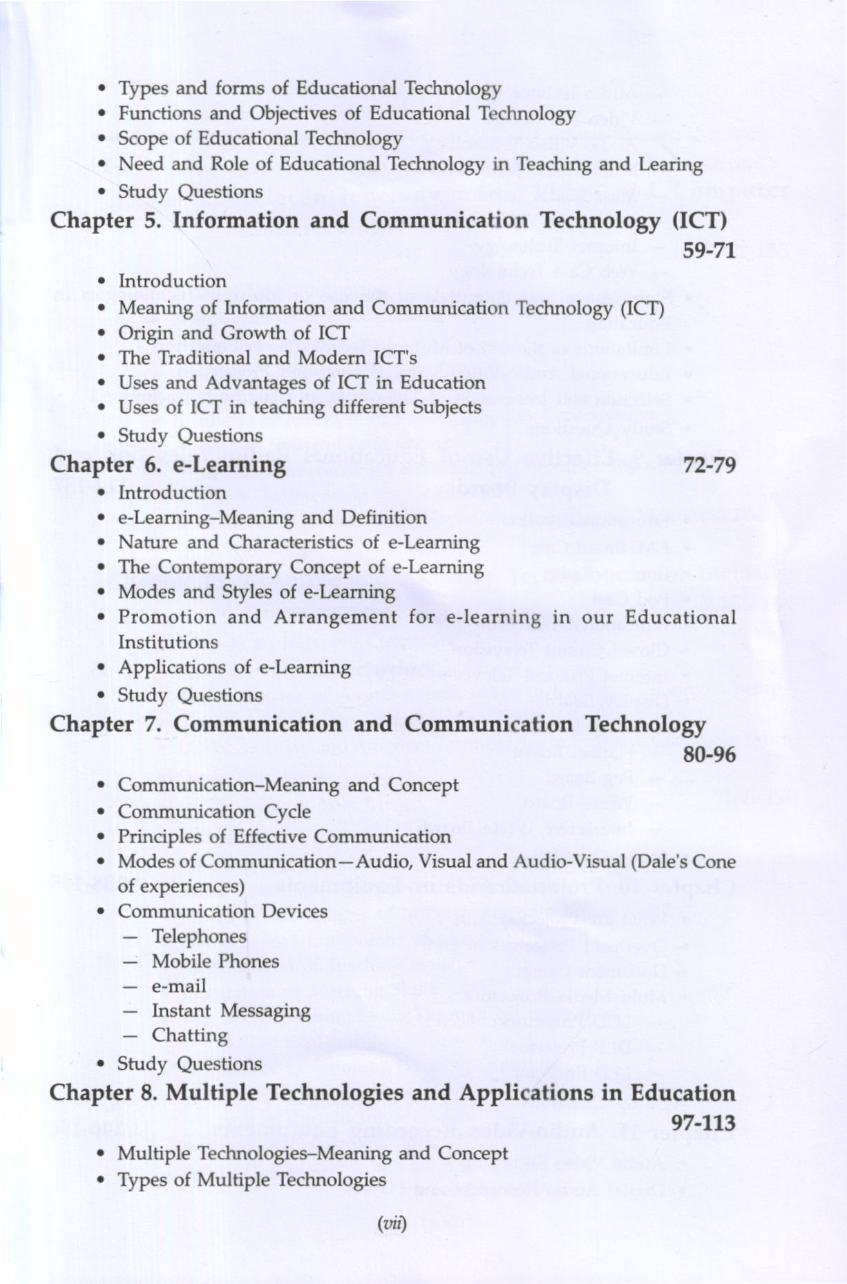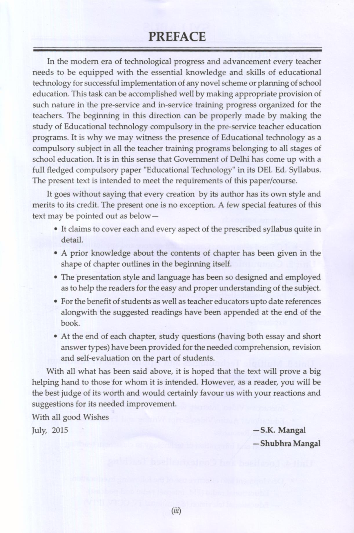 In the modern era of technological progress and advancement every teacher needs to be equipped with the essential knowledge and skills of educational technology for successful implementation of any novel scheme or planning of school education. This task can be accomplished well by making appropriate provision of such nature in the pre-service and in-service training progress organized for the teachers. The beginning in this direction can be properly made by making the study of Educational technology compulsory in the pre-service teacher education programs. It is why we may witness the presence of Educational technology as a compulsory subject in all the teacher training programs belonging to all stages of school education. It is in this sense that Government of Delhi has come up with a full fledged compulsory paper “Educational Technology” in its DEI. Ed. Syllabus. The present text is intended to meet the requirements of this paper/course.