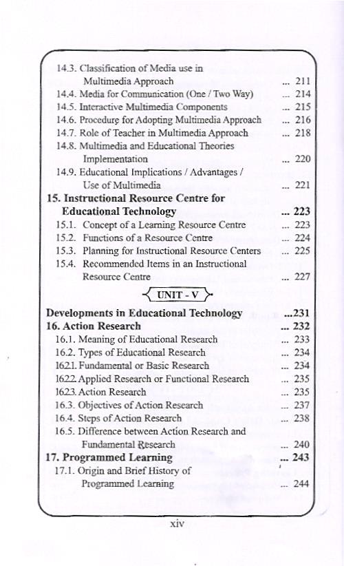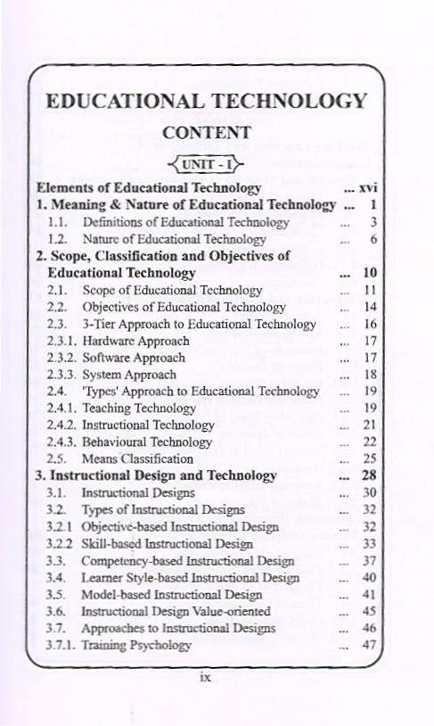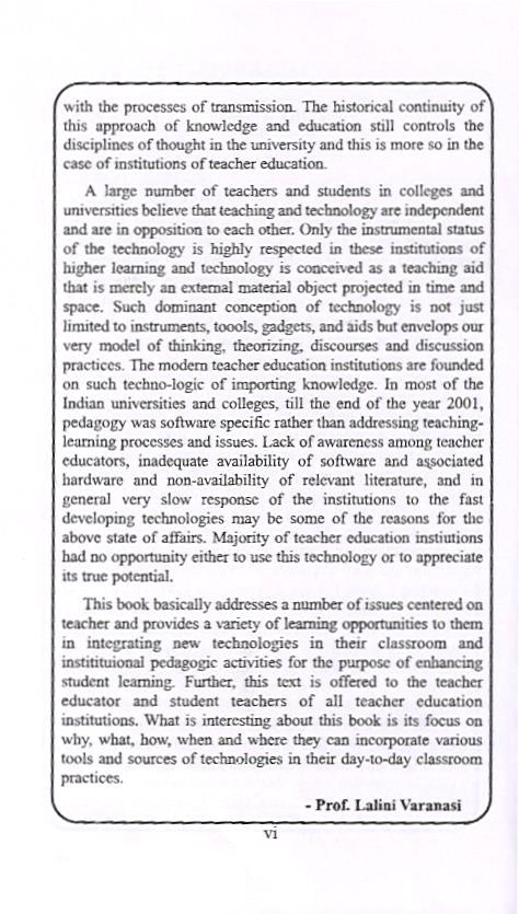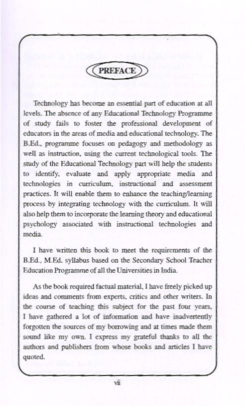 This book “Educational Technology” is written to meet the requirements of the new B.Ed. syllabus based on the Common Core Curriculum for the Secondary School Teacher Education Programme of all the Universities in India. The B.Ed. programme focuses on pedagogy and methodology as well as instruction, using the current technological tools. The study of Educational Technology will help the students to identify, evaluate and apply appropriate media and technologies in the curriculum, besides instructional and assessment practices. It will enable them to enhance the teaching/learning process by integrating technology with the curriculum. It will also help them to incorporate the learning theory and educational psychology associated with instruction and media.