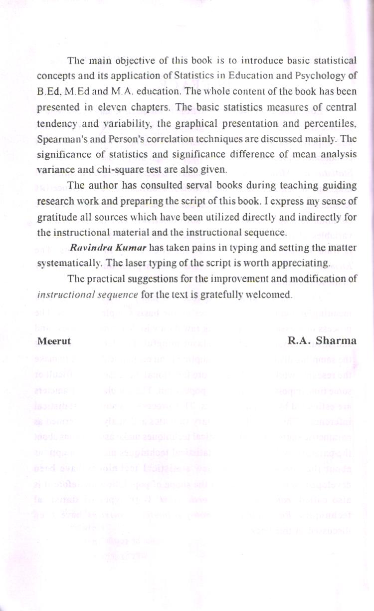 Elementary Statistics has focus to make observations or data meaningful and to draw inferences on the basis sample statistics. The process of measurement provides raw data which are meaningless and statistical analysis make these data meaningful. The data indicate about the sampling distribution. The sampling is an economical device to make the research work feasible and more functional, because it is difficult or some time impossible to measure population. The population parameters are estimated by sample statistics. This process is known as statistical inferences. This type of elementary statistics and analysis is termed as parametric statistics. Such statistical techniques make assumptions about the parameters. Recently new statistical techniques make assumptions about the parameters. The new statistical techniques have been developed no assumption about the shape of population, therefore it is also called ‘ranking test’ or ‘order test’ Both types of statistical techniques. Parametric and non-parametric statistics have been discussed in this book.