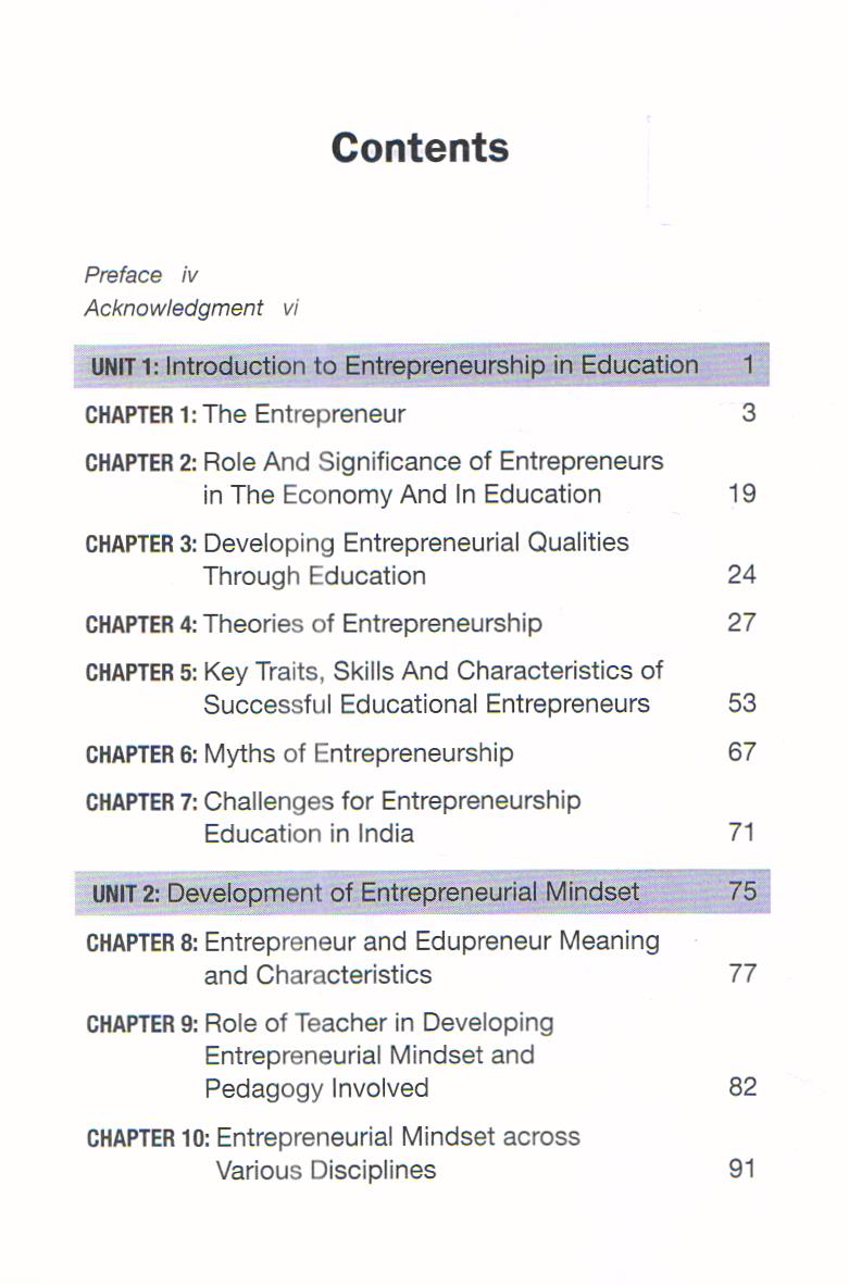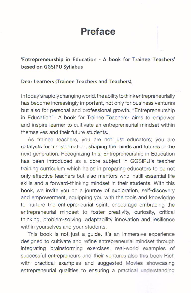 As trainee teachers, you are not just educators; you are catalysts for transformation, shaping the minds and futures of the next generation. Recognizing this, Entrepreneurship in Education has been introduced as a core subject in GGSIPU’s teacher training curriculum which helps in preparing educators to be not only effective teachers but also mentors who instill essential life skills and a forward-thinking mindset in their students. With this book, we invite you on a journey of exploration, self-discovery and empowerment, equipping you with the tools and knowledge to nurture the entrepreneurial spirit, encourage embracing the entrepreneurial mindset to foster creativity, curiosity, critical thinking, problem-solving, adaptability innovation and resilience within yourselves and your students.