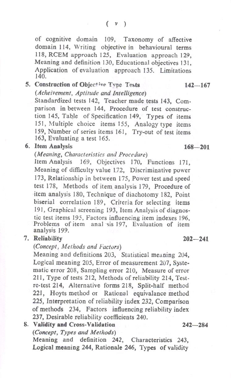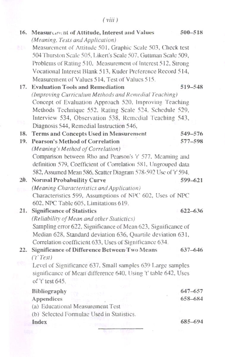 An attempt has been made in this edition to elaborate the answers of these questions. It embodies twenty two chapters. Development of Measurement, Evaluation in Education, Taxonomy of objectives, Test construction, Item analysis, Reliability, Validity, Norms, Factor analysis, Measurement of intelligence, Achievement personality, Aptitude, Creativity attitude, Interest and values, Statistics. In the eighteenth chapter terms and concepts used in measurement and evaluation have been explained in brief. The selected formula used in measurement have been appended.