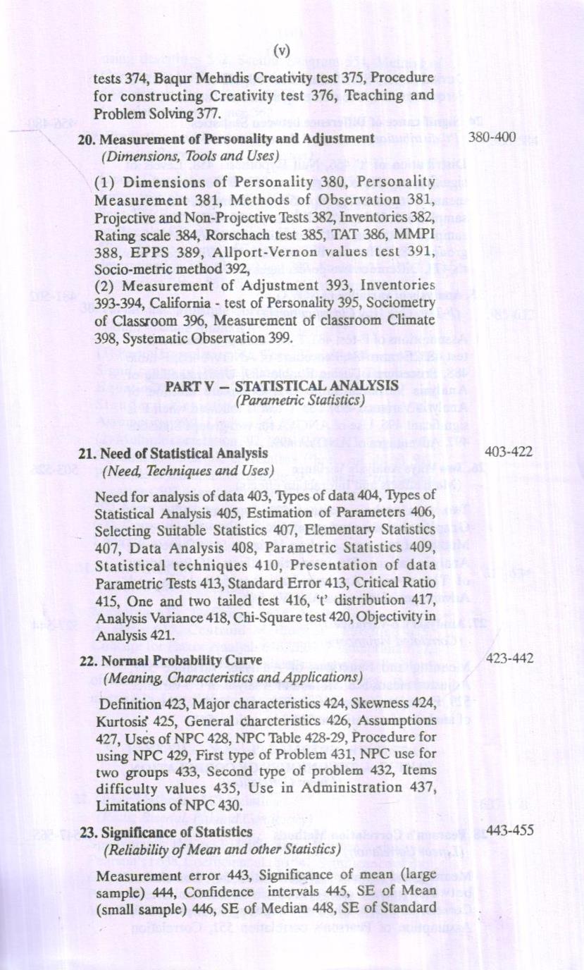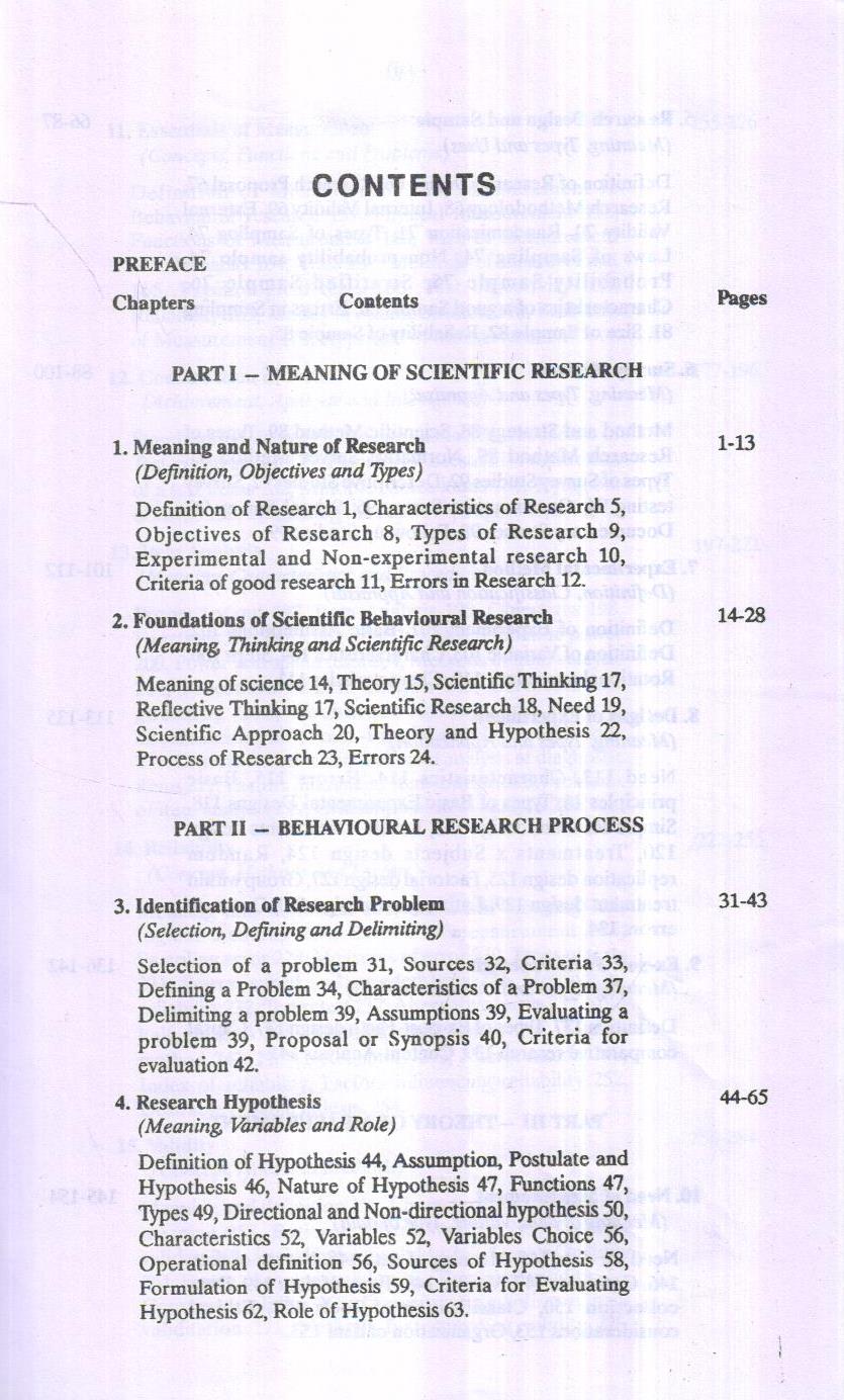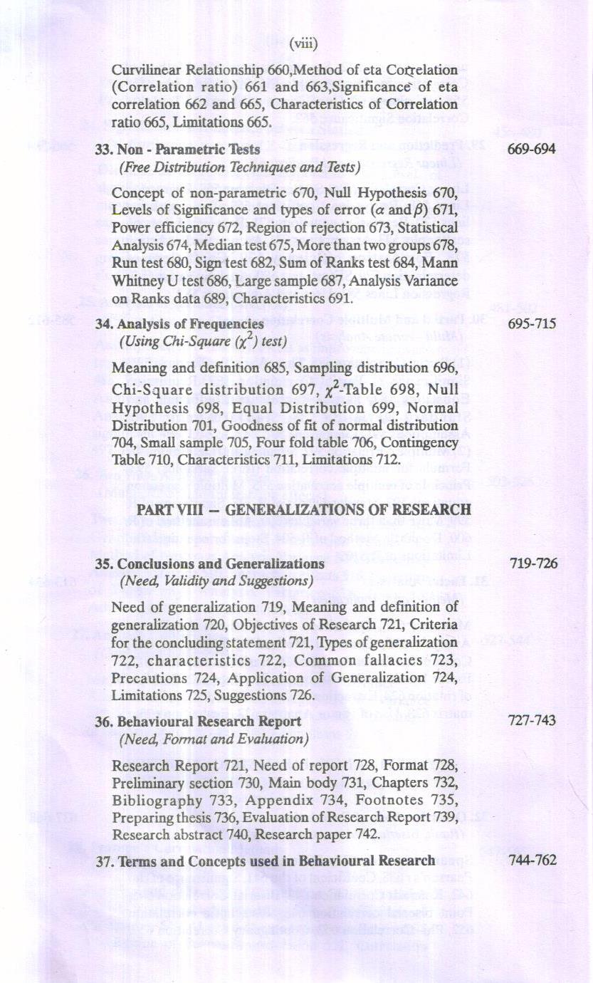 The whole content of this book has been organised into eight-parts which include thirty seven chapters. The first-part deals foundations of scientific behavioural research. The meaning of research, science, theory and scientific approach have been discussed in the first two chapters. The second-part provides process of behavioural research in seven chapters. This part deals the problem, hypothesis, sampling, experimental method and designs of experiments. The third-part inludes theory of measurement. The basic concepts of measurement construction of test, item analysis, reliability, validity norms and standardization have been discussed. The fourth part includes tools of measurement – Achievement, intelligence, Aptitude and Creativity tests Personality and Adjustment inventories. The fifth part deals statistical analysis parametric statistics : Normal probability curve ‘t’ and ‘F’ tests and anlaysis of covariance. The sixth part provides the awareness and skill of correlation method linear correlation prediction and regression, multi-variate analysis and factor analysis. The seventh part inludes non-parametric statistics other methods of correlation and analysis of frequencies. The eight part deals the generalization, research report and terms and concepts used in behavioural research.