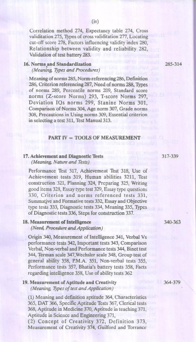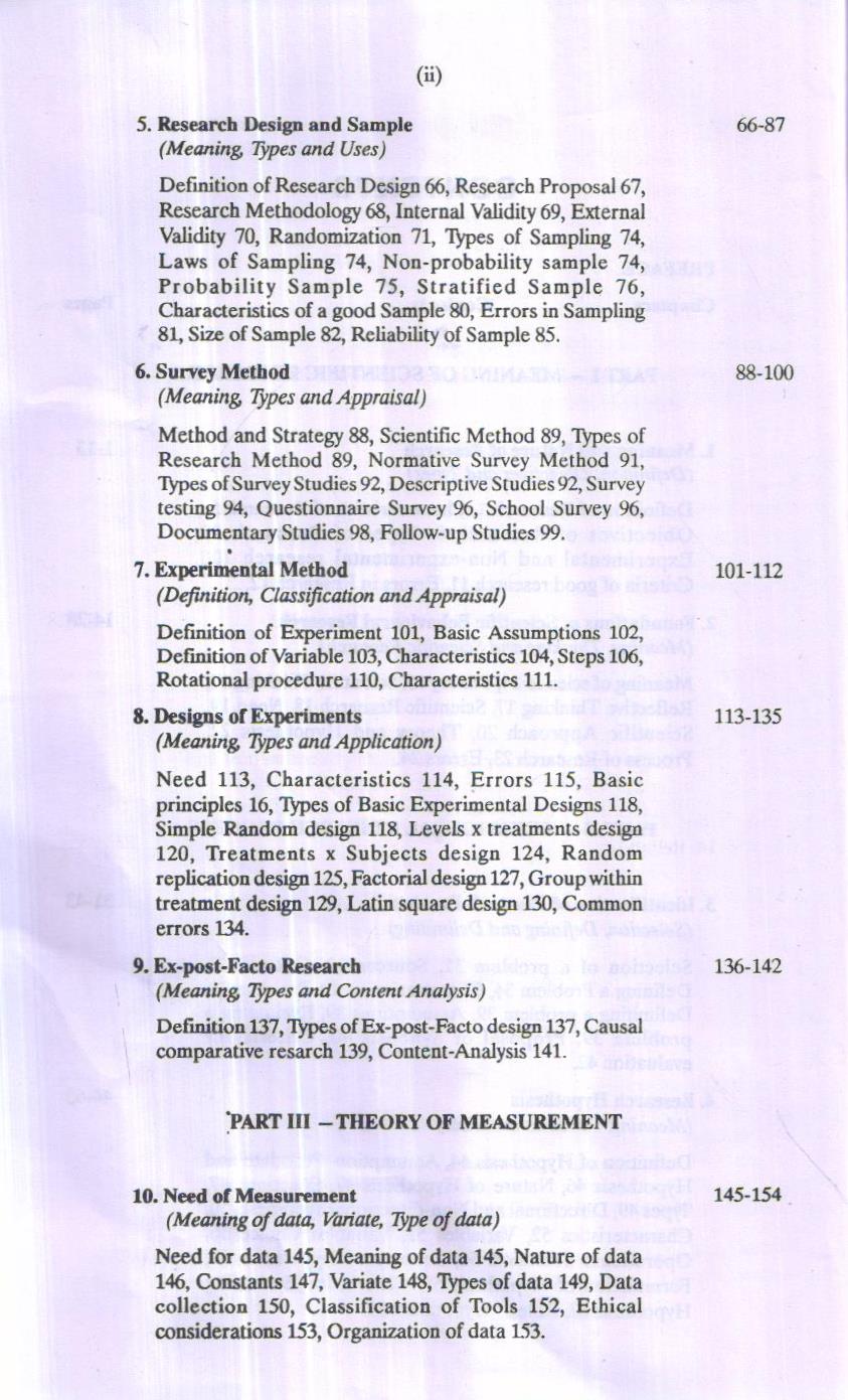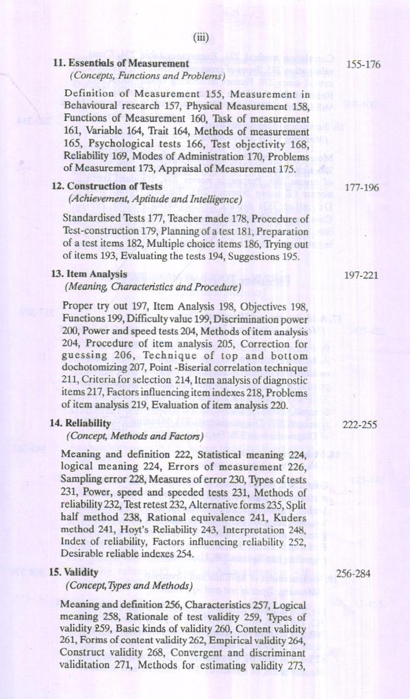 The whole content of this book has been organised into eight-parts which include thirty seven chapters. The first-part deals foundations of scientific behavioural research. The meaning of research, science, theory and scientific approach have been discussed in the first two chapters. The second-part provides process of behavioural research in seven chapters. This part deals the problem, hypothesis, sampling, experimental method and designs of experiments. The third-part inludes theory of measurement. The basic concepts of measurement construction of test, item analysis, reliability, validity norms and standardization have been discussed. The fourth part includes tools of measurement – Achievement, intelligence, Aptitude and Creativity tests Personality and Adjustment inventories. The fifth part deals statistical analysis parametric statistics : Normal probability curve ‘t’ and ‘F’ tests and anlaysis of covariance. The sixth part provides the awareness and skill of correlation method linear correlation prediction and regression, multi-variate analysis and factor analysis. The seventh part inludes non-parametric statistics other methods of correlation and analysis of frequencies. The eight part deals the generalization, research report and terms and concepts used in behavioural research.