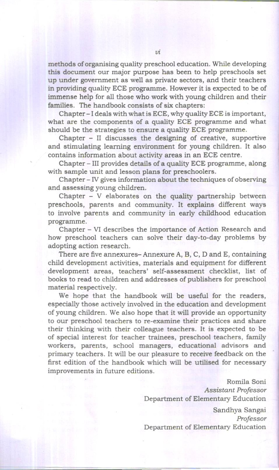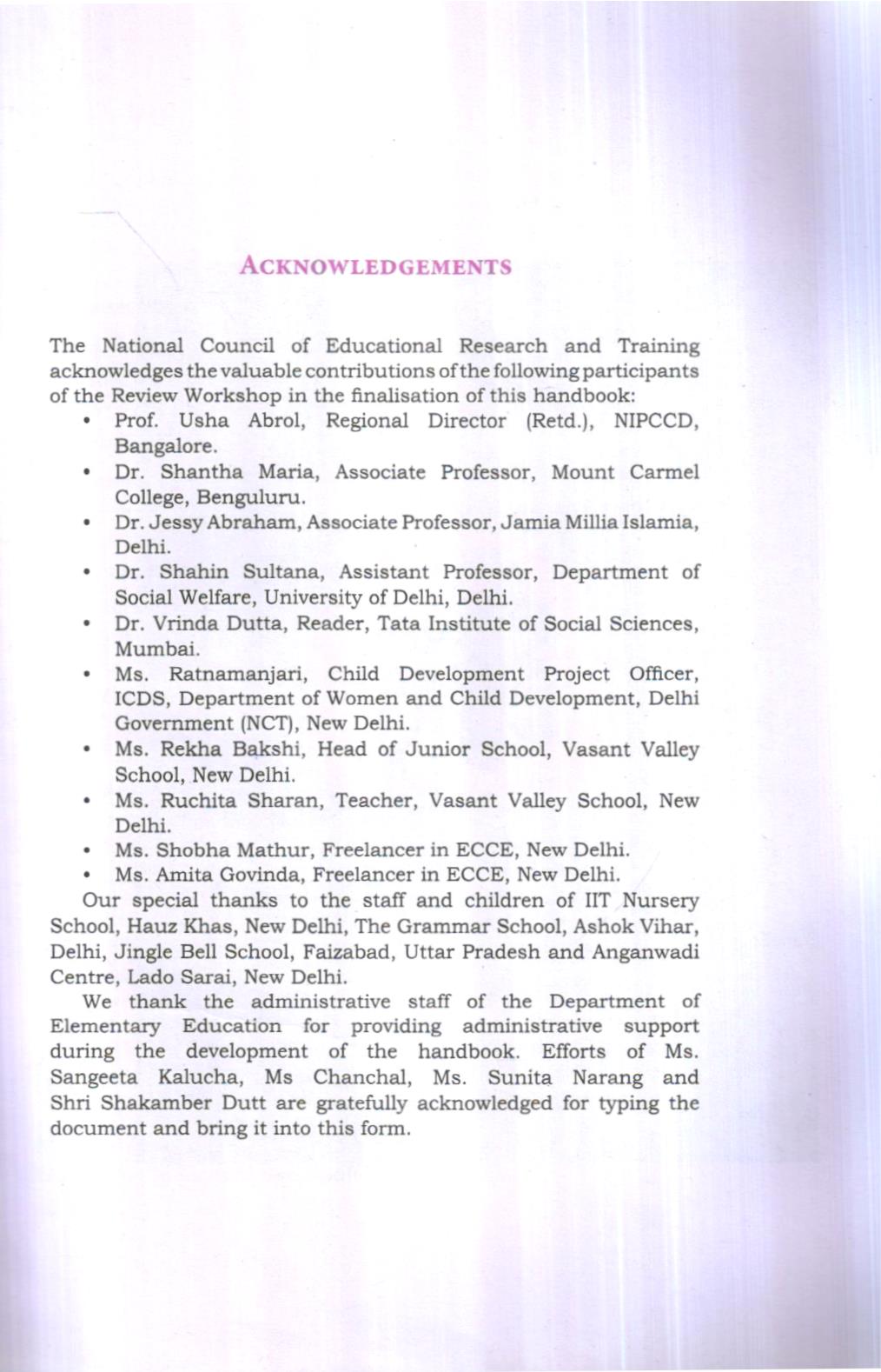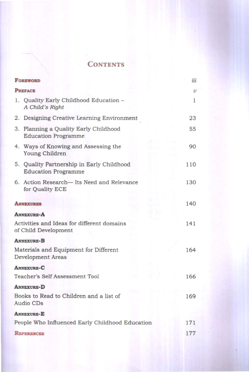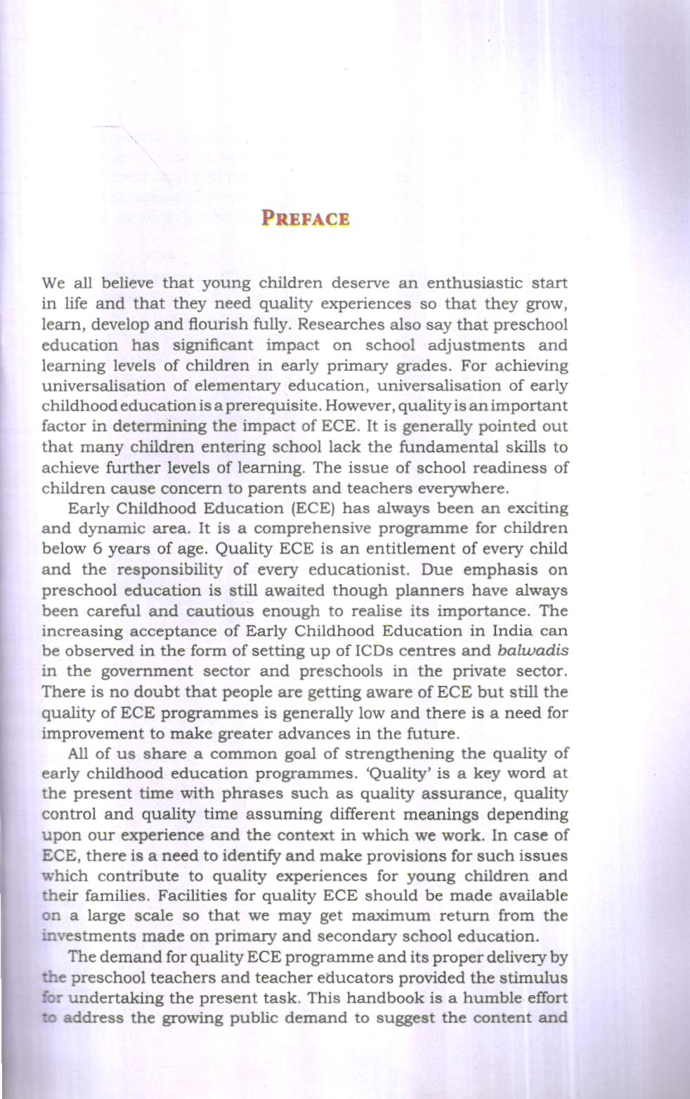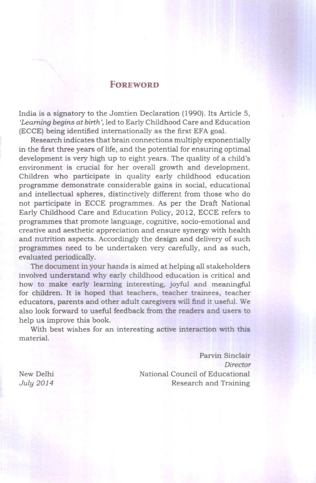 The document in your hands is aimed at helping all stakeholders involved understand why early childhood education is critical and how to make early learning interesting, joyful and meaningful for children. It is hoped that teachers, teacher trainees, teacher educators, parents and other adult caregivers will find it useful. We also look forward to useful feedback from the readers and users to help us improve this book.