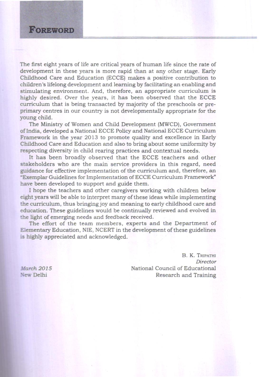 I hope the teachers and other caregivers working with children below eight years will be able to interpret many of these ideas while implementing the curriculum, thus bringing joy and meaning to early childhood care and education. These guidelines would be continually reviewed and evolved in light of emerging needs and feedback received.