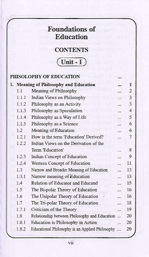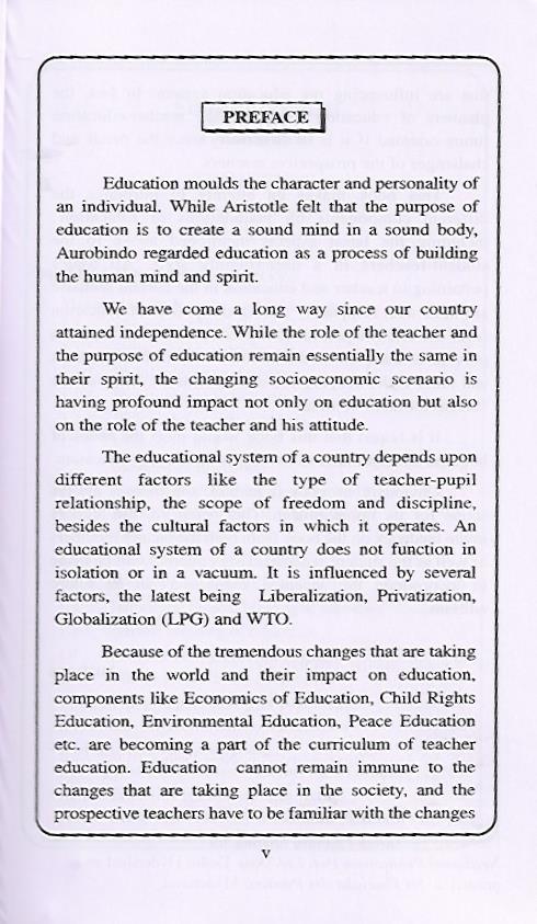 This book makes an attempt to introduce the different components ents of ‘Foundations of Education’, including the latest aspects mentioned above to the student-teachers in a user-friendly style. All topics pertaining to teacher and education in the current scenario are dealt with adequately tracing the growth of education from the ancient period. Every effort has been made to provide an adequate treatment of the topics in a coherent and lucid style, keeping the comprehension levels of the student-teachers in mind.