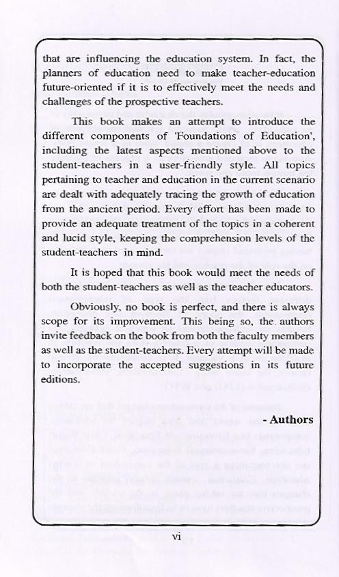 Obviously, no book is perfect, and there is always scope for its improvement. This being so, the authors invite feedback on the book from both the faculty members as well as the student-teachers. Every attempt will be made to incorporate the accepted suggestions in its future editions.