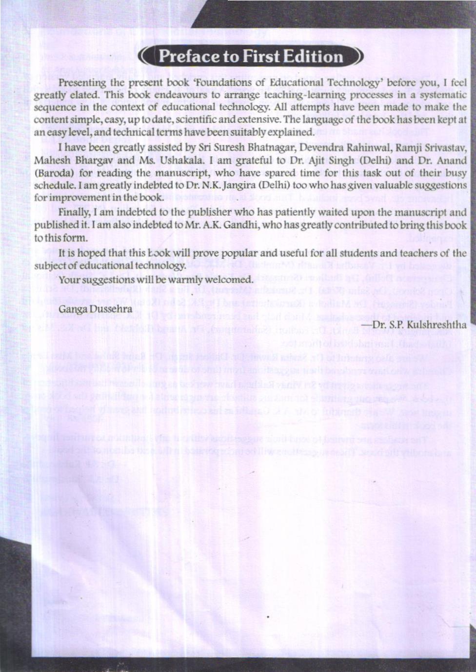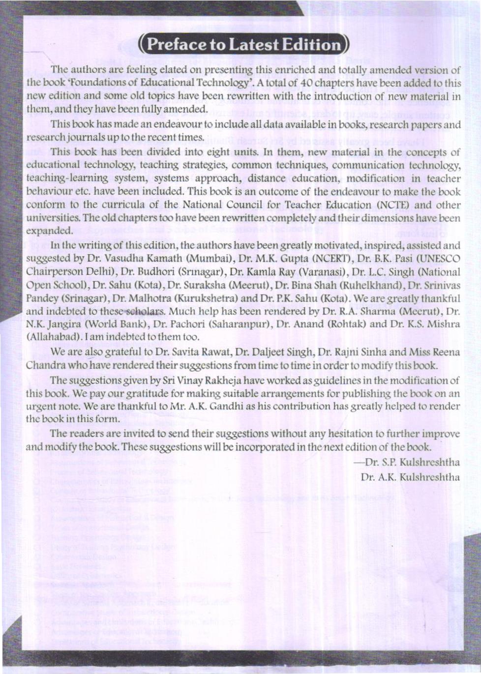 The authors are feeling clated on presenting this enriched and totally amended version of the book ‘Foundations of Educational Technology’. A total of 40 chapters have been added to this new edition and some old topics have been rewritten with the introduction of new material in them, and they have been fully amended.