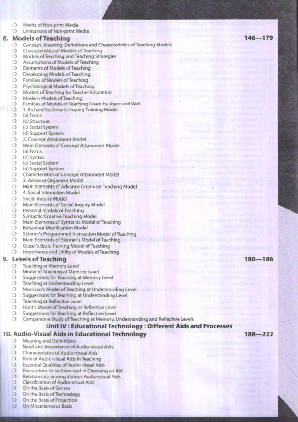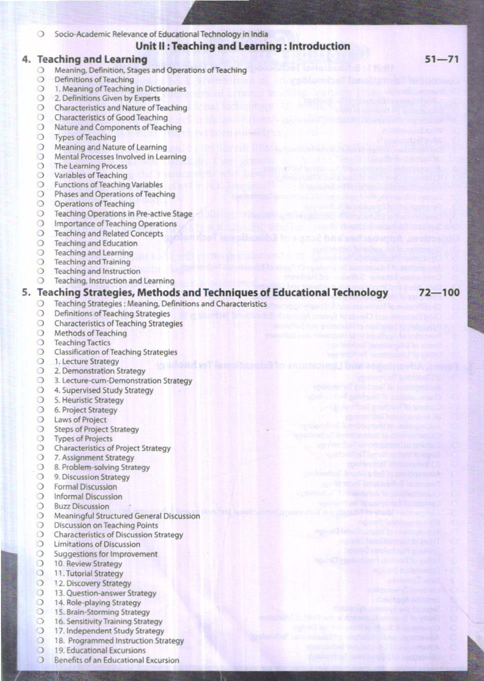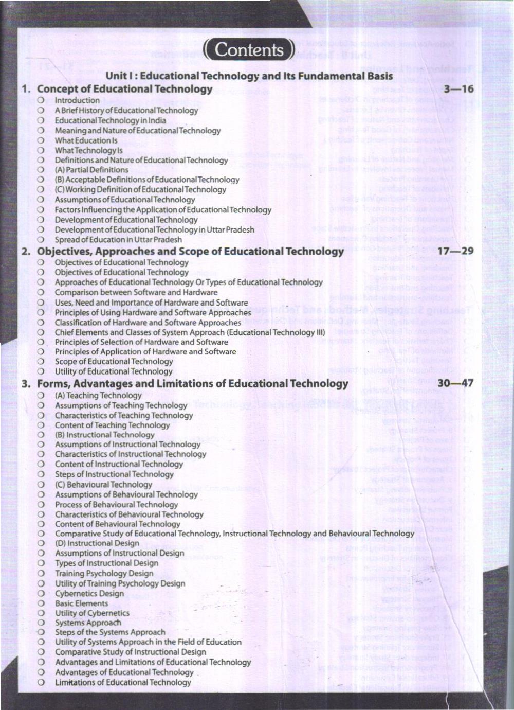 This book has been divided into eight units. In them, new material in the concepts of educational technology, teaching strategies, common techniques, communication technology, teaching-learning system, systems approach, distance education, modification in teacher behaviour etc. have been included. This book is an outcome of the endeavour to make the book conform to the curricula of the National Council for Teacher Education (NCTE) and other universities. The old chapters too have been rewritten completely and their dimensions have been expanded.