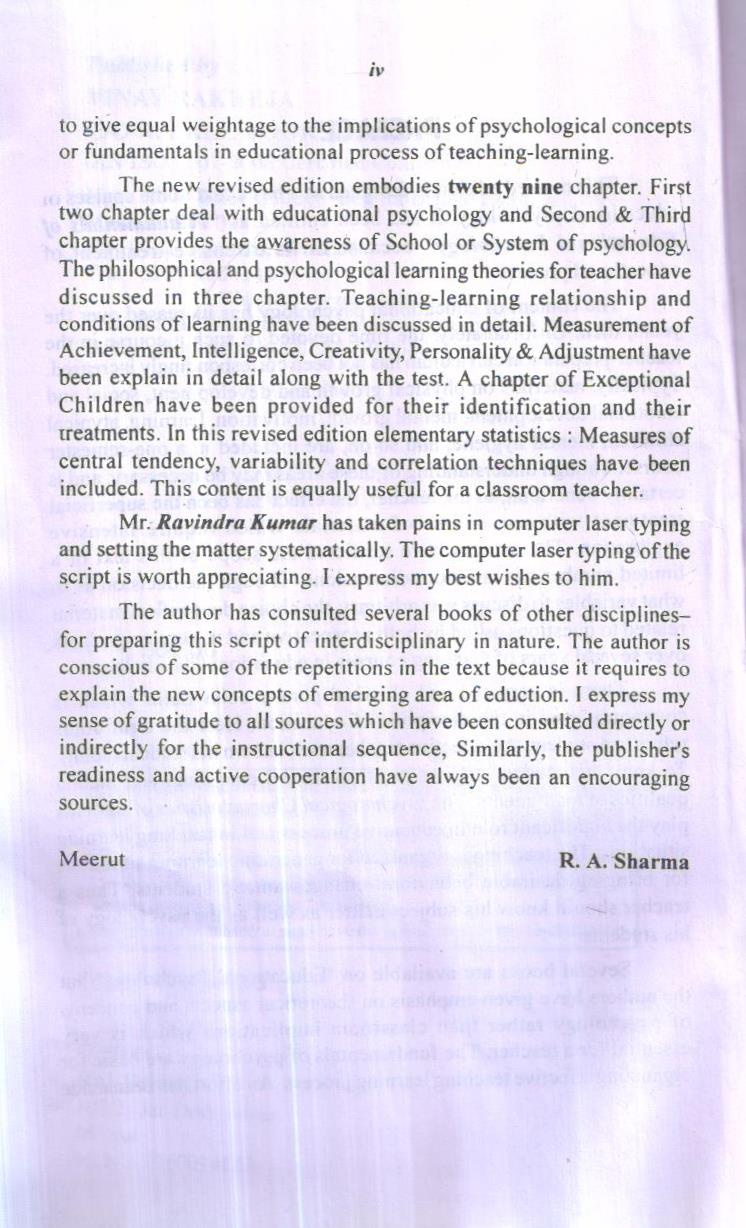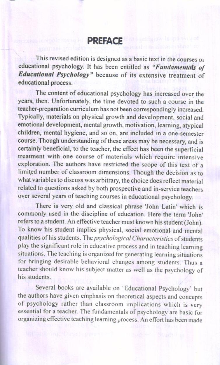 Several books are available on ‘Educational Psychology’ but the authors have given emphasis on theoretical aspects and concepts of psychology rather than classroom implications which is very essential for a teacher. The fundamentals of psychology are basic for organizing effective teaching learning process. An effort has been made