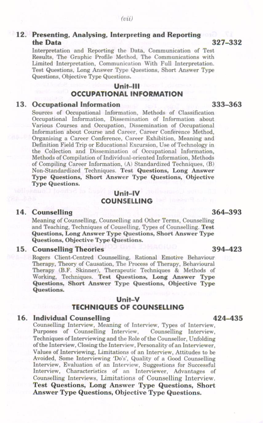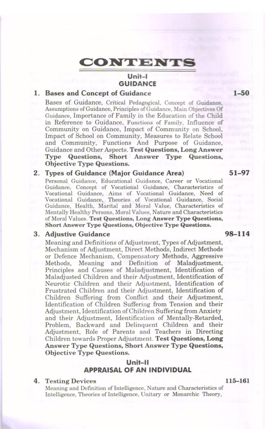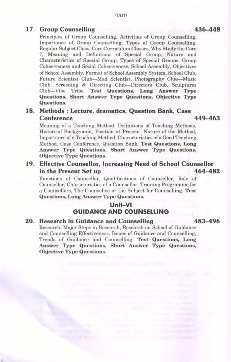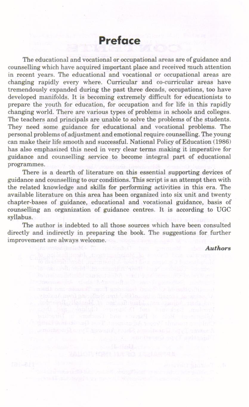 There is a dearth of literature on this essential supporting devices of guidance and counselling to our conditions. This script is an attempt then with the related knowledge and skills for performing activities in this era. The available literature on this area has been organized into six unit and twenty chapter-bases of guidance, educational and vocational guidance, basis of counselling an organization of guidance centres. It is according to UGC syllabus.