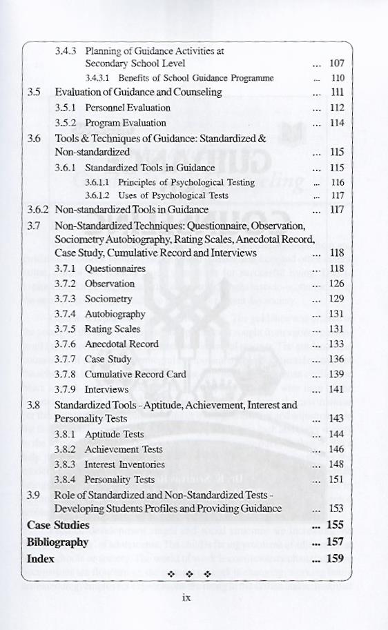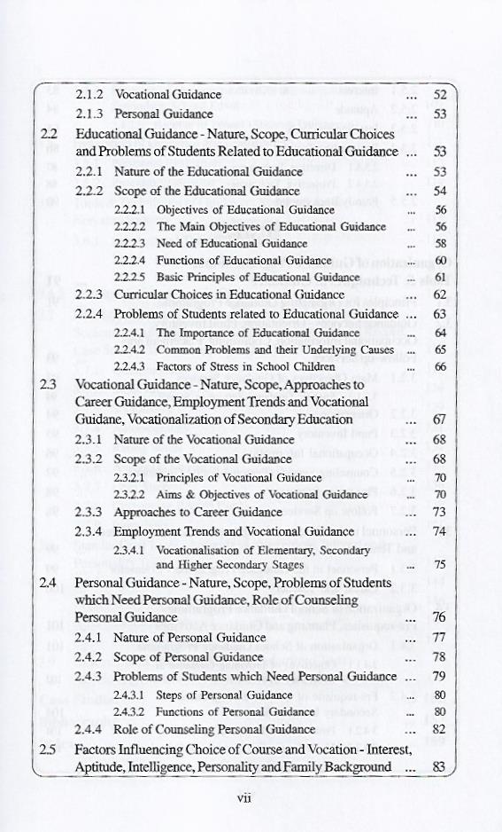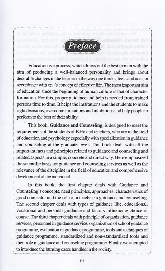 In this book, the first chapter deals with Guidance and Counseling’s concepts, need principles, approaches, characteristics of good counselor and the role of a teacher in guidance and counseling. The second chapter deals with types of guidance like, educational, vocational and personal guidance and factors influencing choice of course. The third chapter deals with principle of organization, guidance services, personnel in guidance service, organization of school guidance programme, evaluation of guidance programme, tools and techniques of guidance programme, standardized and non-standardized tools and their role in guidance and counseling programme. Finally we attempted to introduce the burning cases handled in the society.